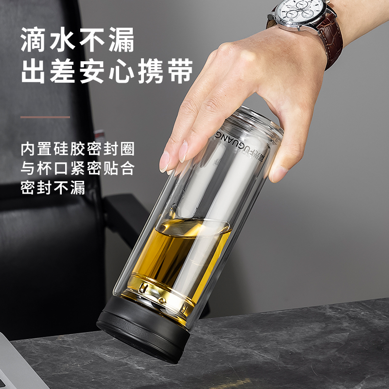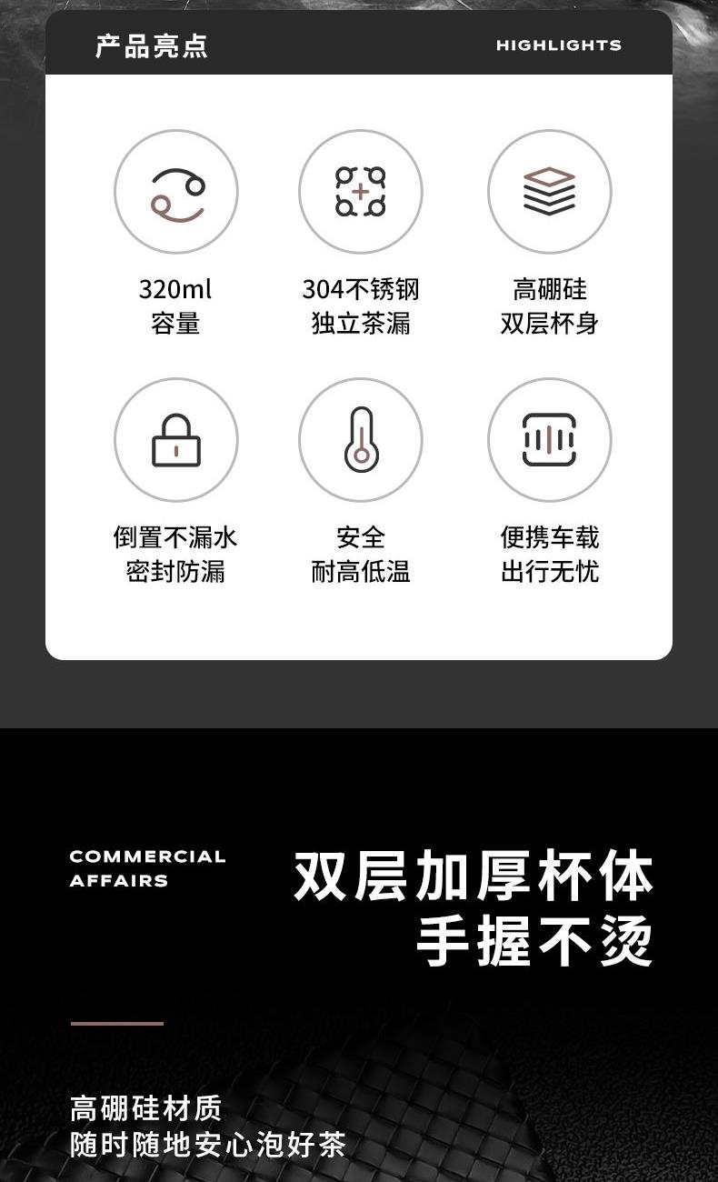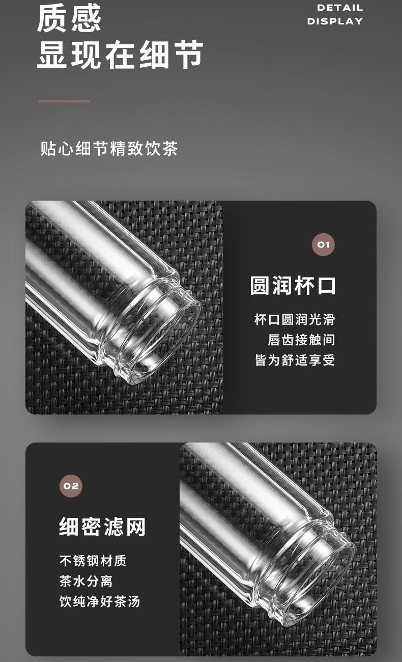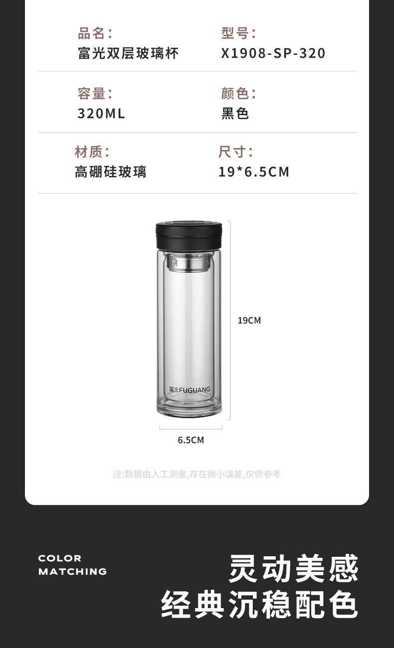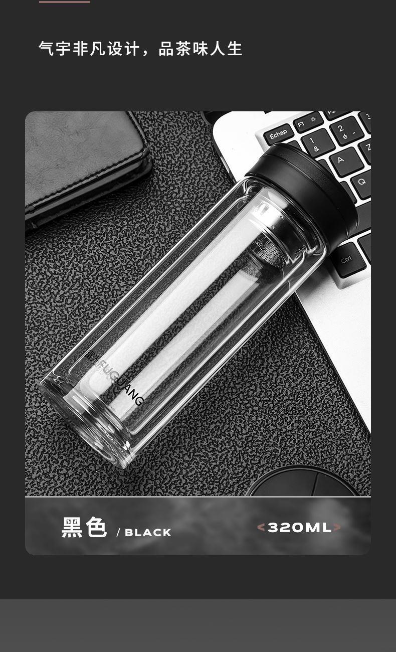 容量:320ml 颜色:黑色 尺寸:6.5*18.8cm 材质:双层高硼硅玻璃精雕细琢, 杯底加厚烧制,大气稳重,双层微真空隔热技术,有限阻隔温度传递,茶杯拿握不烫手。 304不锈钢滤网。PP商务杯盖,彰显尊贵身份。 包装:单瓦盒