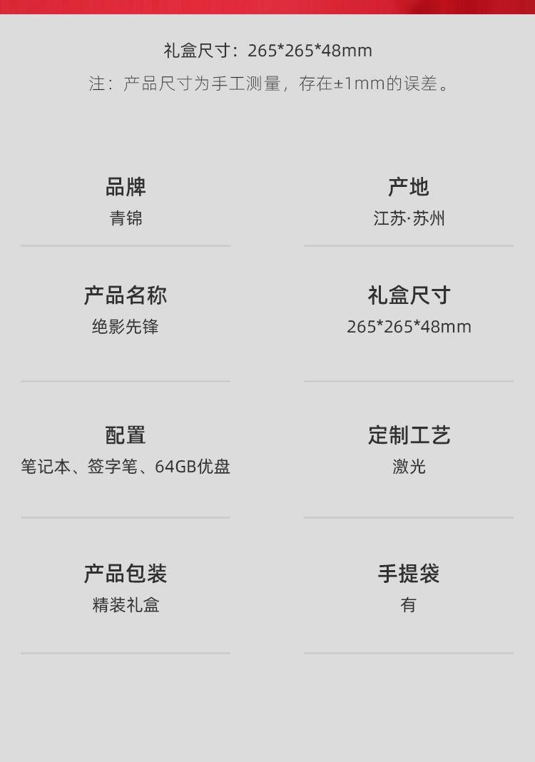 配置 绝影笔记本x1 坐标签字笔*1指环优64GB*1 精装礼盒包装*1 手提袋*1 笔记本:皮革 千越象牙白纸100克80张 签字笔外壳:金属 优盘:金属 定制工艺:激光 镭射 印刷 烫压印 笔记本:130*212mm 签字笔:141*10mm 指环优盘:17*44mm 礼盒:265*265*48mm