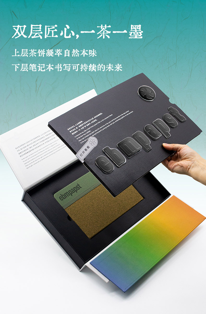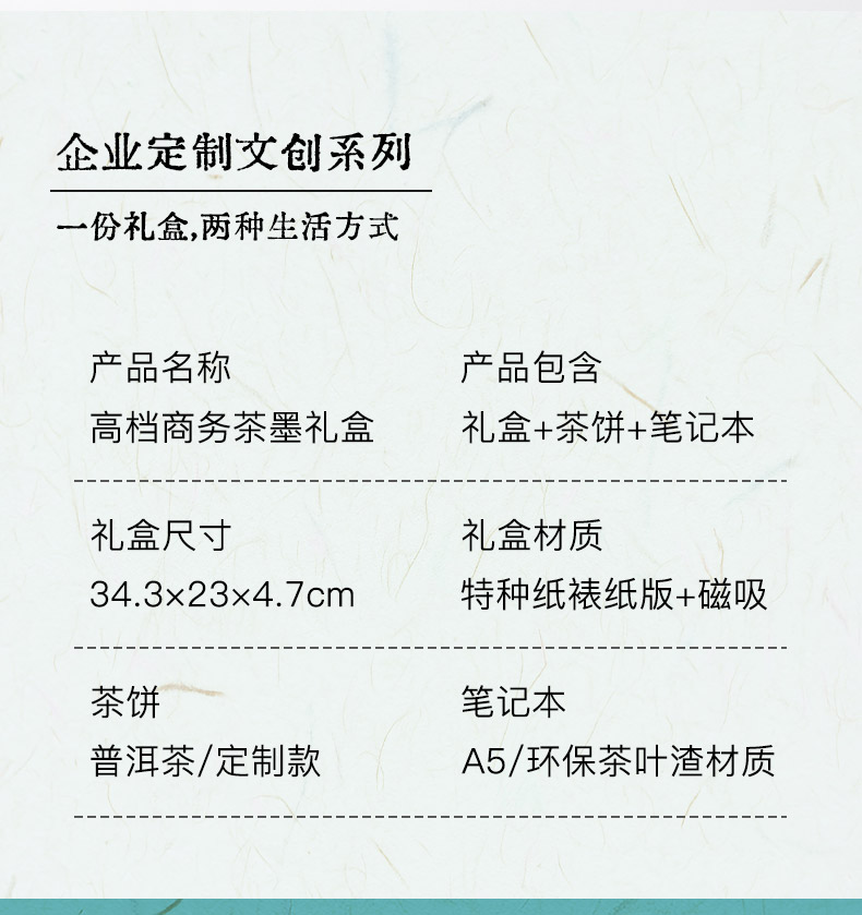礼盒尺寸:34.3x23x4.7cm 茶饼:普洱茶/定制款 笔记本:A5/环保茶叶渣材质