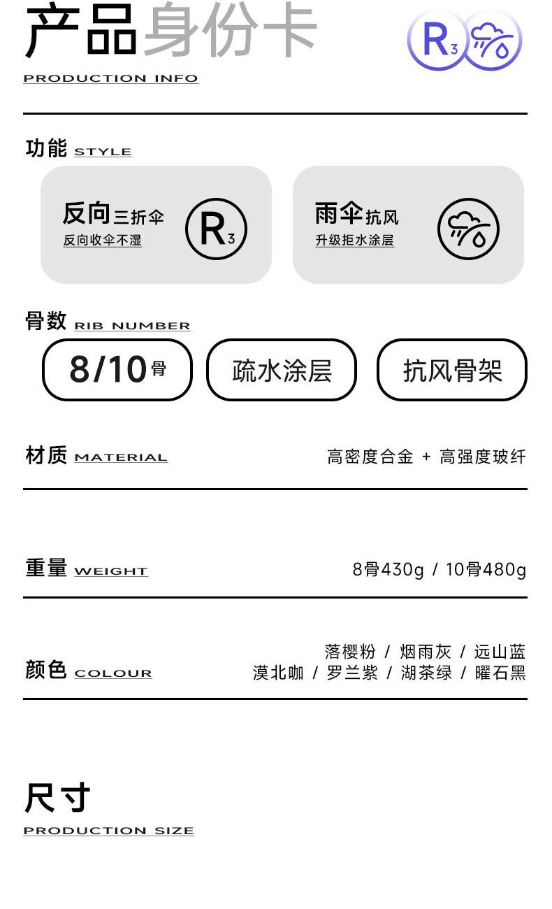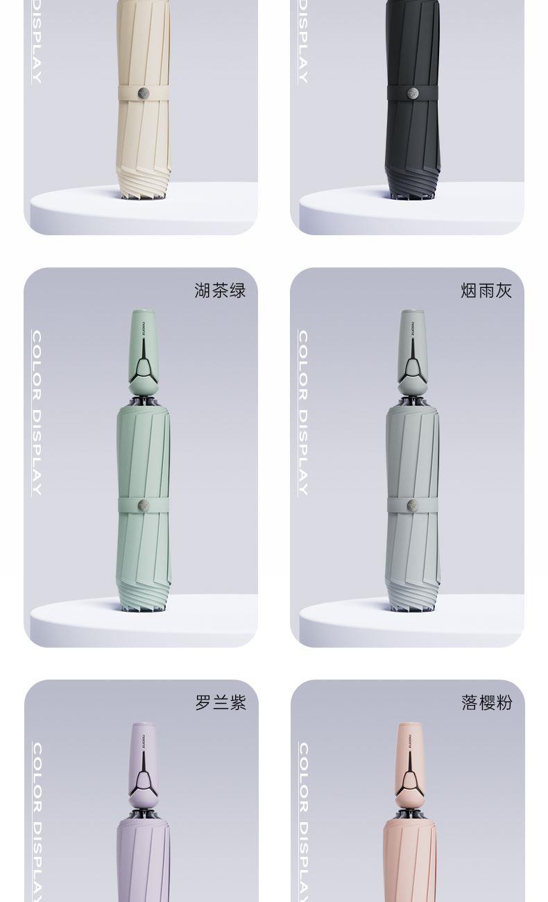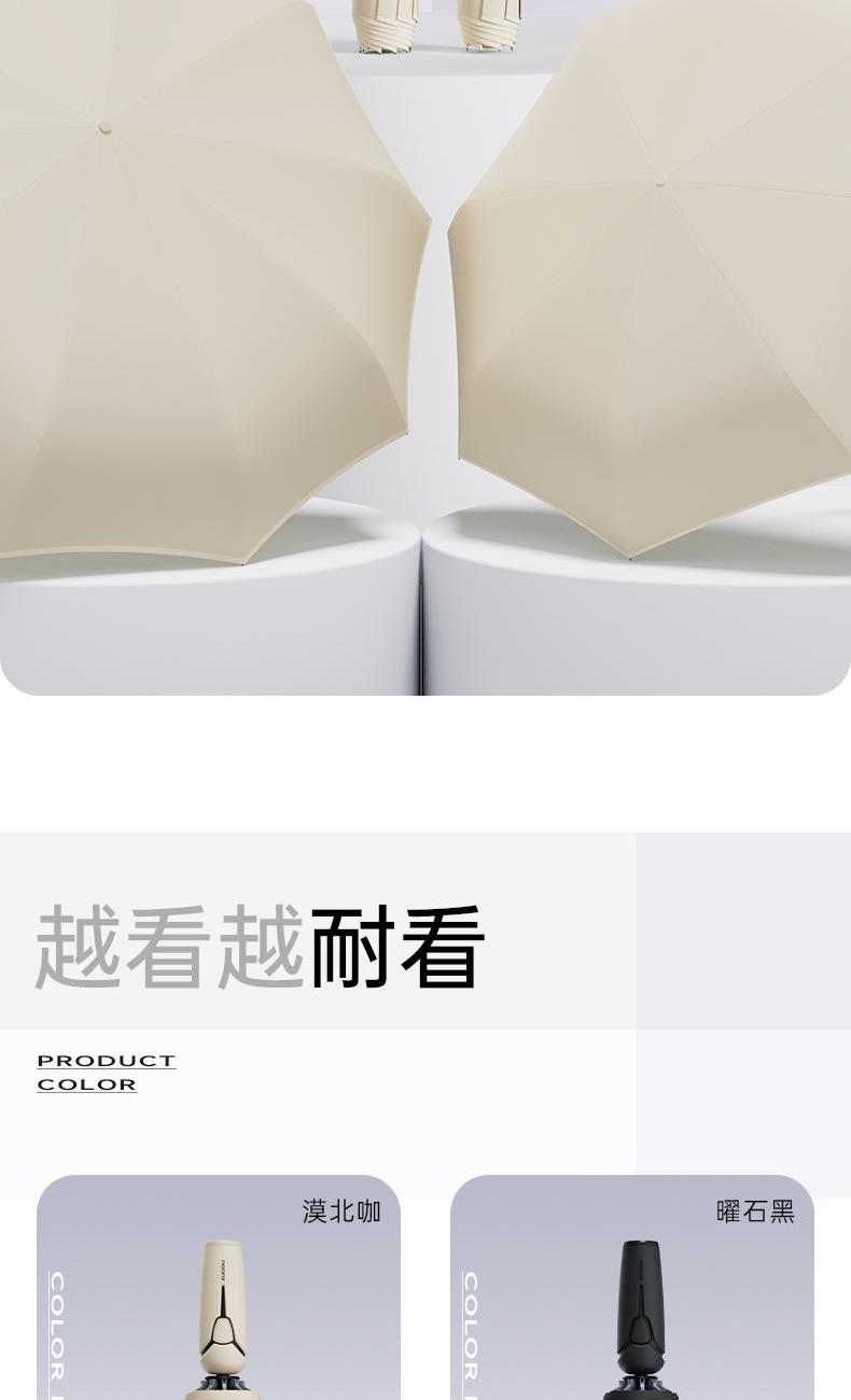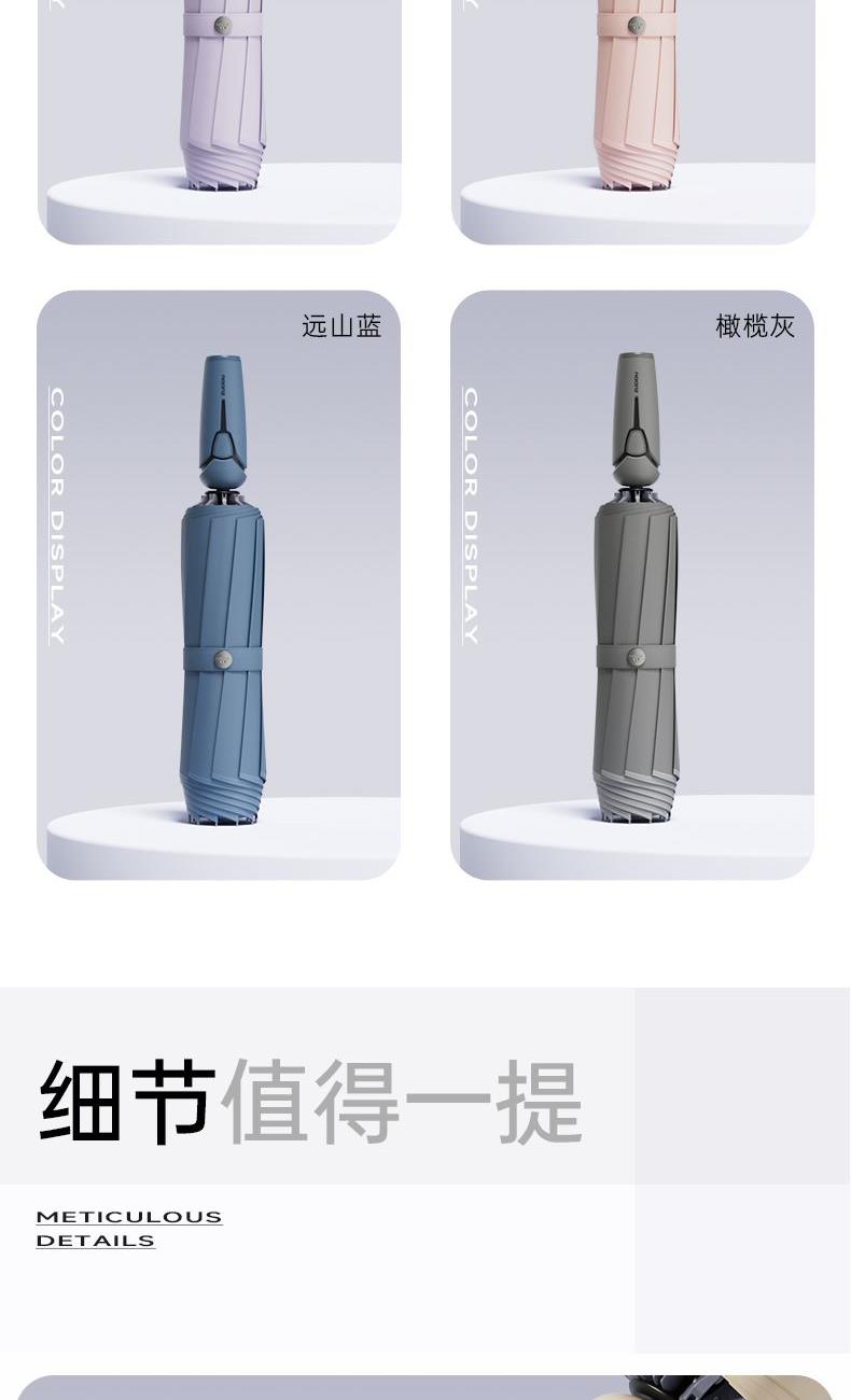 商品货号:ZD143 伞架材质:不锈钢,玻纤,不锈钢中棒 伞面材质:280T抨击布 款式:全自动三折晴雨伞(23寸/25寸) 商品参数:直径:105cm /115cm 高度:63cm 收拢直径:6cm 收拢高度:33cm/35cm 商品毛重:420克/470克 商品颜色:米咖色 迷雾灰 星空黑 雾霾蓝 晨雾绿 木槿紫 淡雅红 石墨灰 商品包装:本布伞套