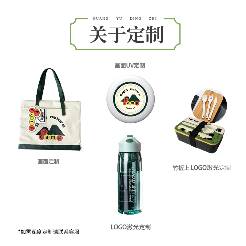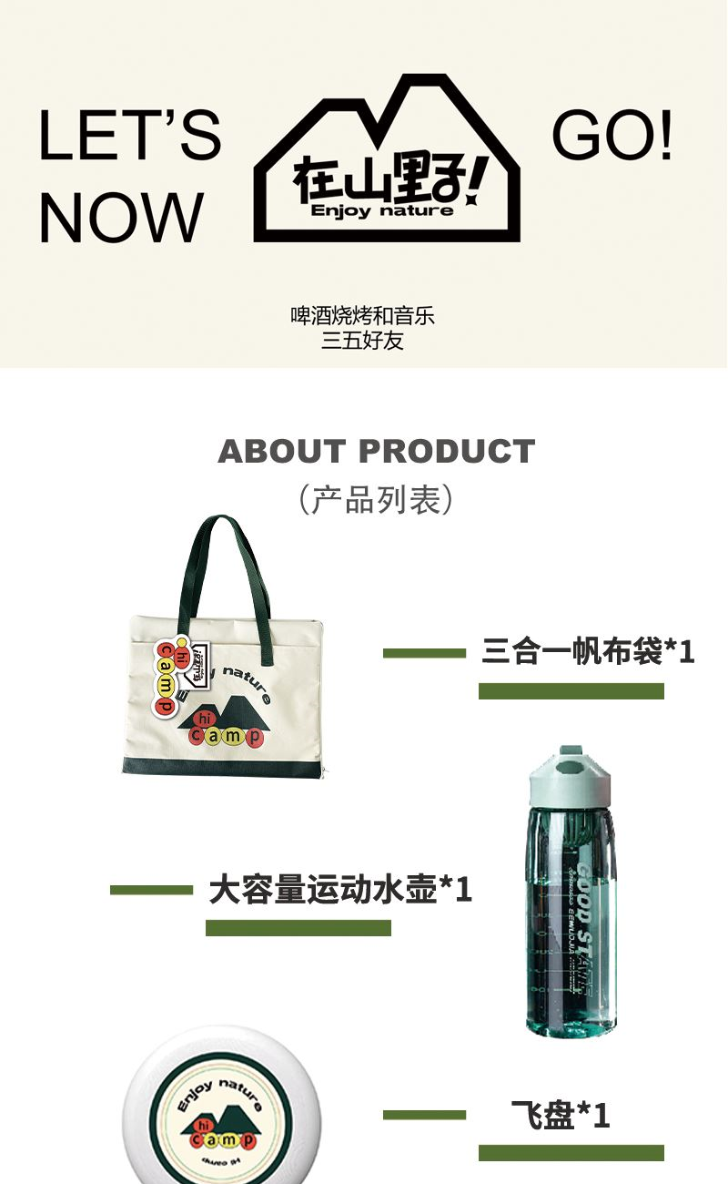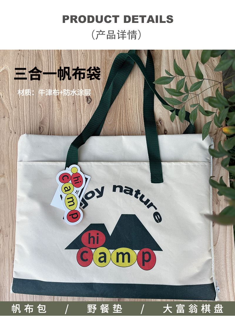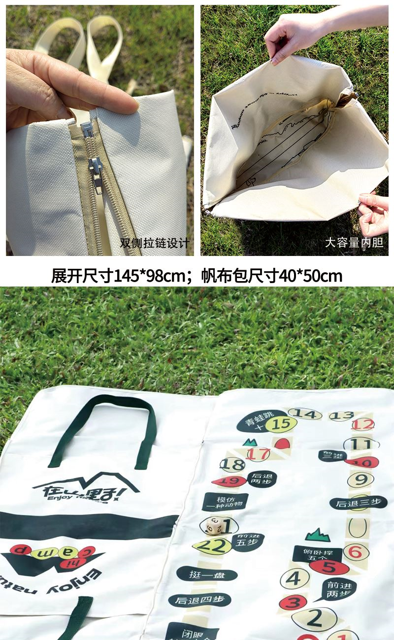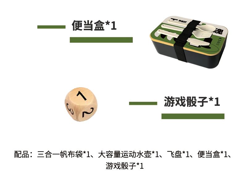 礼盒配置: 三合一帆布袋*1、骰子*1、飞盘*1、便当盒*1、运动水壶*1 礼盒参数: 帆布袋尺寸:40*50cm 套装重量:1200g/套 外箱尺寸:45*36*40cm 详细介绍: 1.三合一帆布包 帆布包/野餐垫/大富翁棋盘 材质:牛津布+防水涂层 展开尺寸145*98cm; 帆布包尺寸40*50cm 2.大容量运动水壶 加厚耐摔、带搅拌网格 杯体:食品级塑料 容量:550ML 3.飞盘 尺寸:直径25cm 材质:PE 4.便当盒 品质竹木盖板 尺寸10.5*18*9.5cm 5.游戏骰子 尺寸:3*3cm 材质:实木