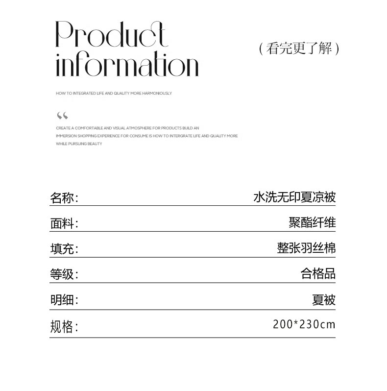 面料:水洗棉(聚酯纤维) 规格:200cm*230cm 填充:聚酯纤维 包装:礼盒 无印风水洗棉面料,质感柔软,手感细腻,亲肤无刺激,洁净度高。填充采用整张纤维填充,吸湿透气,保暖舒适,呵护美好睡眠。
