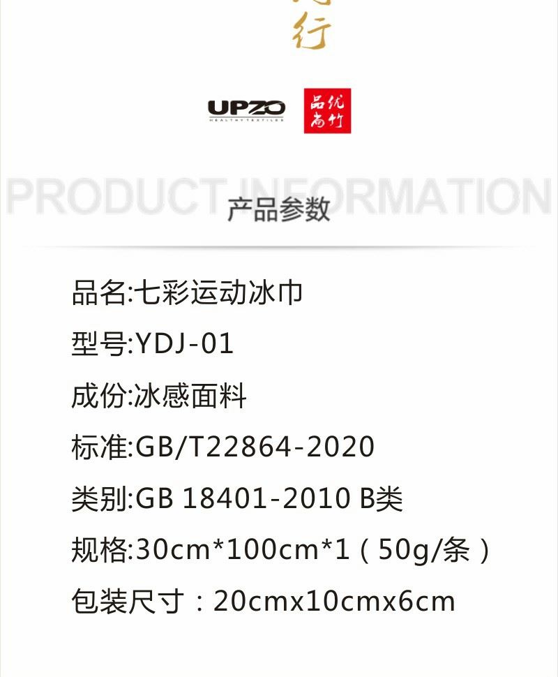 型号: YDJ-01 成份: 冰感速干面料 规格: 30cm×100cm 厚度标准: 48 克 类别: GB18401-2010 B类 礼盒:21*7*7CM 冰感面料 快速降温 精密走线 礼盒包装