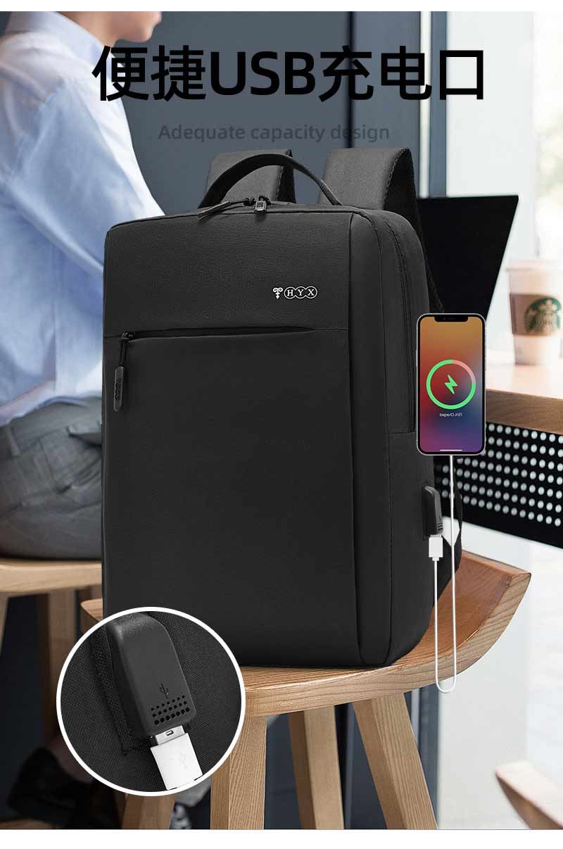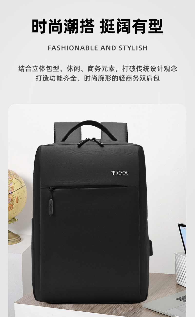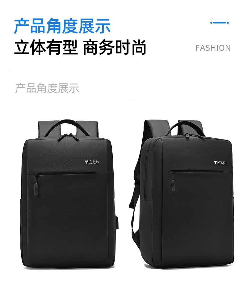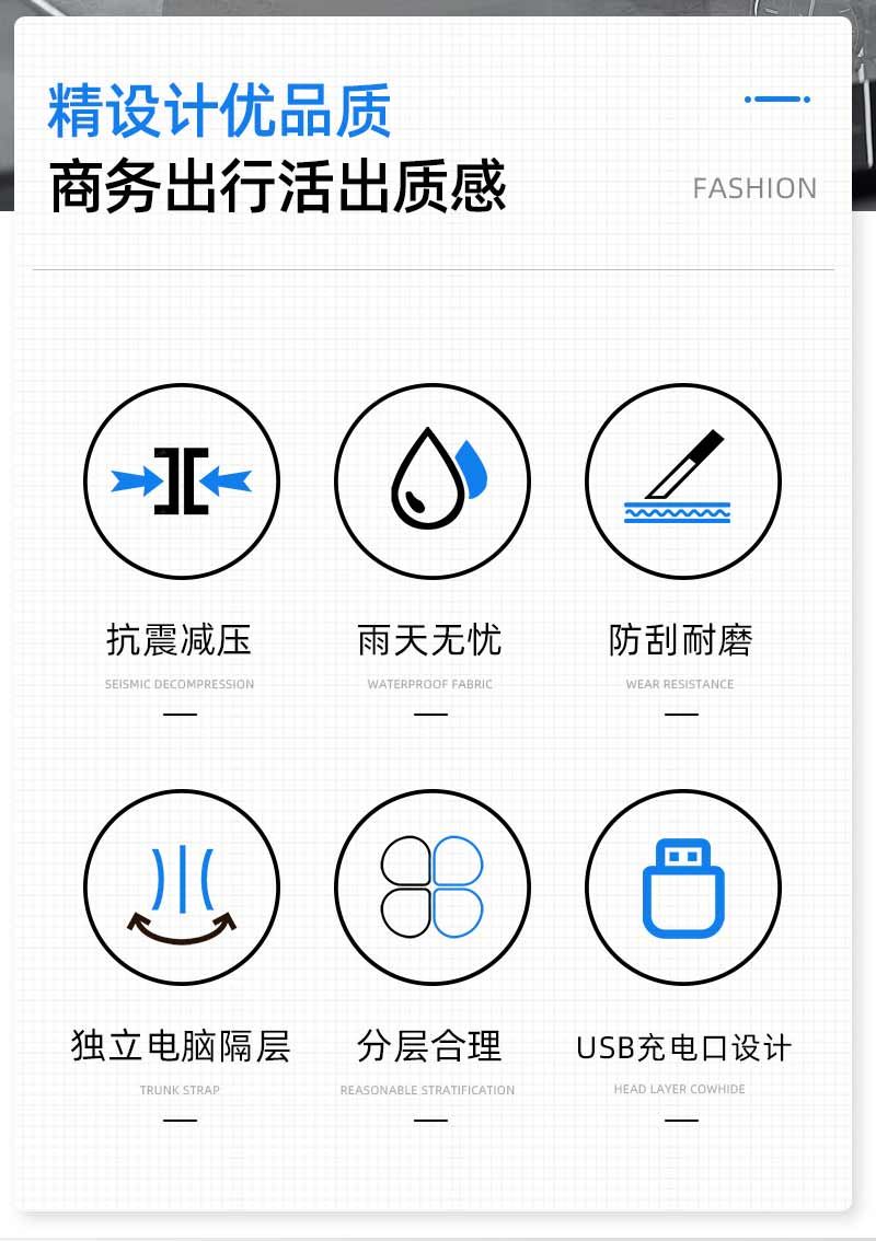 受力点:密集针加固(打枣)结实可靠; 外置USB充电接口,即插即充; 严格的质量标准,车缝一寸7针; 笔记本电脑主袋,平板电脑书籍副袋,笔插袋,卡片袋,零钱袋,都市出行,你没有想到的,我们都想到了; 方形立体式设计,简约更有型。