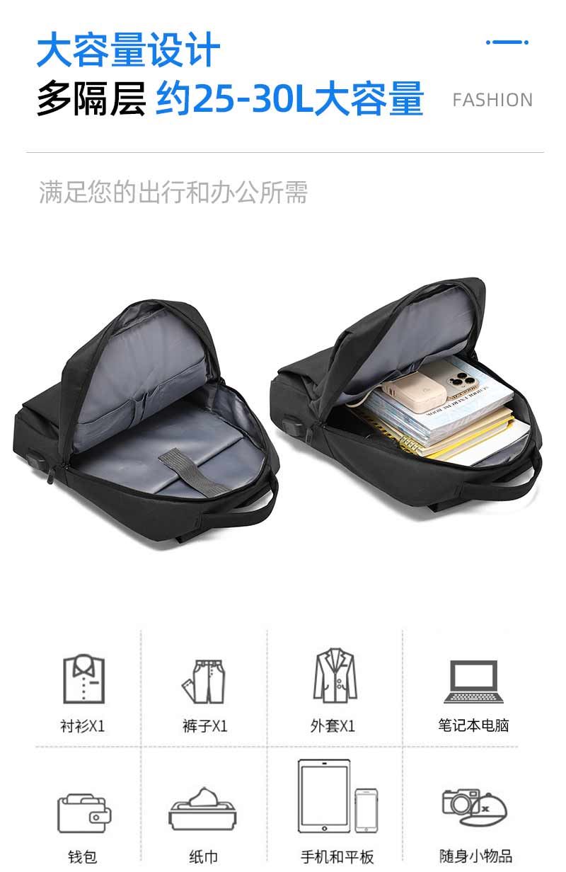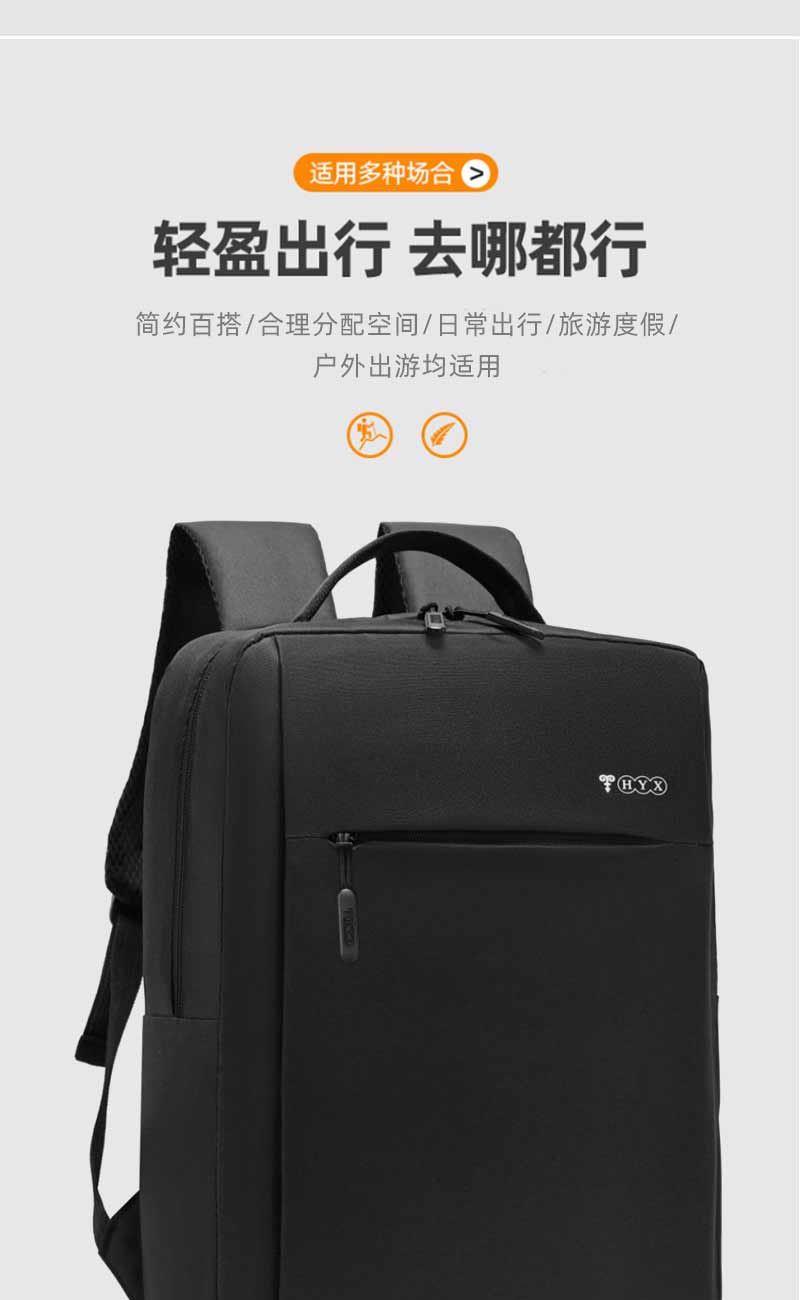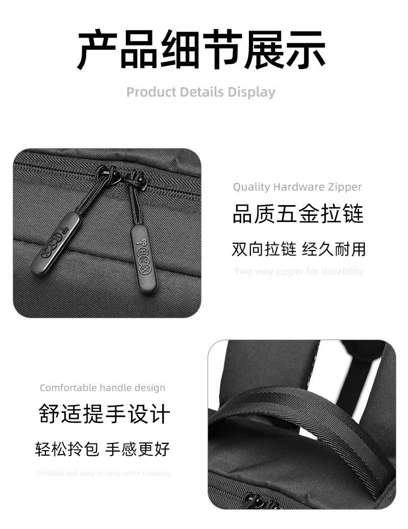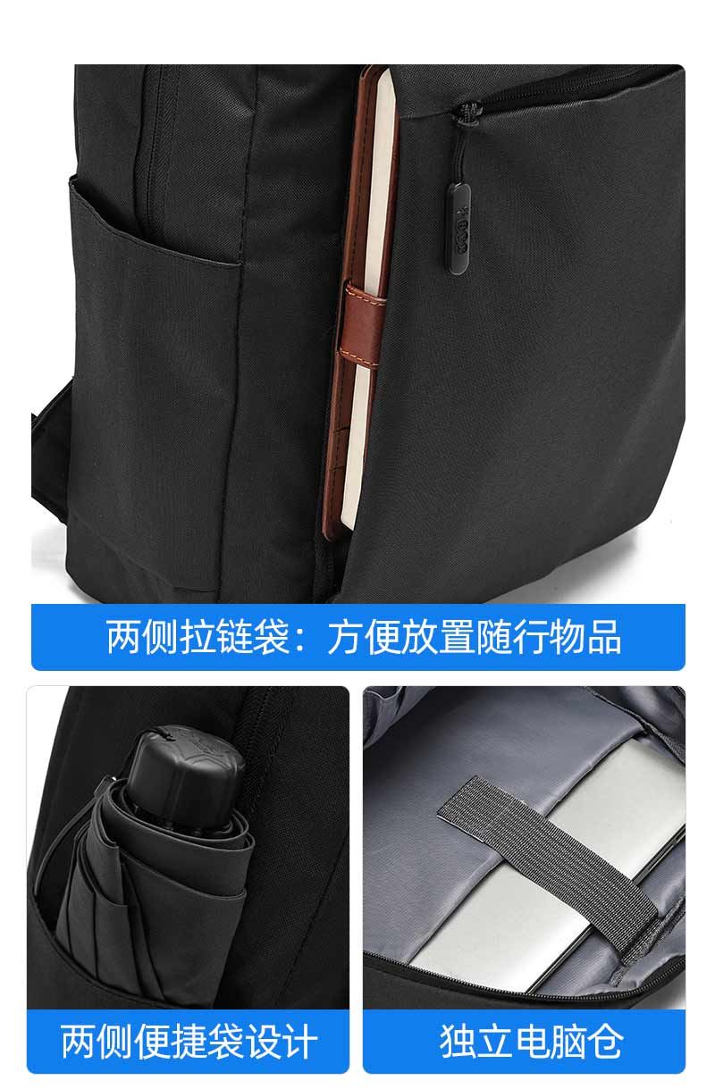 受力点:密集针加固(打枣)结实可靠; 外置USB充电接口,即插即充; 严格的质量标准,车缝一寸7针; 笔记本电脑主袋,平板电脑书籍副袋,笔插袋,卡片袋,零钱袋,都市出行,你没有想到的,我们都想到了; 方形立体式设计,简约更有型。