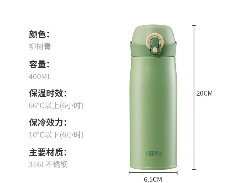 颜 色:GN绿色/OR橙色/VAN白色/YL黄色/NBK黑色 容 量:400ml 类 型:316钢 定 制:可以定制 保 温:6小时大约60°C 保 冷:6小时大约10°C