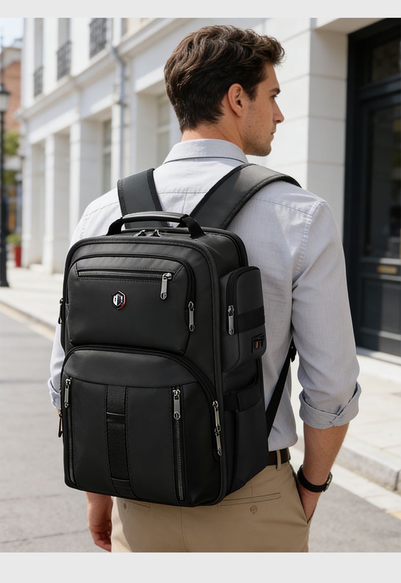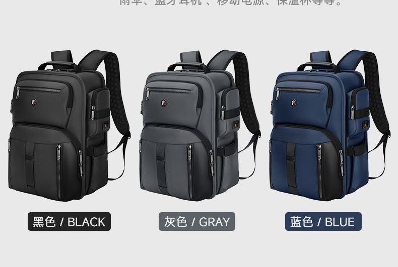 型号:82527 尺寸: 长35*宽23*高45cm 重量:1.2KG 材质: 涤纶(聚酯纤维) 颜色:黑色/蓝色/灰色 1.大容量主仓,180度大开口设计,箱式开合.. 2.高密度涤纶面料,防波水,防刮耐磨,防尘设计! 3.独立电脑仓,可放16寸以内电脑. 4.弹力背板、透气、缓压、减震 5.肩带上部三档位置调节,下部织带随意调节,带肩带固定扣. 6.双侧自伸缩水杯袋-容量杯仓秒速回弹包包有型更有料 前幅拉链袋