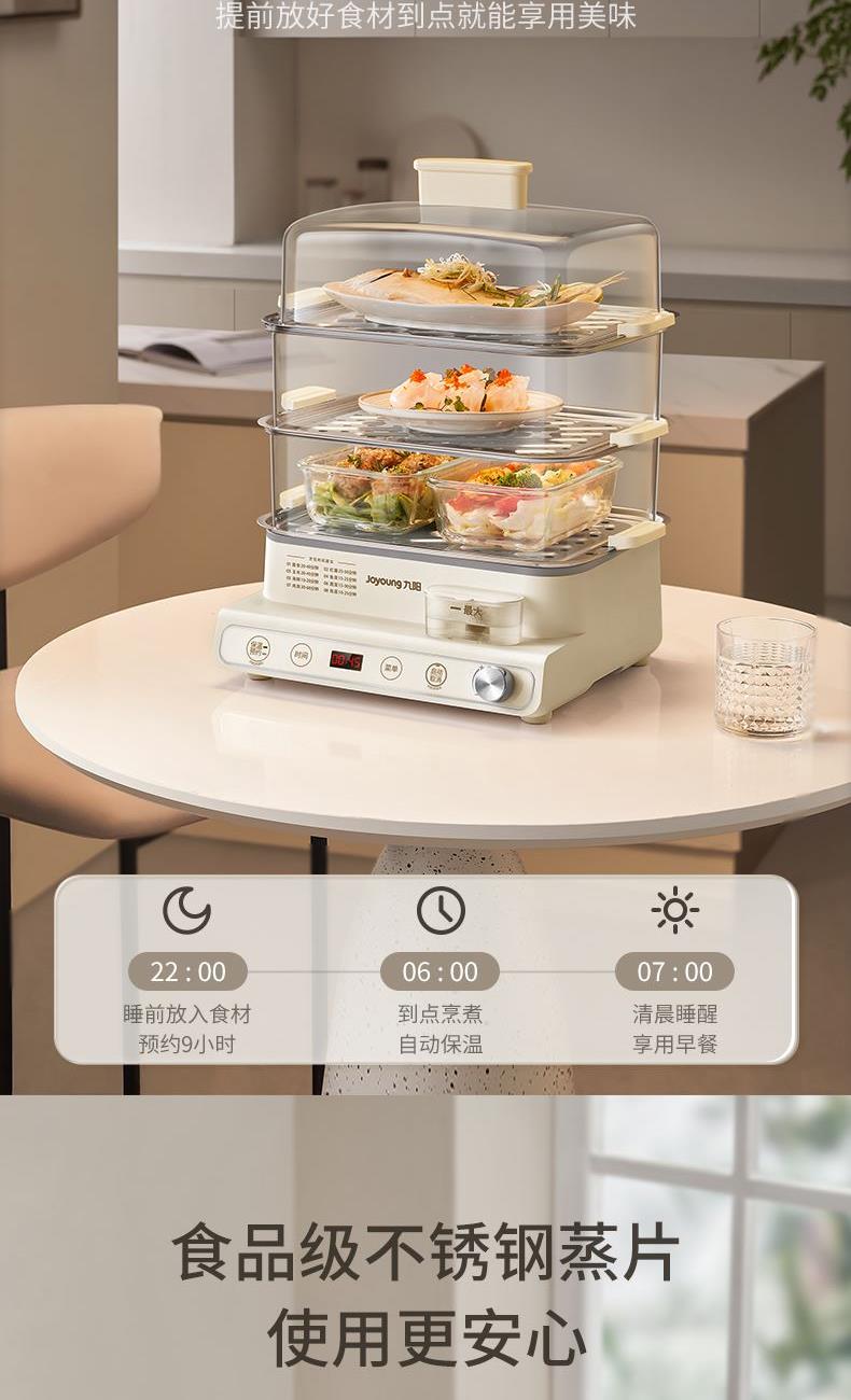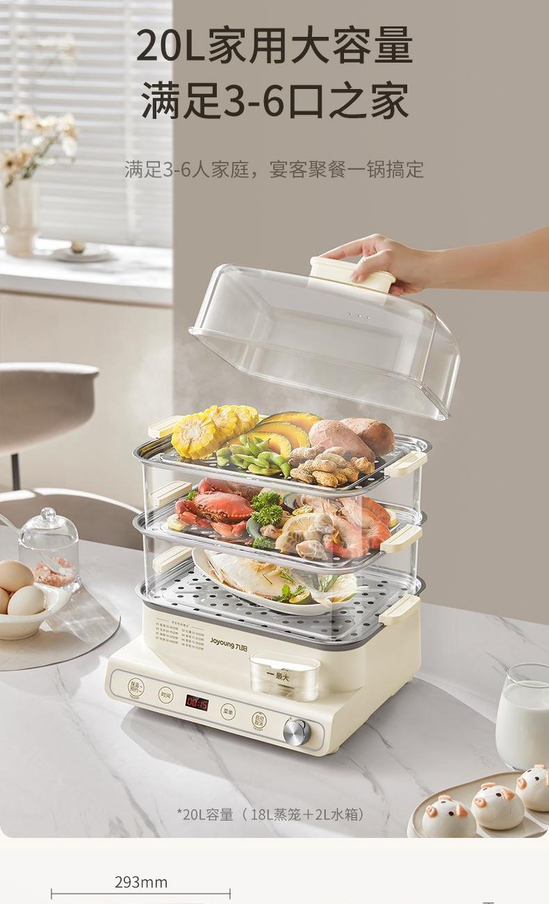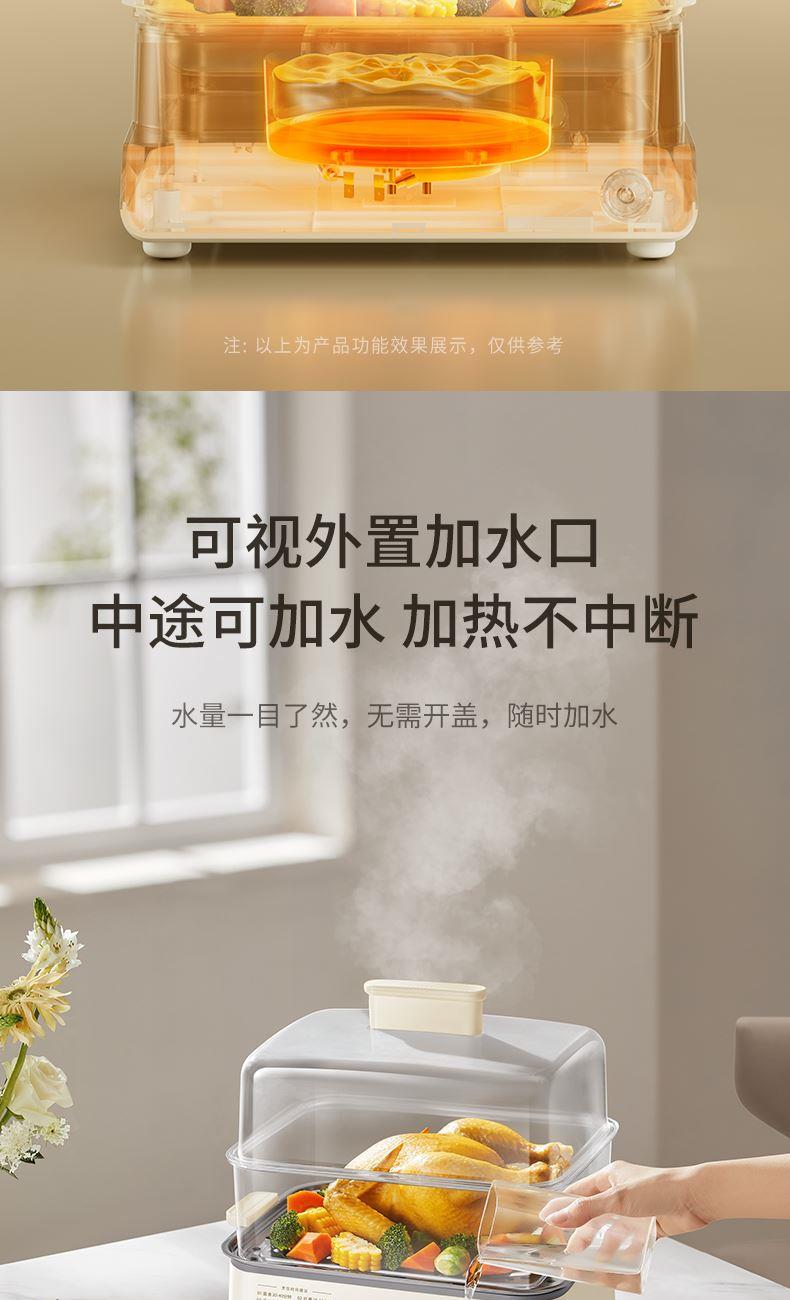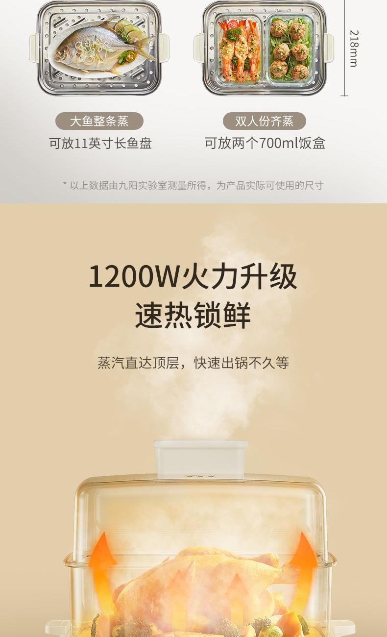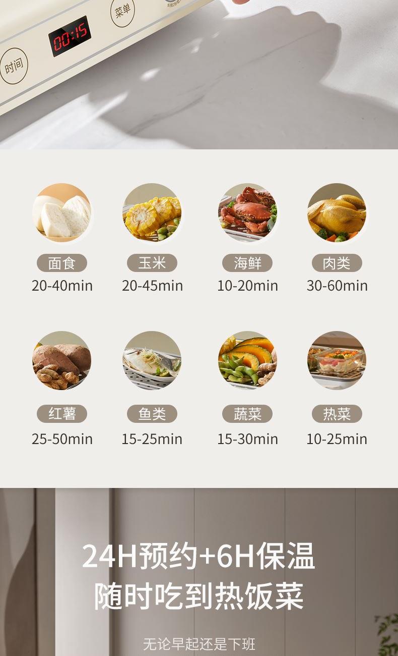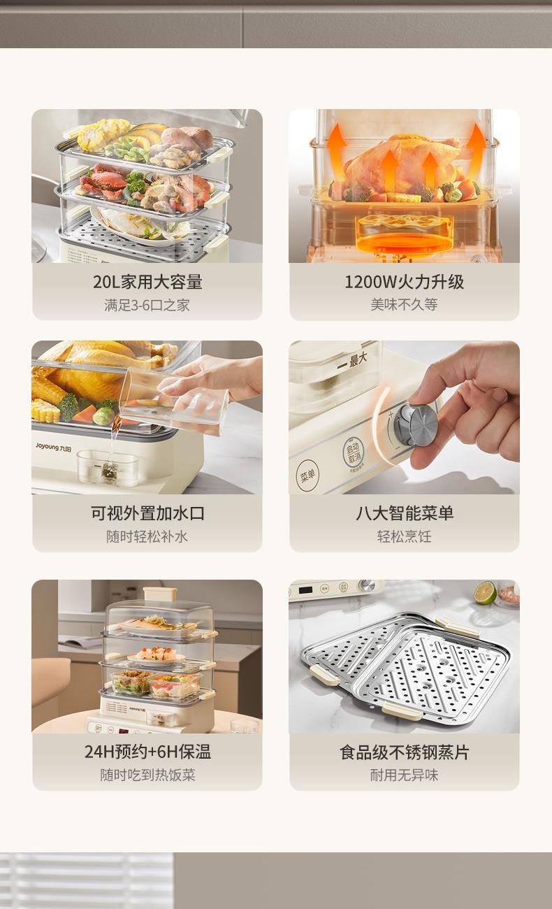 1、20L三层大容量,8大智能菜单; 2、1200W大火力,速热锁鲜; 3、24H预约,6H保温; 4、可视外置加水口,无需开盖加水; 5、食品级不锈钢蒸片; 6、过热保护,智能免看管。