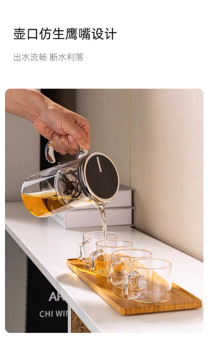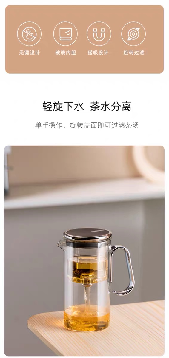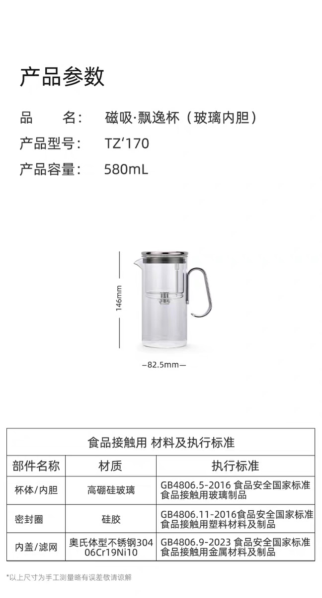 型号:TZ170 容量:580mL 颜色:透明/烟灰色 卖点: 磁旋出水,轻松过滤,浓淡可控 强力磁吸,轻松倒茶不掉盖 重力控水,滴水不漏 鹰嘴壶口,出水流畅,断水利落