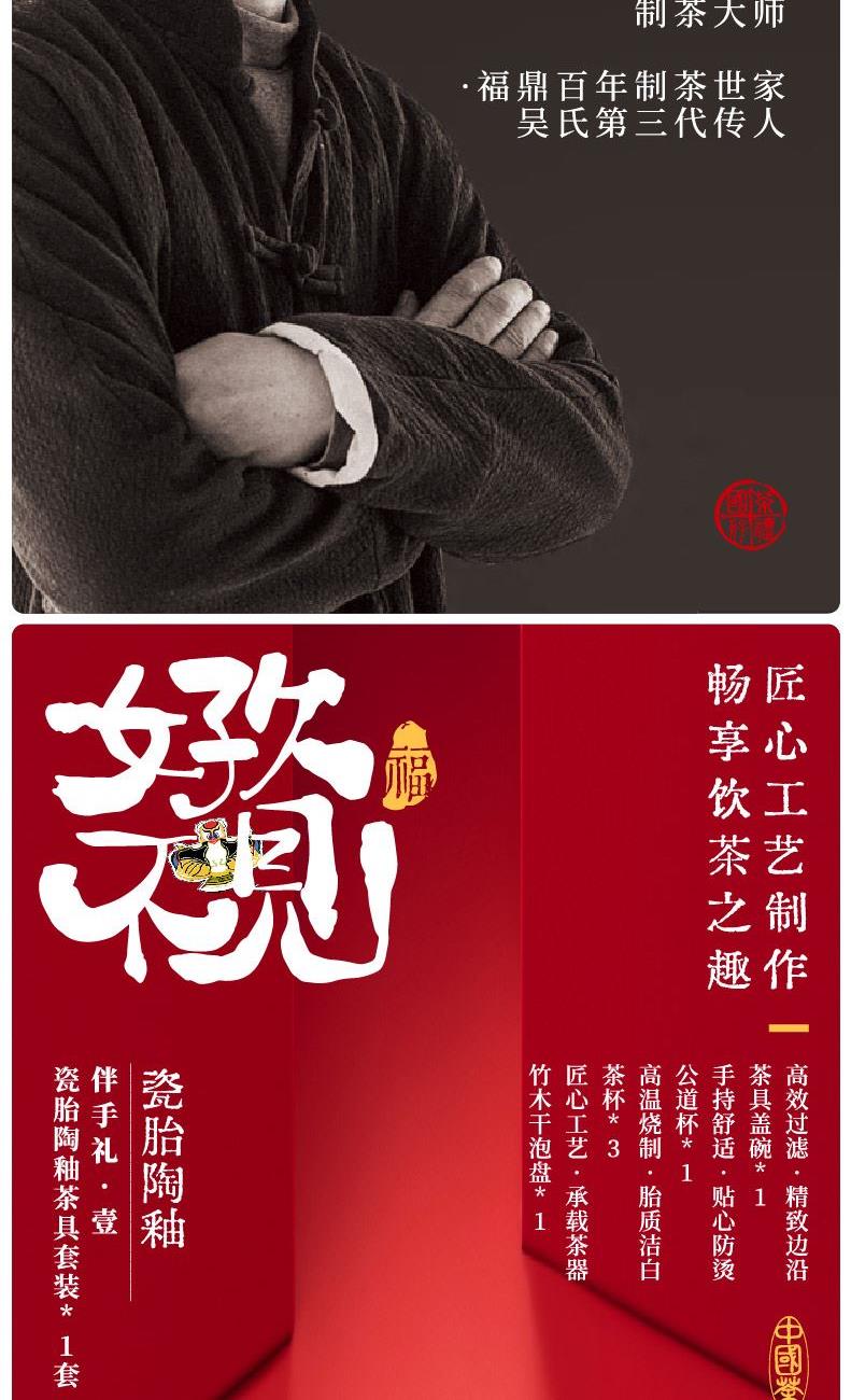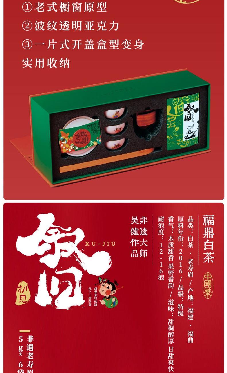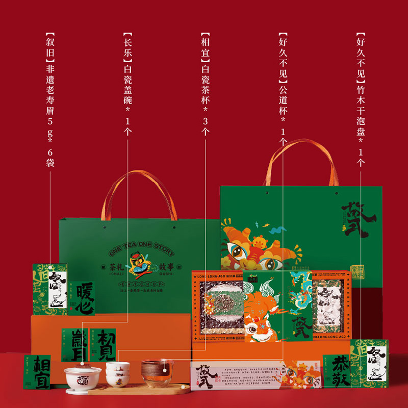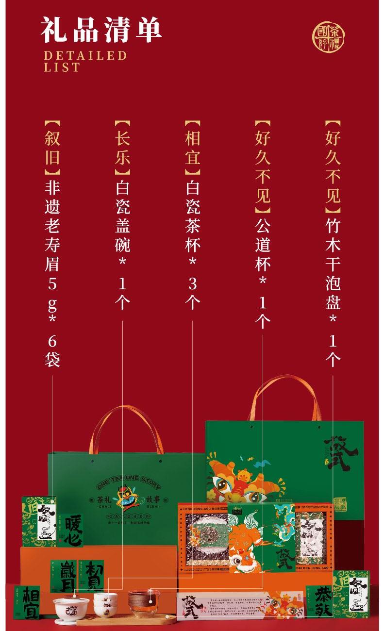 【叙旧】非遗老寿眉5*g6袋 【长乐】白瓷盖碗*1个 【相宜】白瓷茶杯*3个 【好久不见】公道杯*1个 【好久不见】竹木干泡盘*1个
