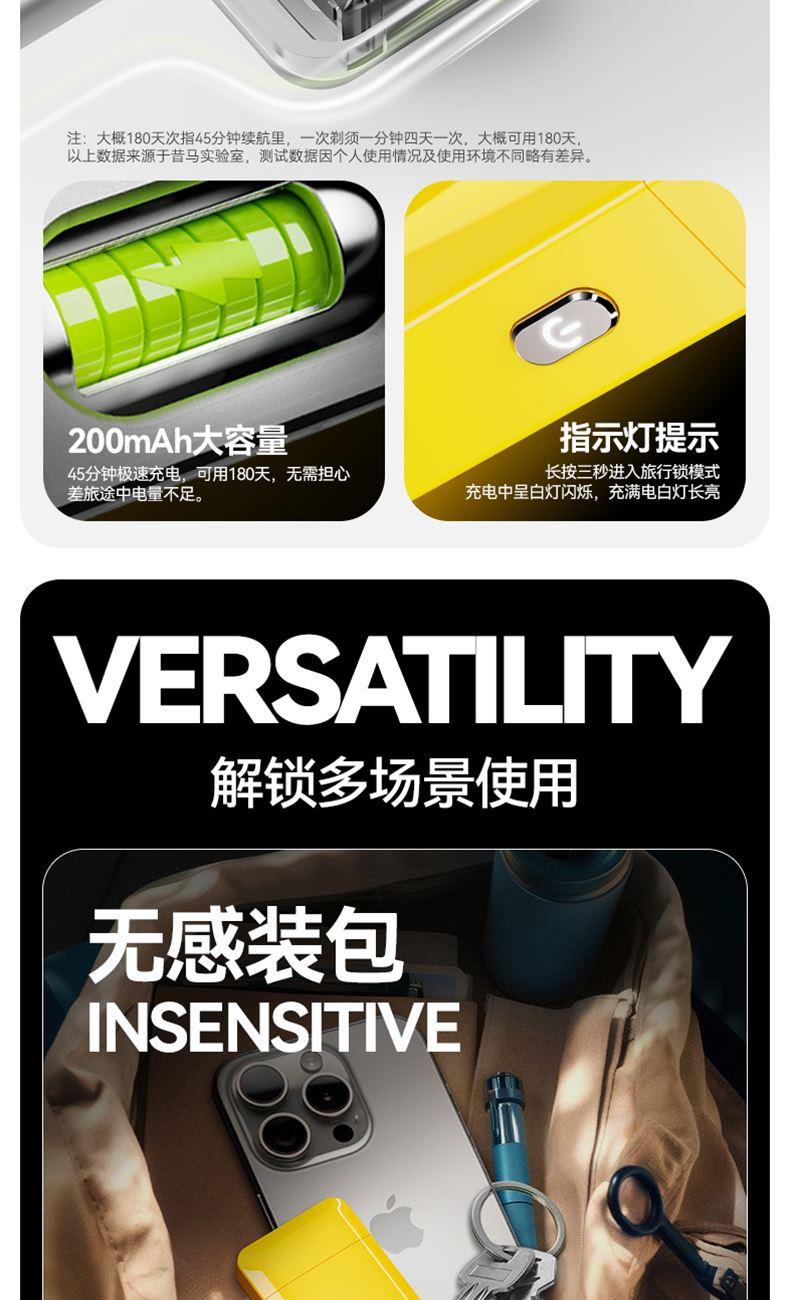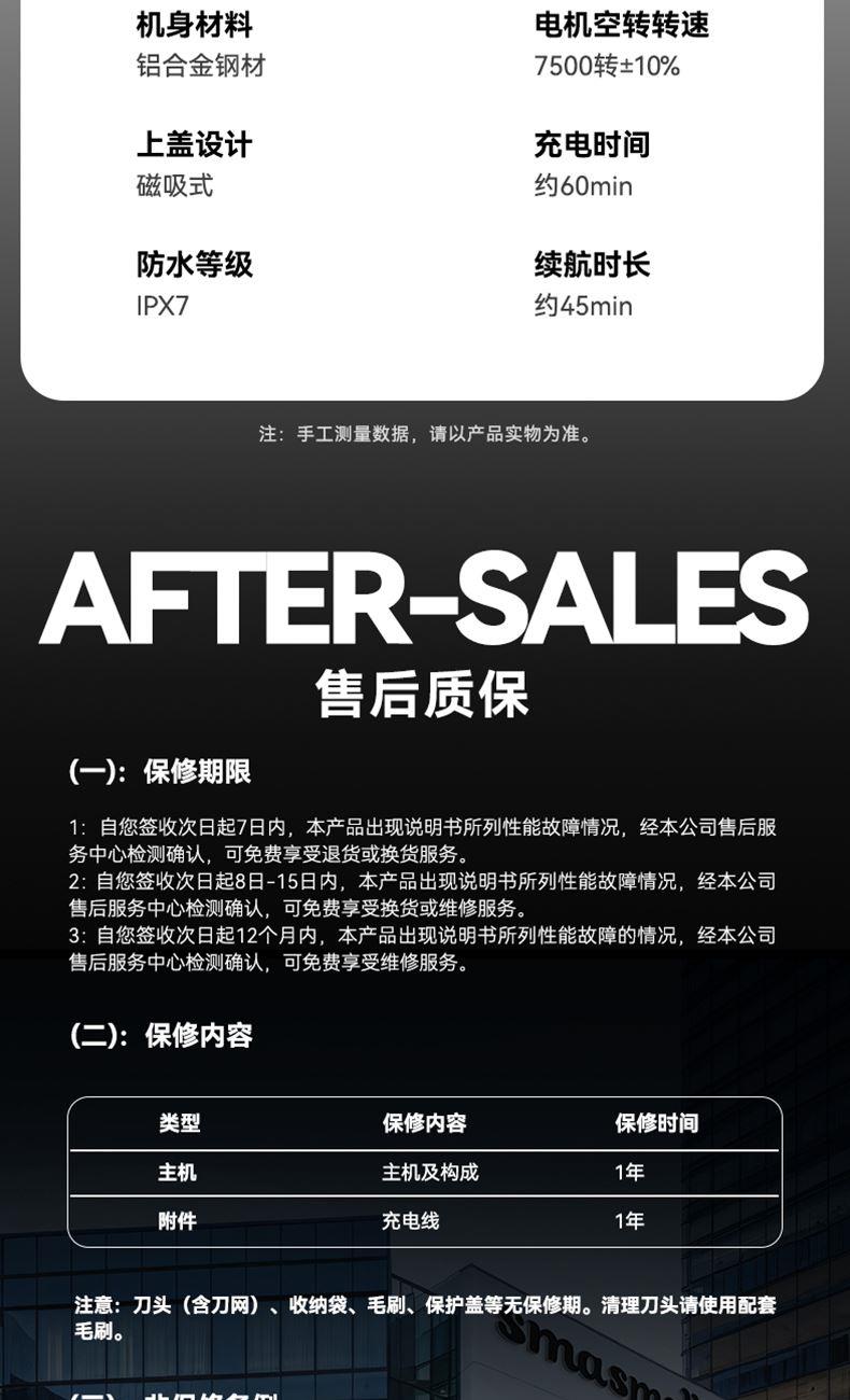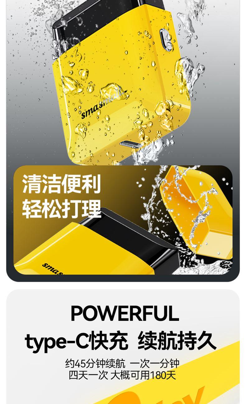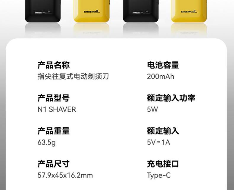 "电池容量: 200 mAh 充电接口: Tpye-C 续航时间: 大约 45mins 充电时长: 大约 60mins 防水等级: ipx7 刀头类型:往复式刀头"