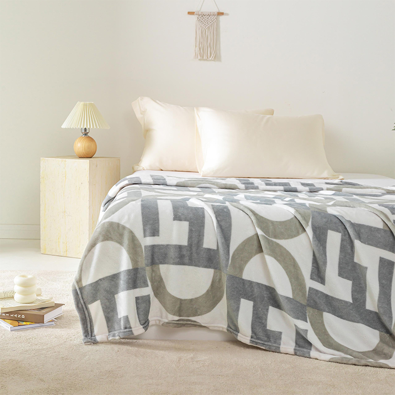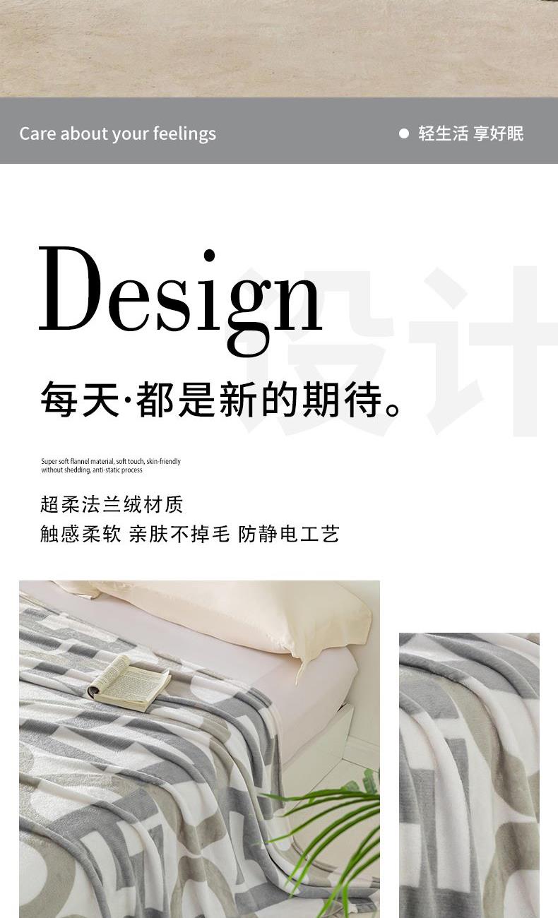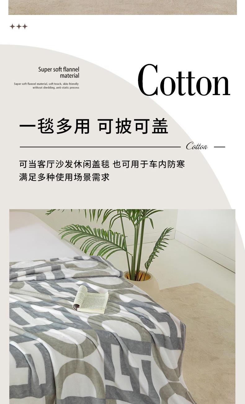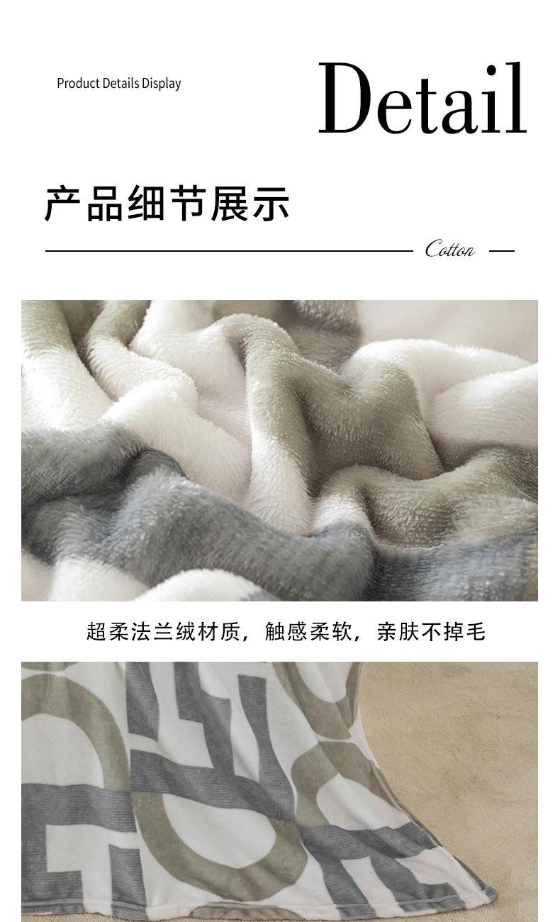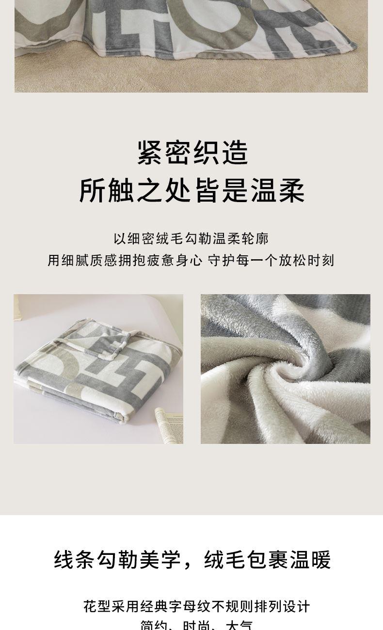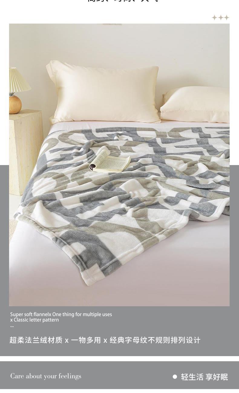 产品型号:B03025006 规 格:150*200cm 面 料:聚酯纤维 装 箱 数:10 花型采用经典字母纹不规则排列设计,简约、时尚、大气。 超柔法兰绒材质,触感柔软,亲肤不掉毛,防静电工艺。 一物多用,可披可盖,可当客厅沙发休闲盖毯,也可用于车 内,长途旅行防止着凉,满足多种使用场景需求。