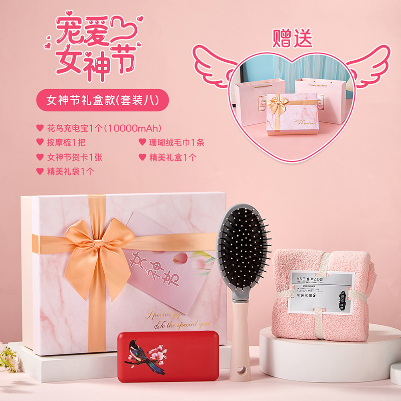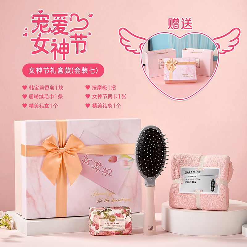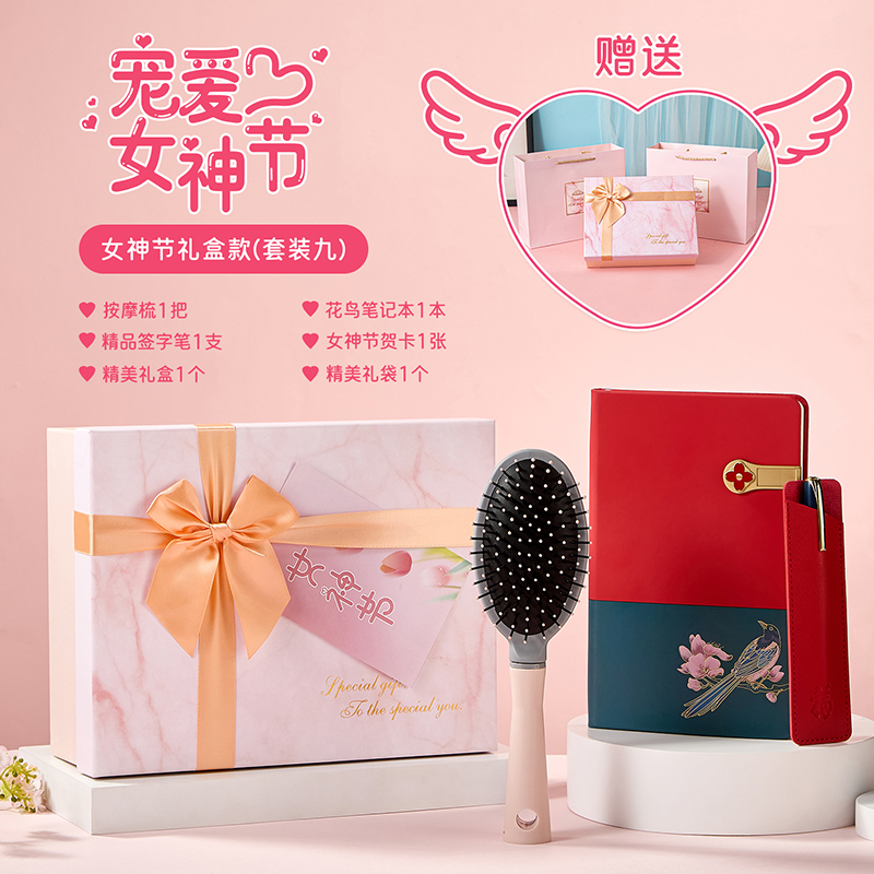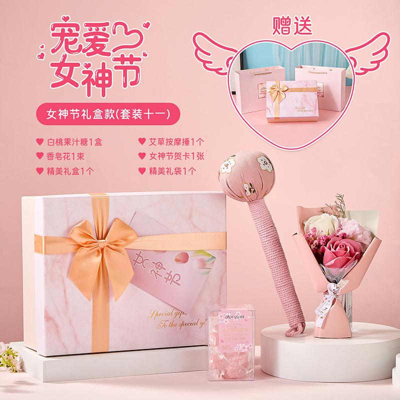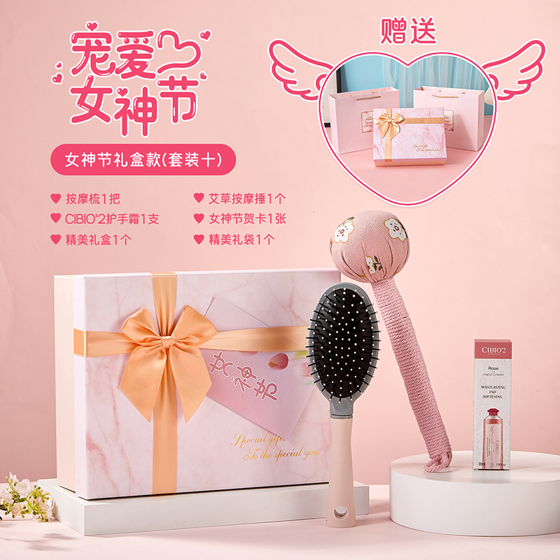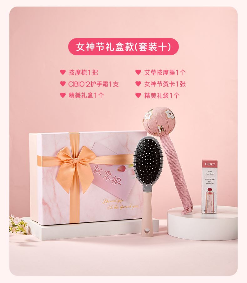 1.注:商城报价对应首张主图款式! 其他套装参考细节图,费用另计! 2. 咨询下单请备注好产品信息! 3.首图款式产品明细:女神节礼盒款(套装十): 按摩梳1把 艾草按摩捶1个 CIBIO'2护手霜1支 女神节贺卡1张 精美礼盒1个 精美礼袋1个
