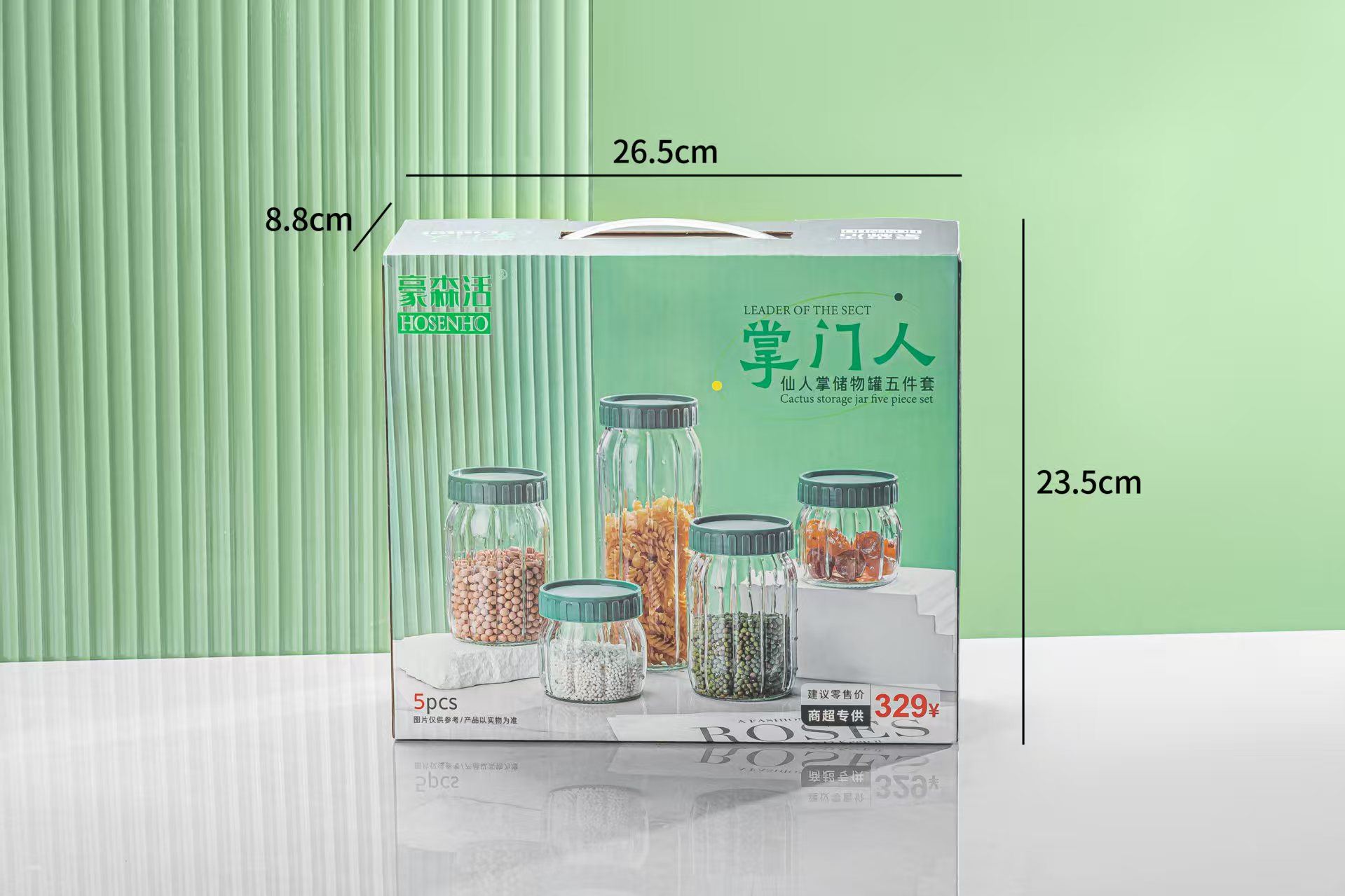 仙人掌储物罐五件套 货号:XRZCWG-L5 规格:1*12套 容量:1050ml*1+680ml*2+320ml*2 彩盒尺寸:26.7*8.9*23.3cm 外箱尺寸:55*28.4*48.2cm 条 码:6976254570252