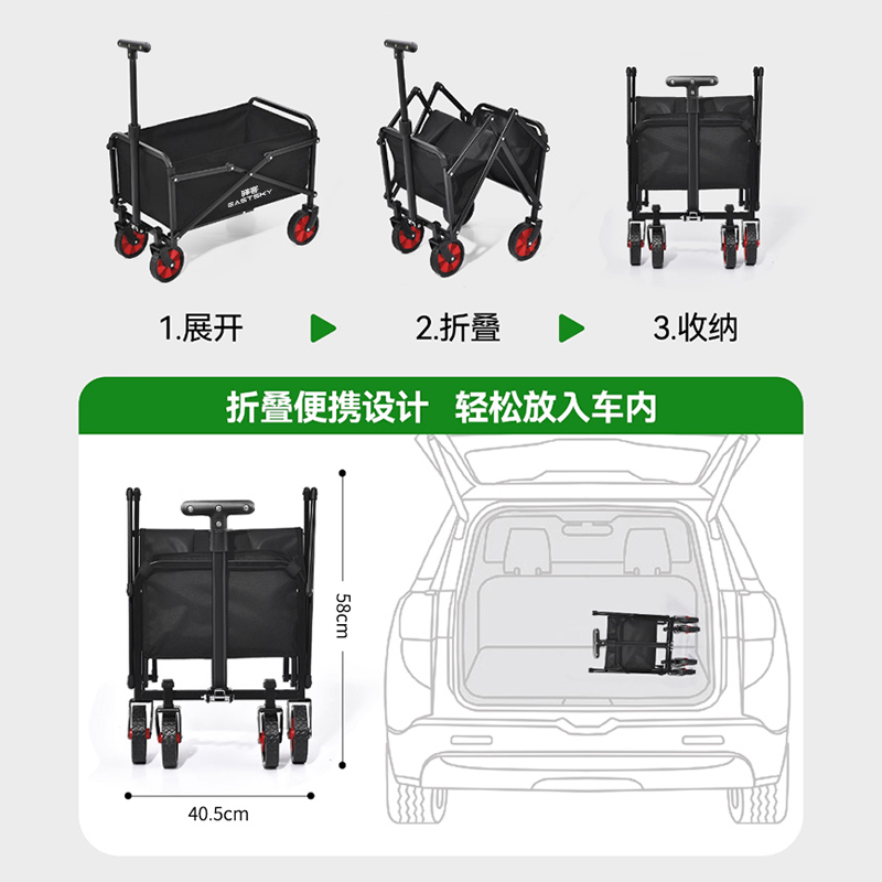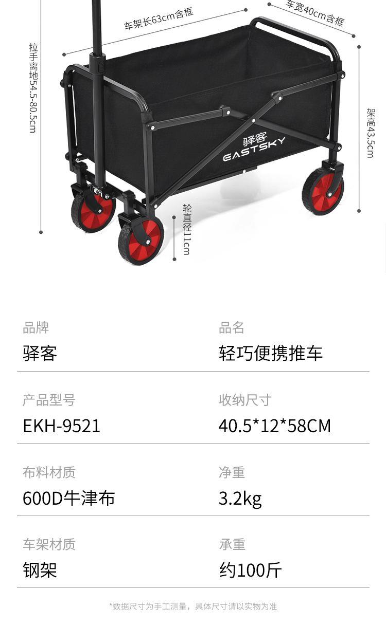 型号:EKH-9521 颜色:框架-黑色 布袋-黑色 材质:牛津布/碳钢 重量:约3.2kg 产品尺寸:59.5*40*54cm-82cm 拉杆可调节高度:54-82cm 容量:约40L