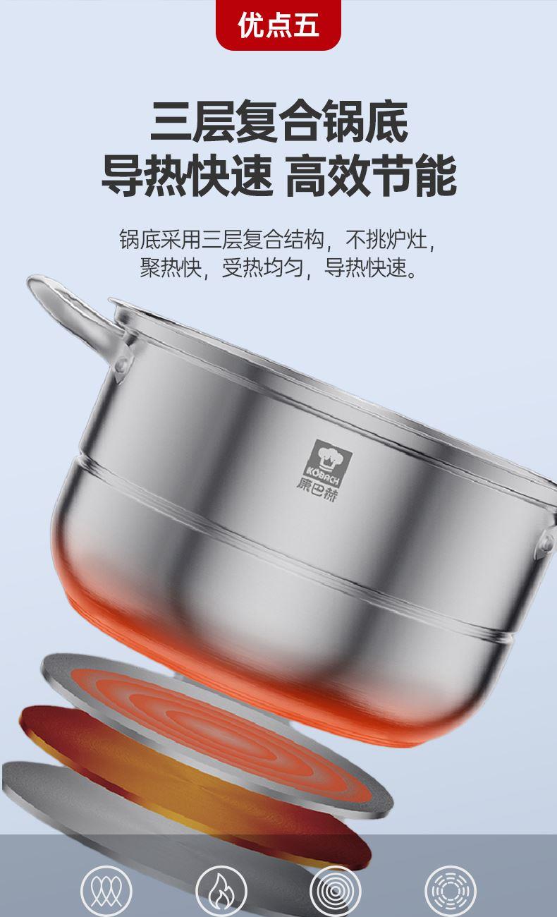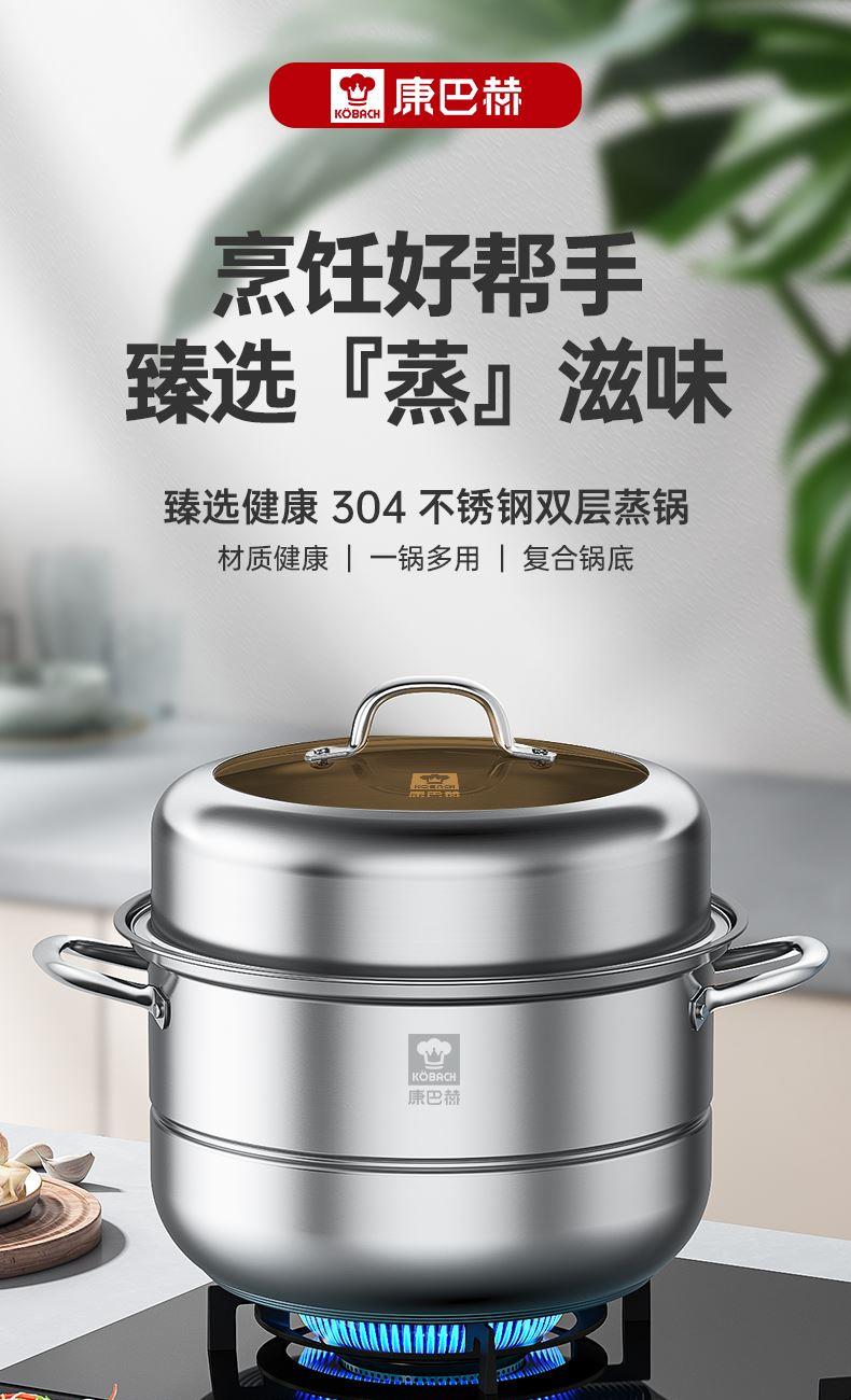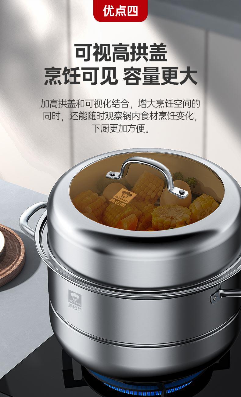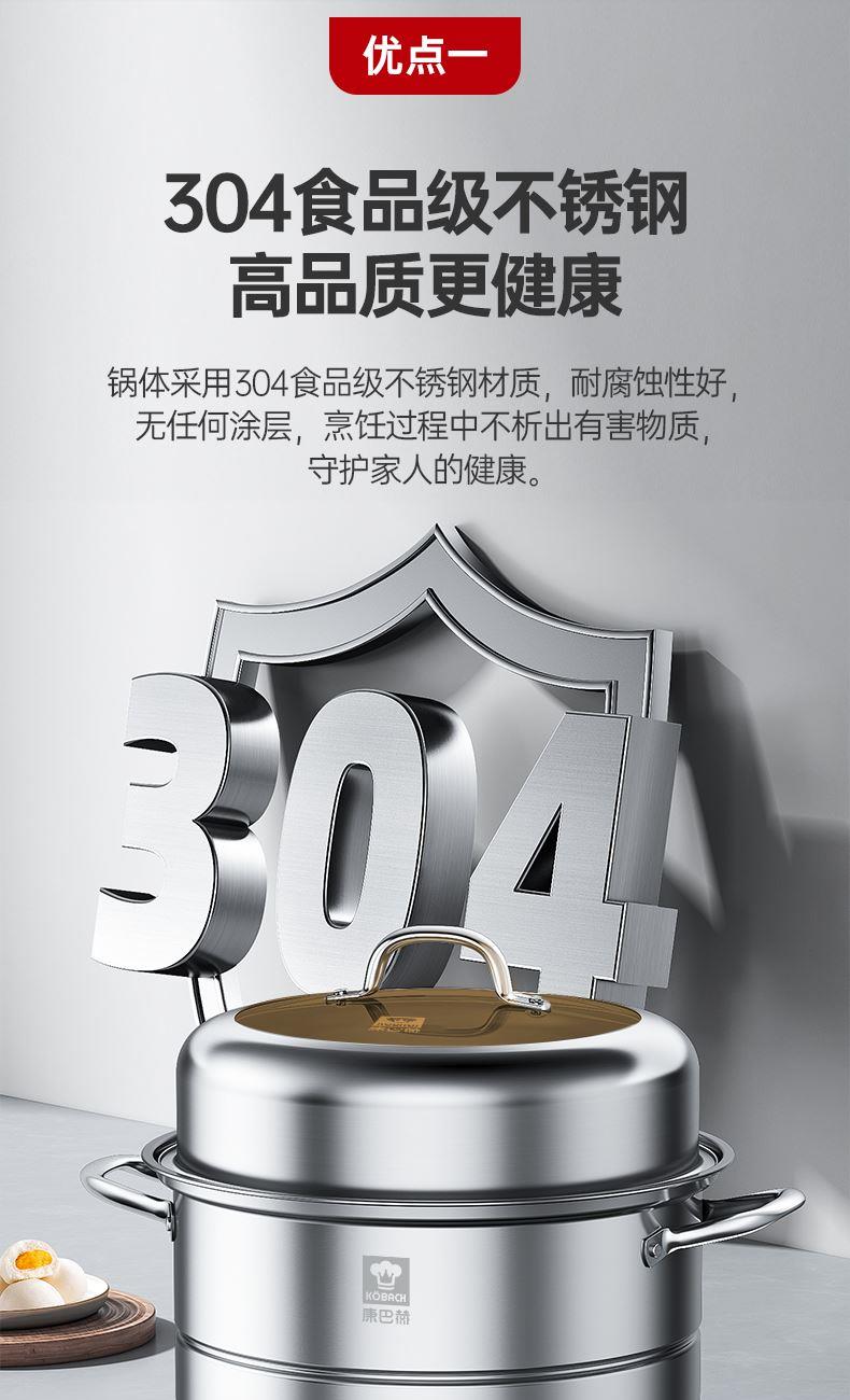 ◎康巴赫不锈钢蒸锅精选 304 食品级不锈钢,符合质量标准,耐腐蚀不易生锈,让烹饪远离重金属危险;