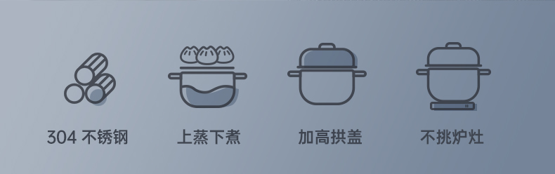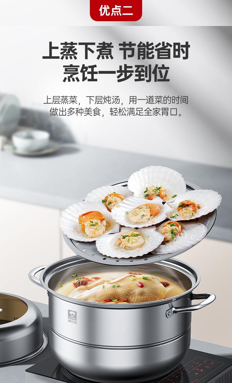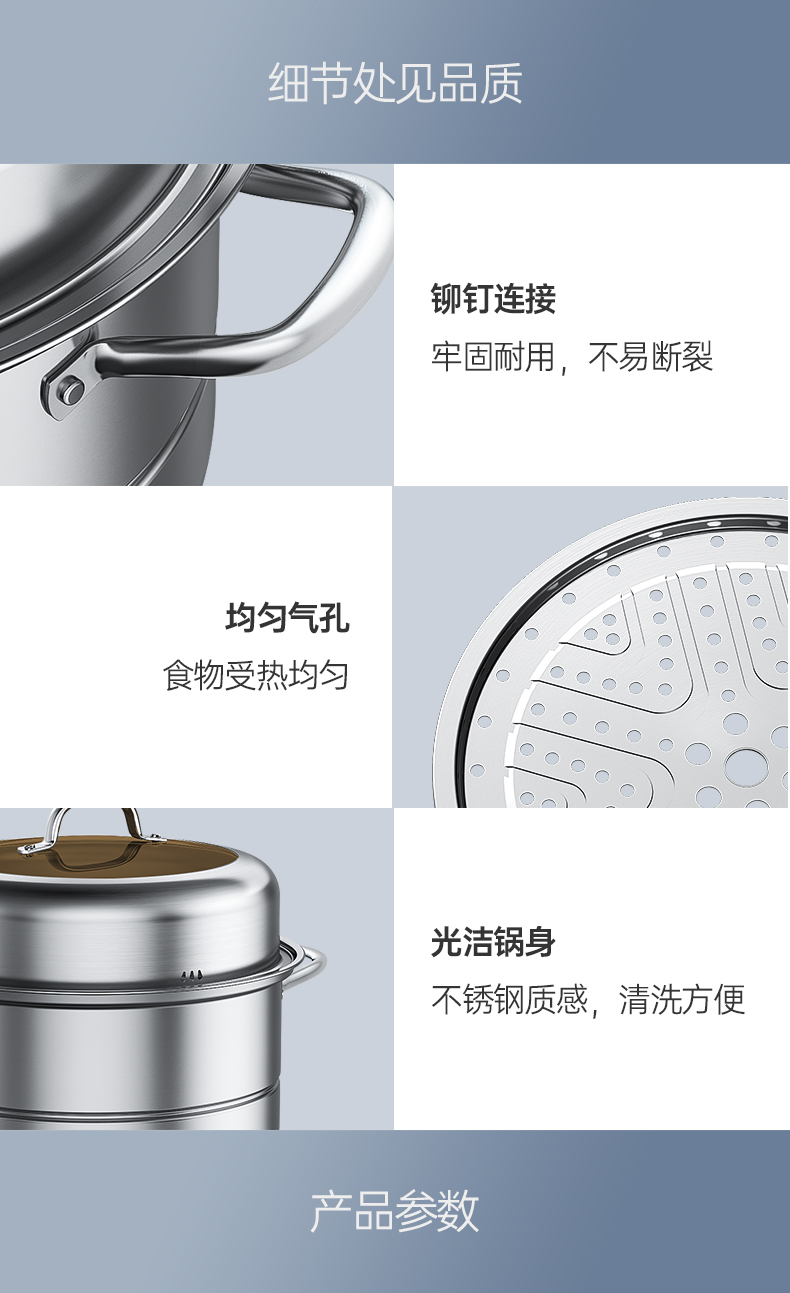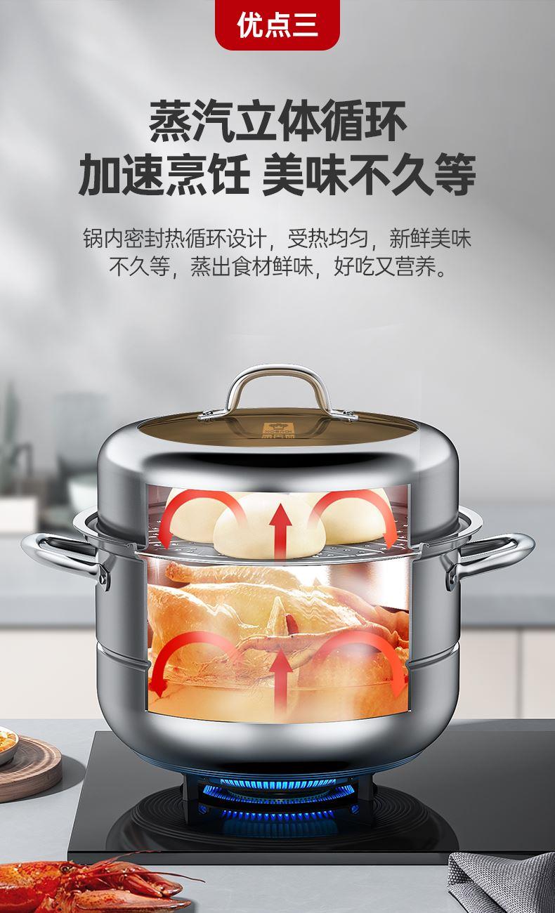 ◎套叠收纳,精巧利用空间:巧妙套叠设计,锅身可收纳进蒸展内,释放厨房空间。◎三层复合锅底,导热快速不挑灶:锅底采用三层复合结构,导热快速均匀,高效节能。兼容多种灶具,不挑炉灶随心烹饪。