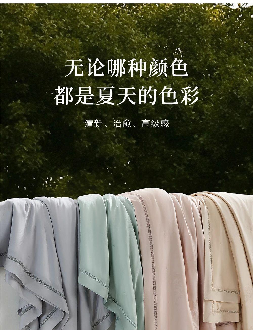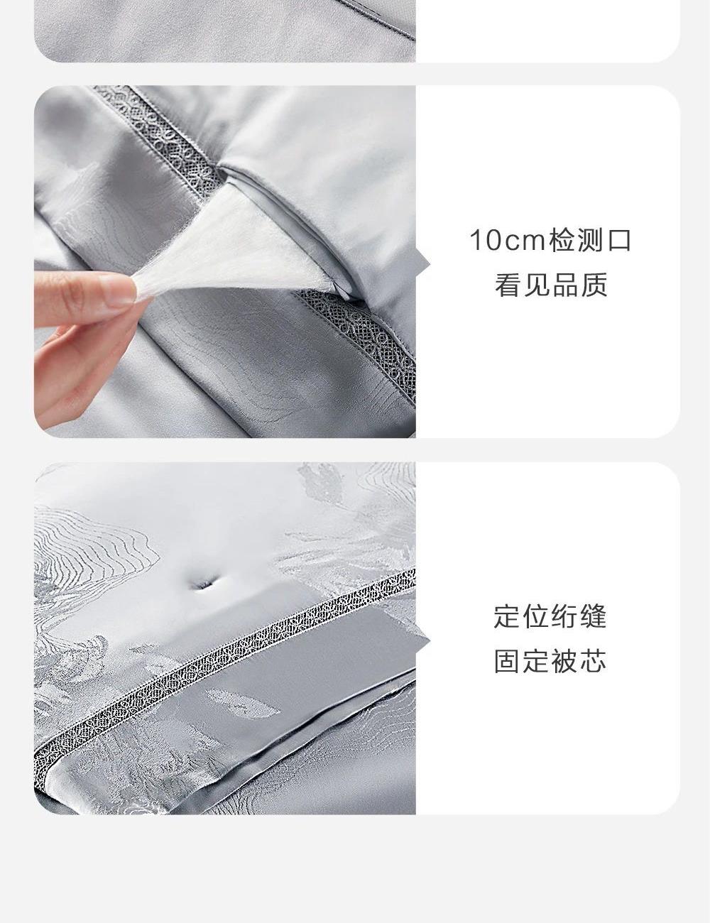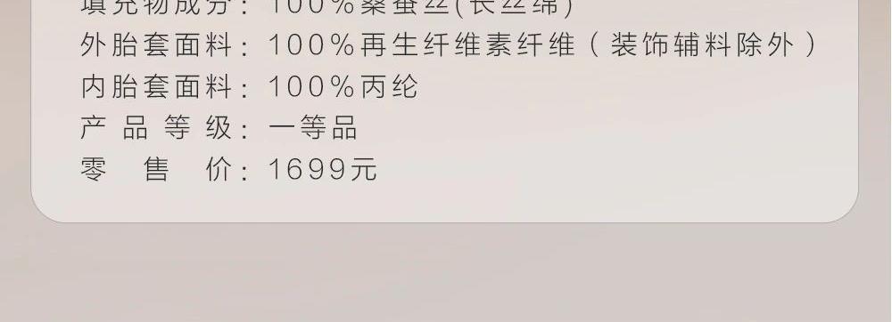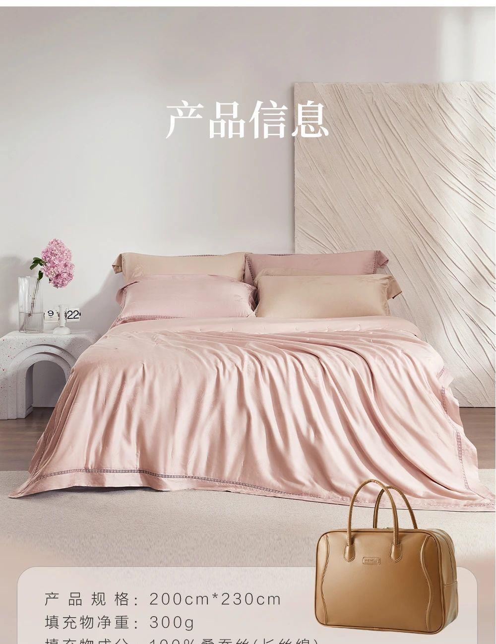 规 格: 面料:胎套面料:100再生纤维素纤 维(装饰辅料除外) 填充物成分:100桑蚕丝(长丝绵) 尺寸:300g/200cm ×230cm 颜色:青灰色/水绿色/雾粉色/浅金色 推荐理由:该夏被胎套面料加入了燕窝蛋白,具有补水保湿、抗氧hua功效,尤其适合皮肤容易干燥、高温日晒的夏季。选用 100桑蚕丝(长丝绵)填充,亲肤舒适,双向调温,久睡不粘,同时,胎套面料选用兰精天丝,具有顺滑如瀑、柔软细腻、亲肤透气等特性 且自带光泽感,满足消费者对夏季舒适睡眠的需求