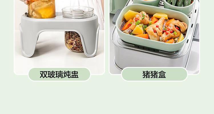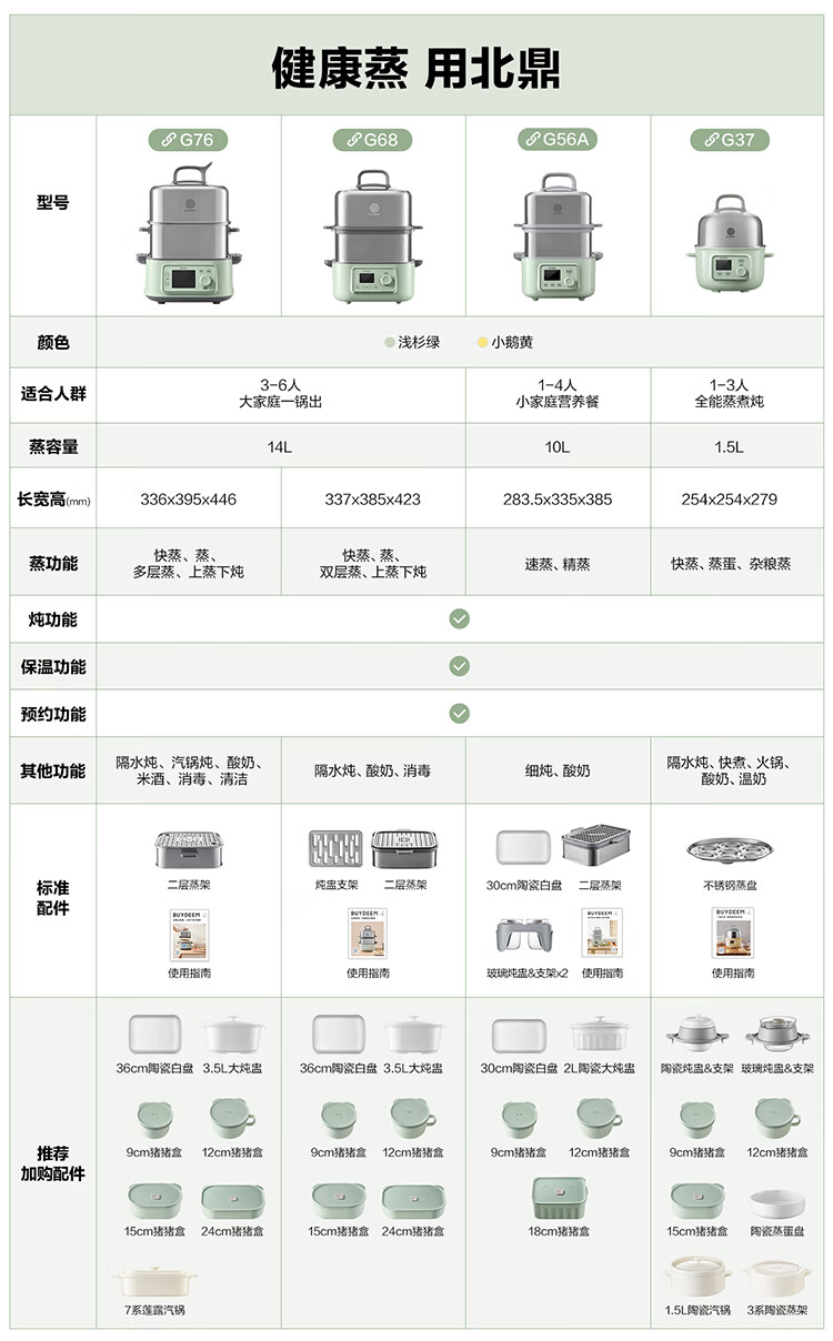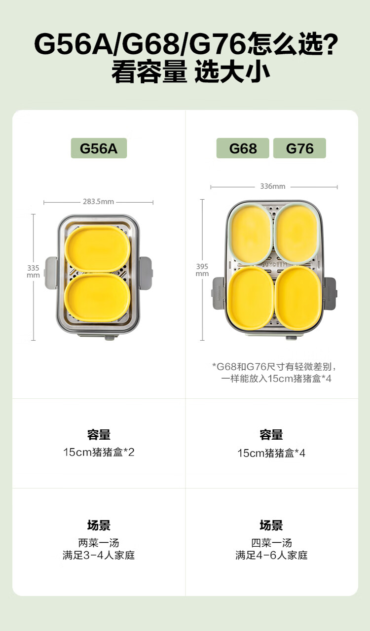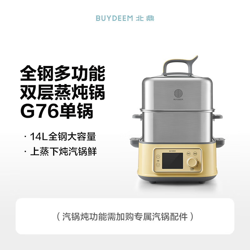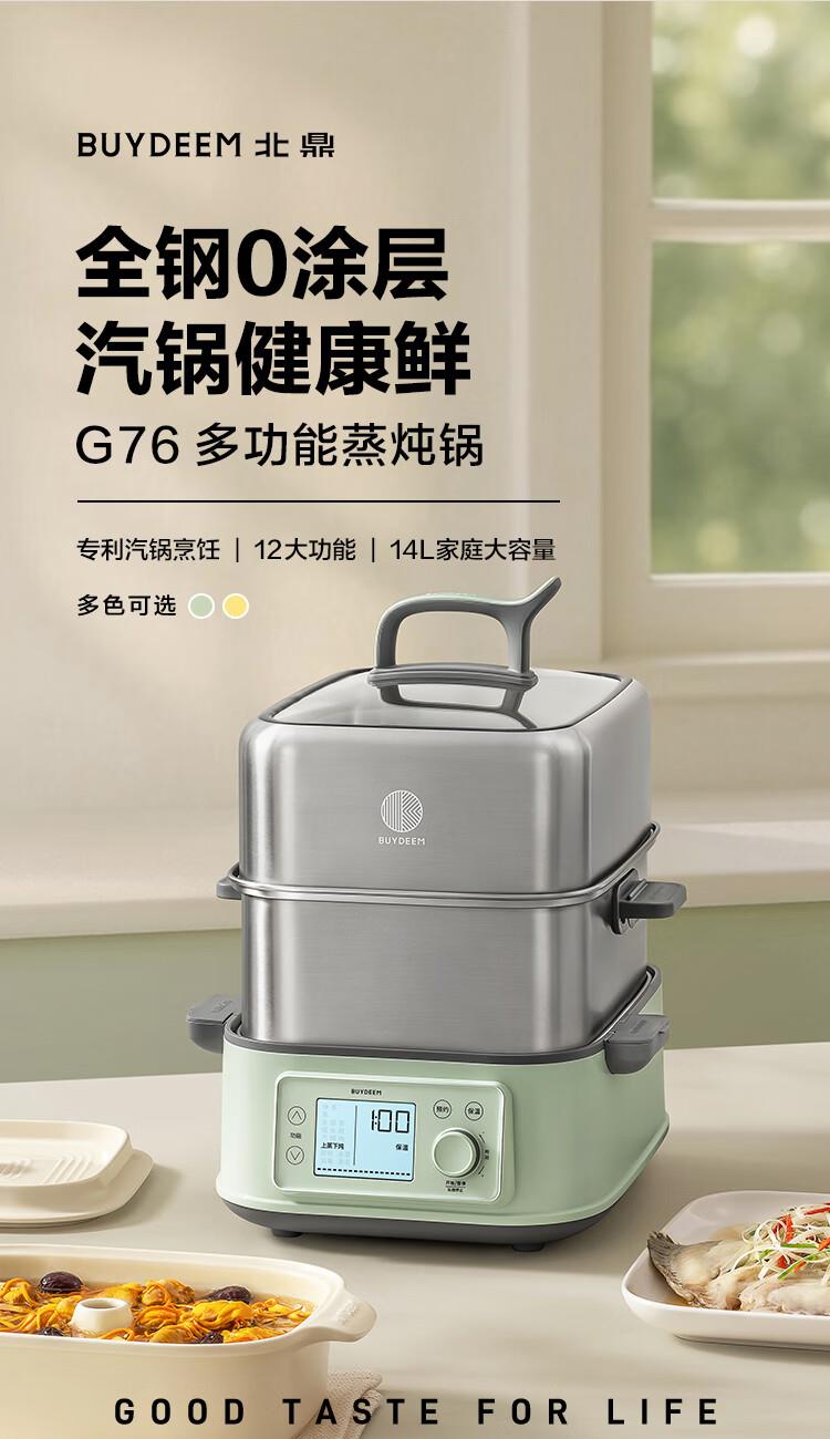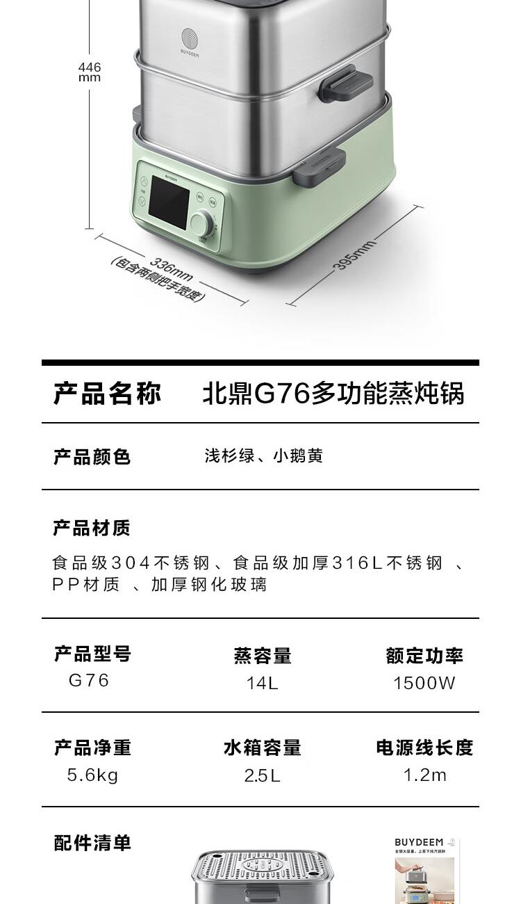 型号:G76 颜色:浅杉绿/小鹅黄 容量: 14L 功率: 1500w 净重:5.6kg 材质:食品级304不锈钢、食品级加厚316L不锈钢、 PP塑料、加厚钢化玻璃 彩盒尺寸:431*344*381mm 箱装数: 1台 配件清单:,二层蒸架*1 ,使用指南*1 产品卖点 1.超大容量 ,可满足3-6口人大家庭 ,一锅搞定全家饭; 2.高温大火 ,速蒸锁鲜 ,保留食材原汁原味; 3.1台≥8台 ,12大功能 ,三餐美味一锅搞定; 4.可上下同蒸、上蒸下炖 ,加高立体蒸; 5.全自动 ,免看火 ,可定时 ,可预约; 6.三重保险防干烧 ,安全更放心;