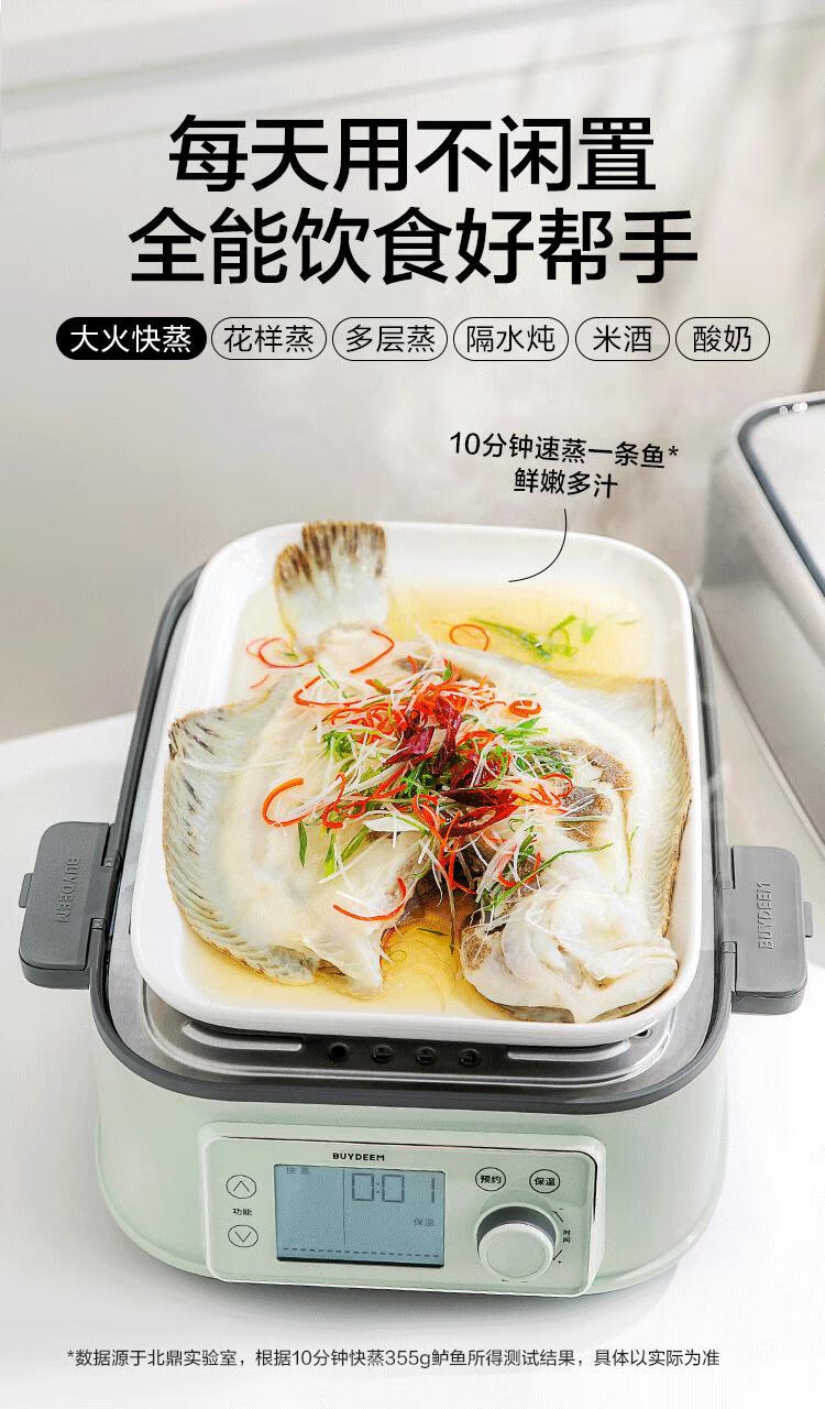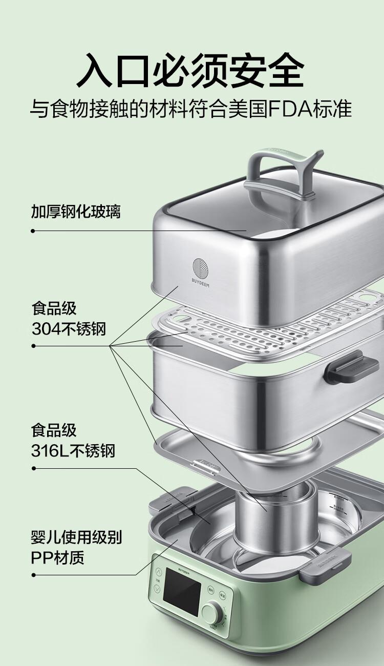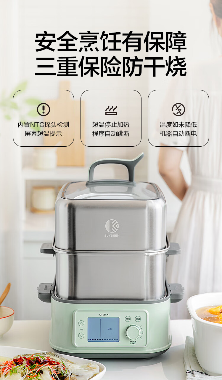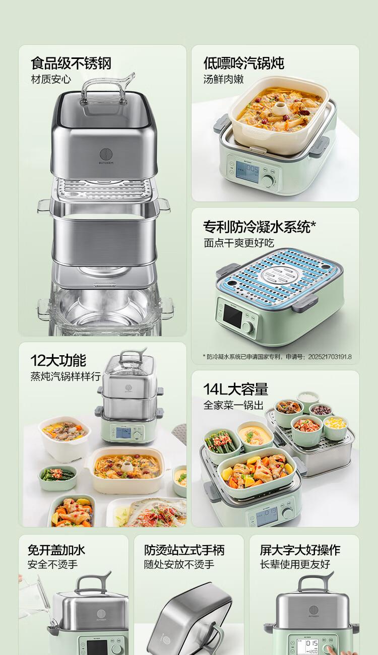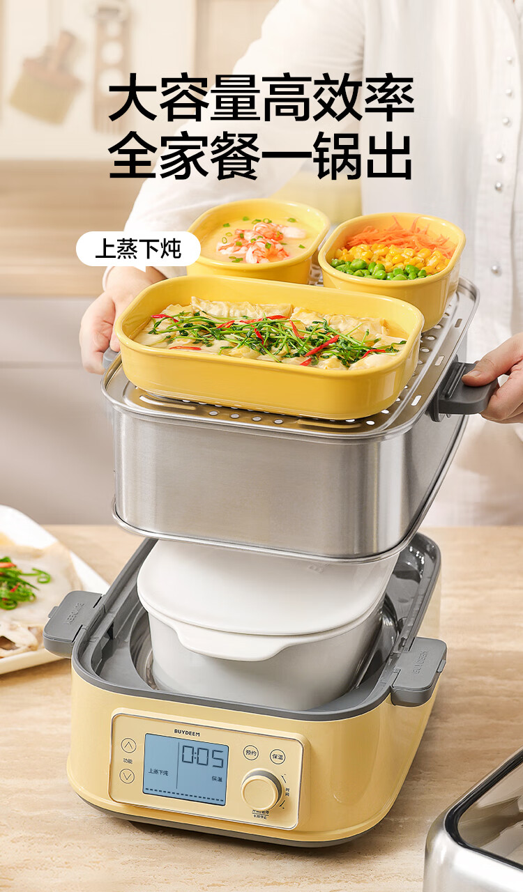 型号:G76 颜色:浅杉绿/小鹅黄 容量: 14L 功率: 1500w 净重:5.6kg 材质:食品级304不锈钢、食品级加厚316L不锈钢、 PP塑料、加厚钢化玻璃 彩盒尺寸:431*344*381mm 箱装数: 1台 配件清单:,二层蒸架*1 ,使用指南*1 产品卖点 1.超大容量 ,可满足3-6口人大家庭 ,一锅搞定全家饭; 2.高温大火 ,速蒸锁鲜 ,保留食材原汁原味; 3.1台≥8台 ,12大功能 ,三餐美味一锅搞定; 4.可上下同蒸、上蒸下炖 ,加高立体蒸; 5.全自动 ,免看火 ,可定时 ,可预约; 6.三重保险防干烧 ,安全更放心;
