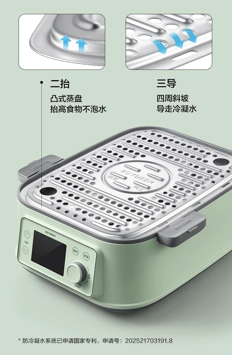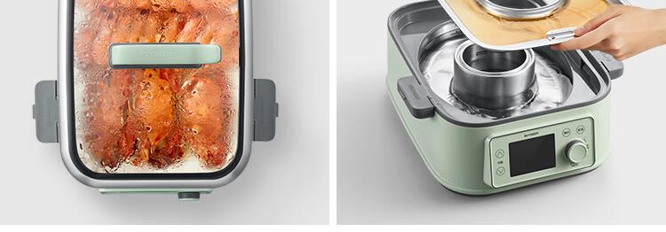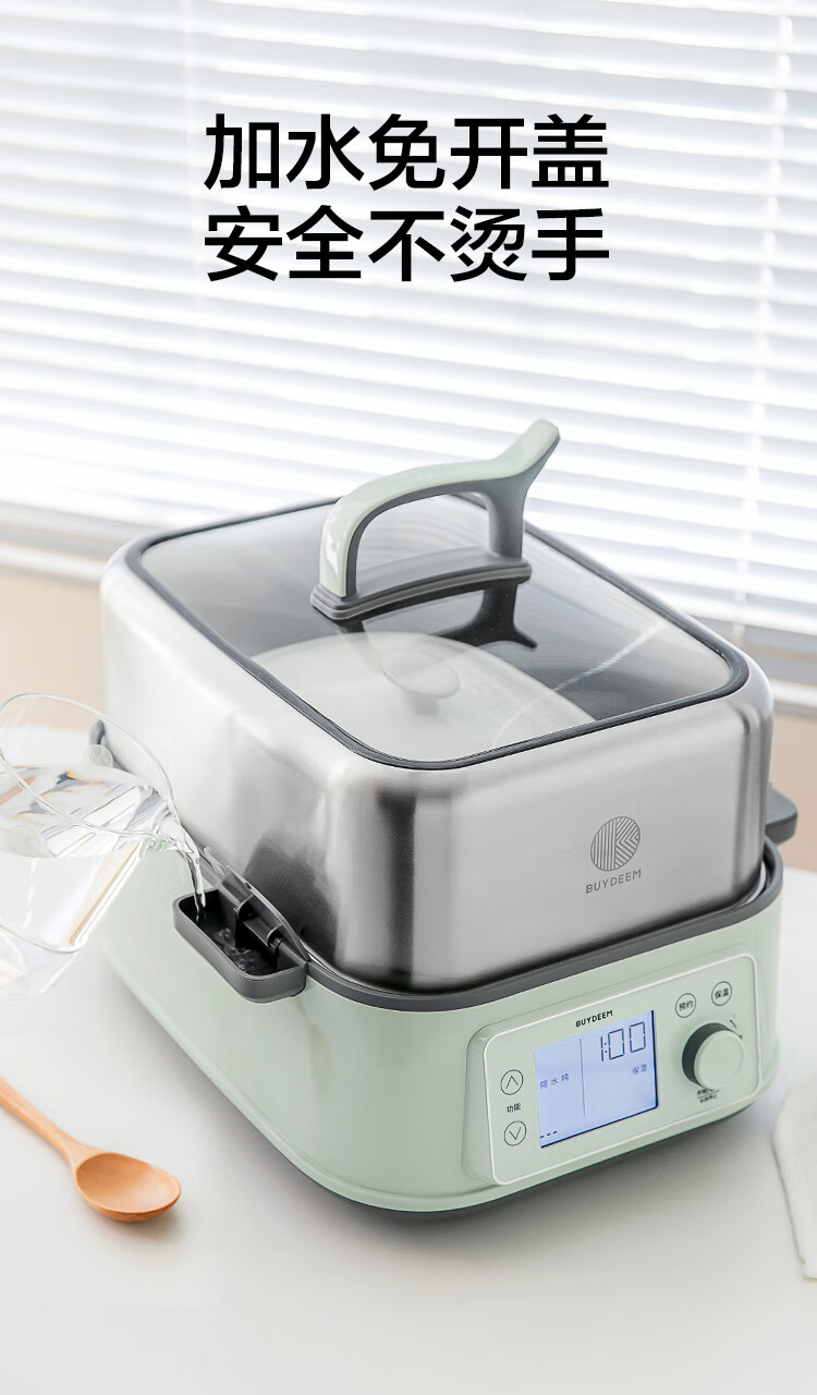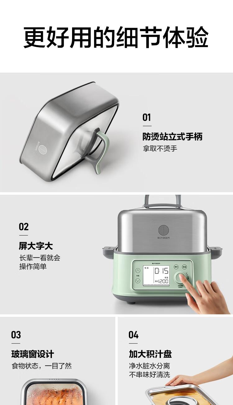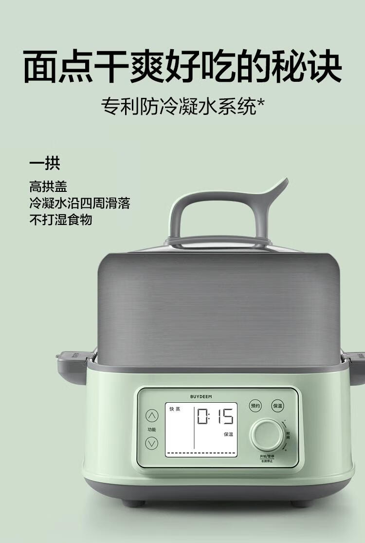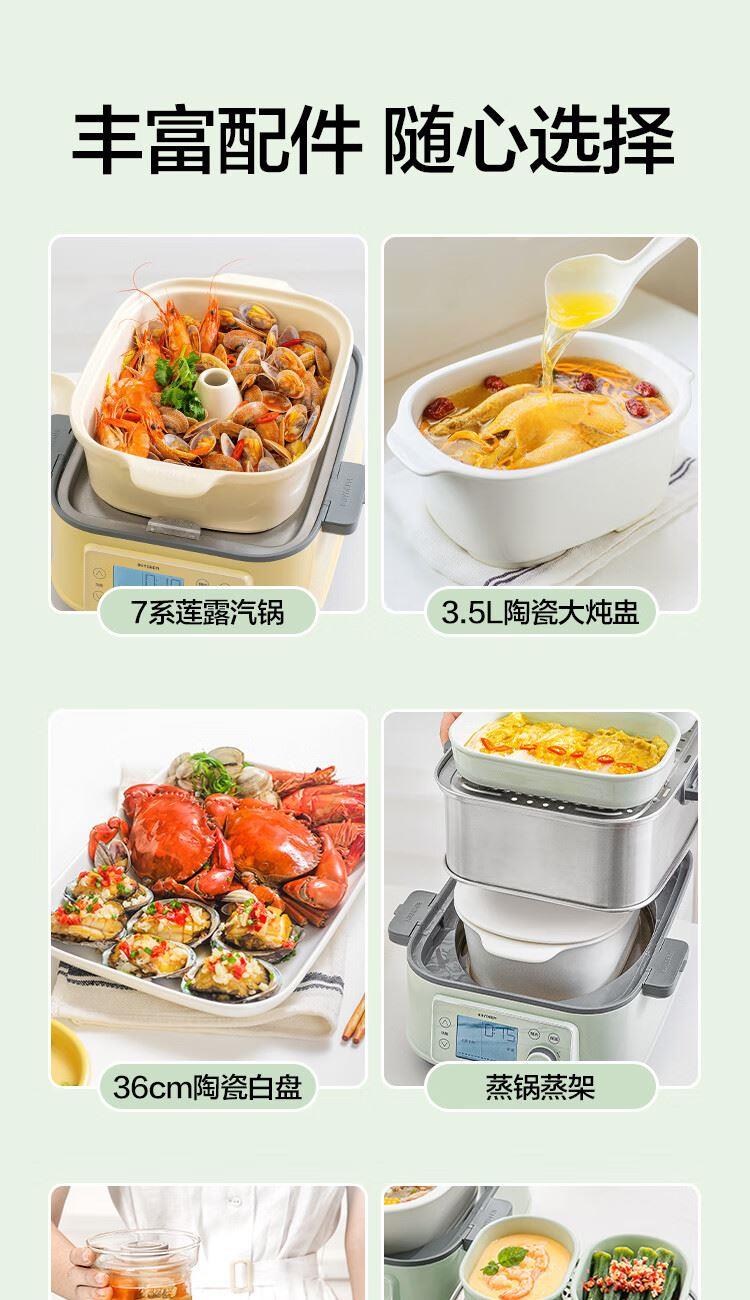 型号:G76 颜色:浅杉绿/小鹅黄 容量: 14L 功率: 1500w 净重:5.6kg 材质:食品级304不锈钢、食品级加厚316L不锈钢、 PP塑料、加厚钢化玻璃 彩盒尺寸:431*344*381mm 箱装数: 1台 配件清单:,二层蒸架*1 ,使用指南*1 产品卖点 1.超大容量 ,可满足3-6口人大家庭 ,一锅搞定全家饭; 2.高温大火 ,速蒸锁鲜 ,保留食材原汁原味; 3.1台≥8台 ,12大功能 ,三餐美味一锅搞定; 4.可上下同蒸、上蒸下炖 ,加高立体蒸; 5.全自动 ,免看火 ,可定时 ,可预约; 6.三重保险防干烧 ,安全更放心;