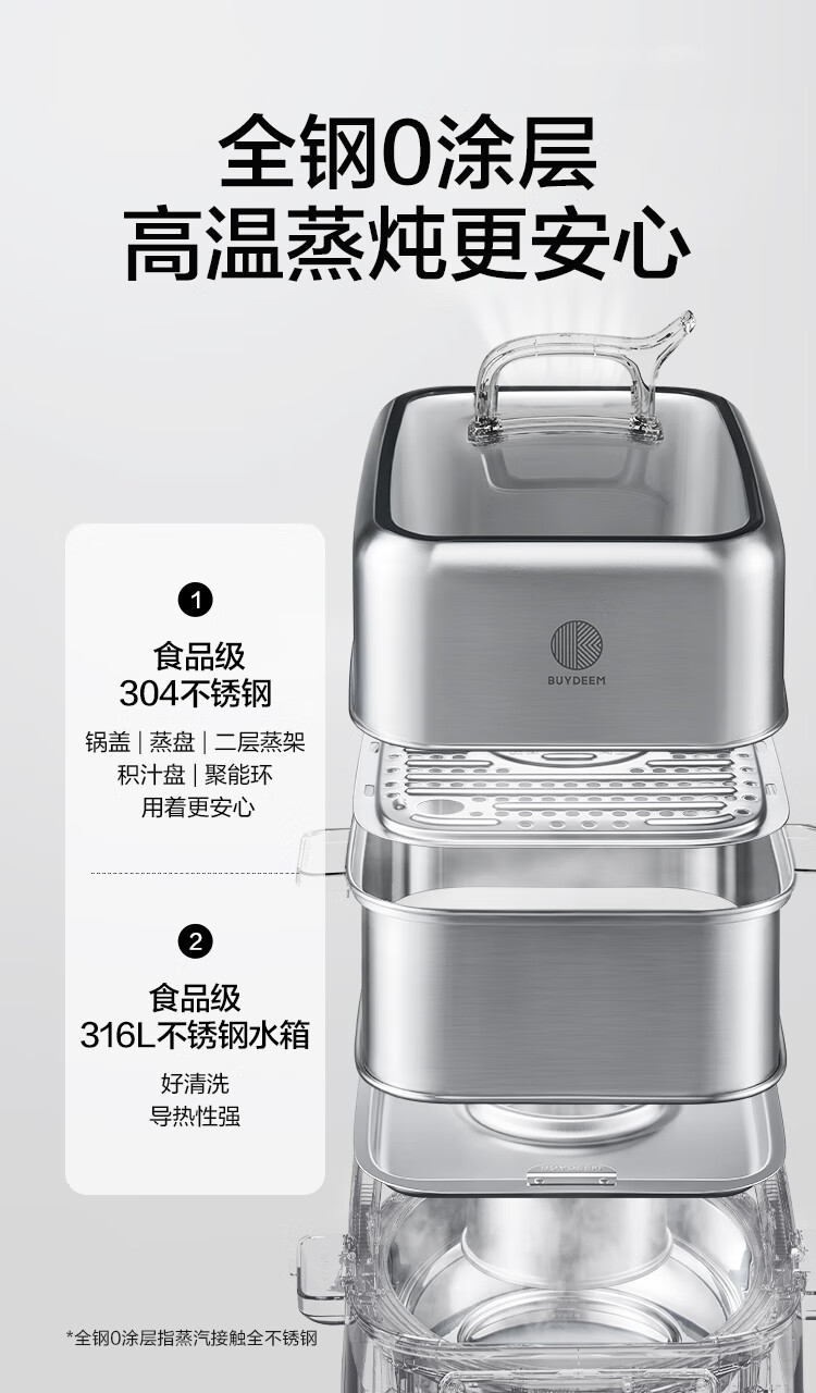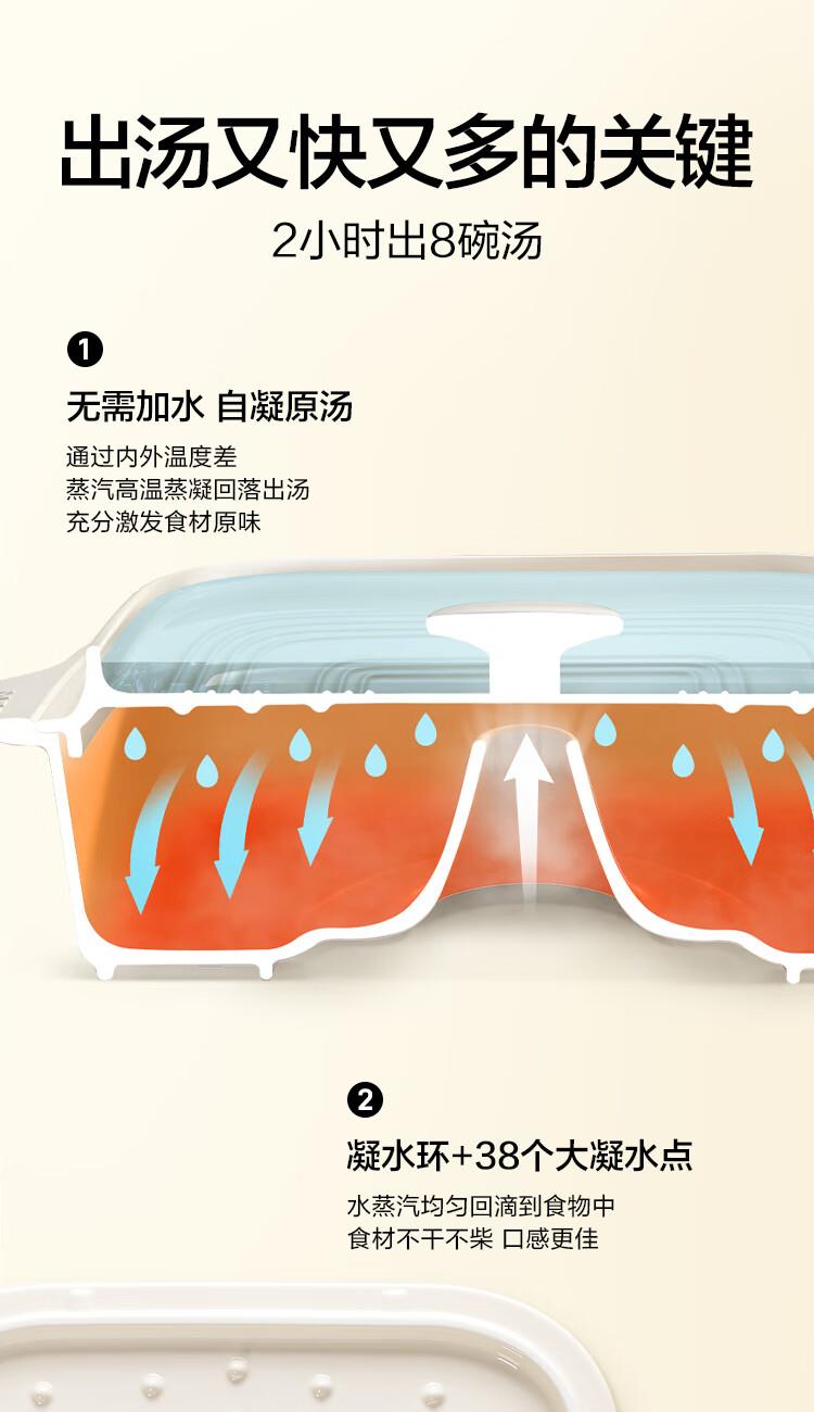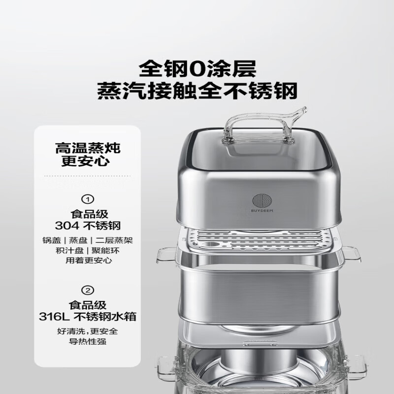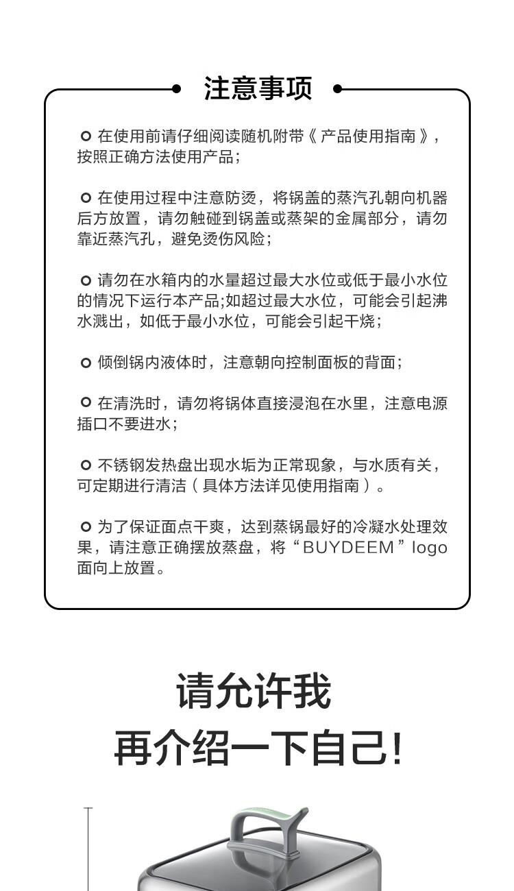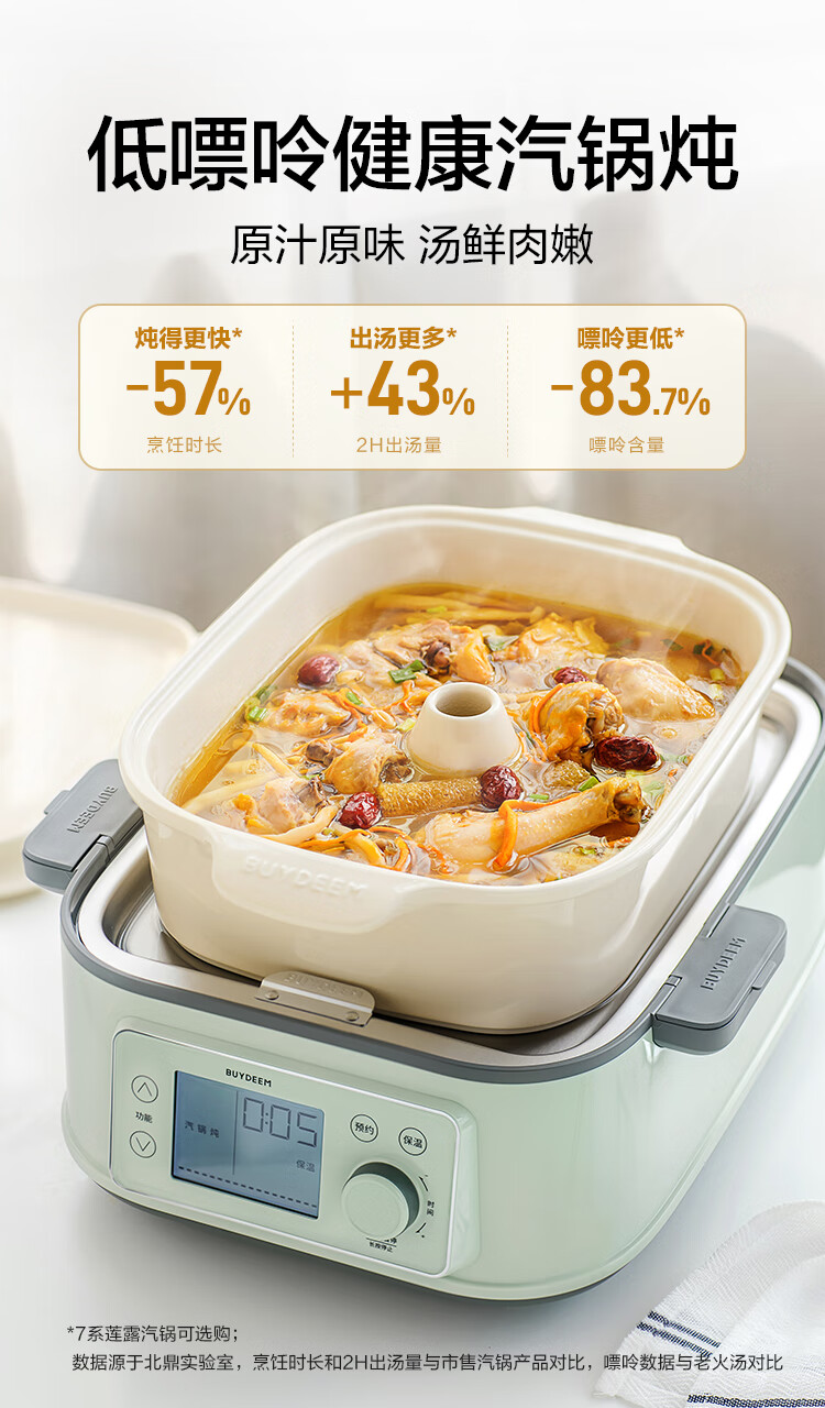 型号:G76 颜色:浅杉绿/小鹅黄 容量: 14L 功率: 1500w 净重:5.6kg 材质:食品级304不锈钢、食品级加厚316L不锈钢、 PP塑料、加厚钢化玻璃 彩盒尺寸:431*344*381mm 箱装数: 1台 配件清单:,二层蒸架*1 ,使用指南*1 产品卖点 1.超大容量 ,可满足3-6口人大家庭 ,一锅搞定全家饭; 2.高温大火 ,速蒸锁鲜 ,保留食材原汁原味; 3.1台≥8台 ,12大功能 ,三餐美味一锅搞定; 4.可上下同蒸、上蒸下炖 ,加高立体蒸; 5.全自动 ,免看火 ,可定时 ,可预约; 6.三重保险防干烧 ,安全更放心;