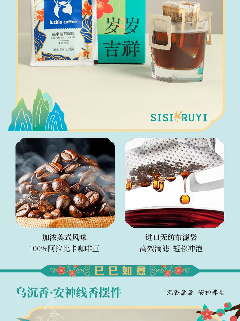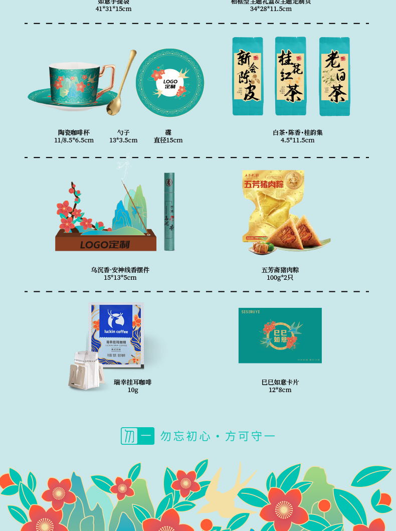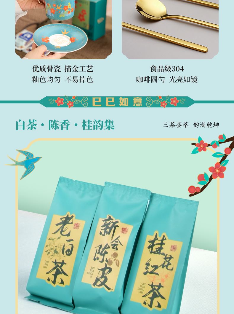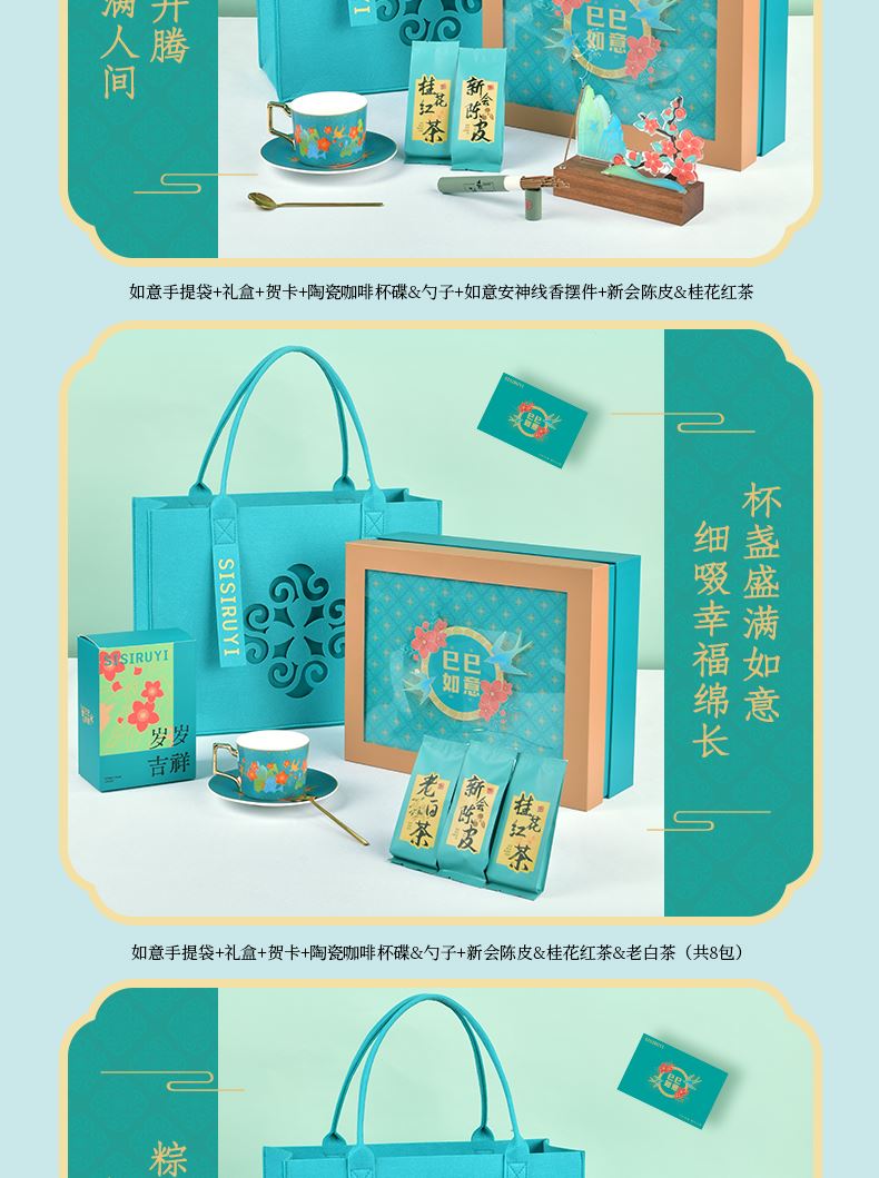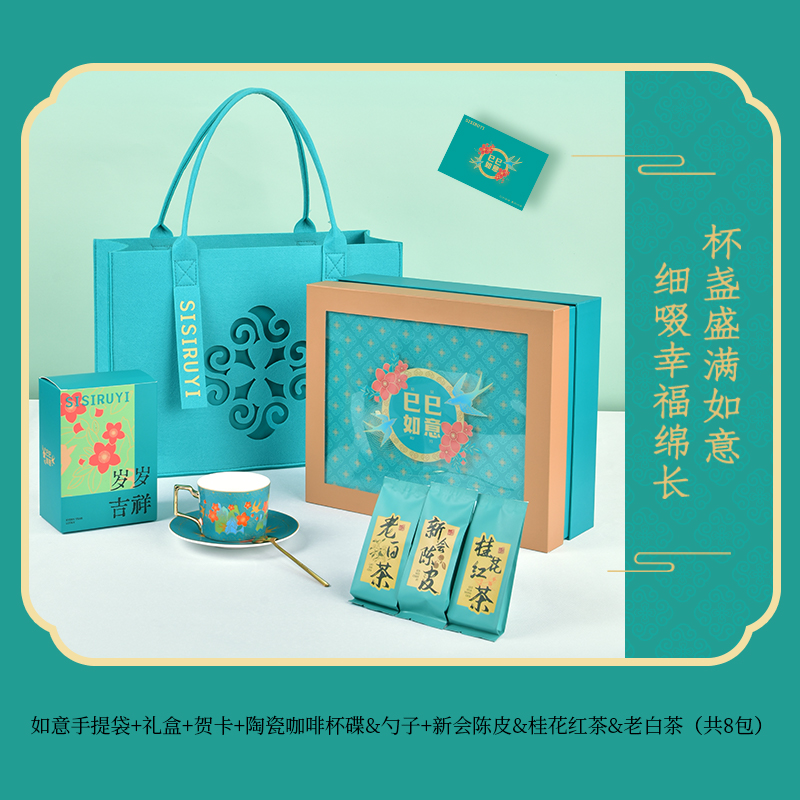 如意毛毡包*1 相框型主题礼盒*扉页*1 精致陶瓷咖啡杯碟&勺子*1 新会5年陈皮*2 桂花红茶*3 老白茶*3 主题贺卡*1 岁岁吉祥包装盒*1