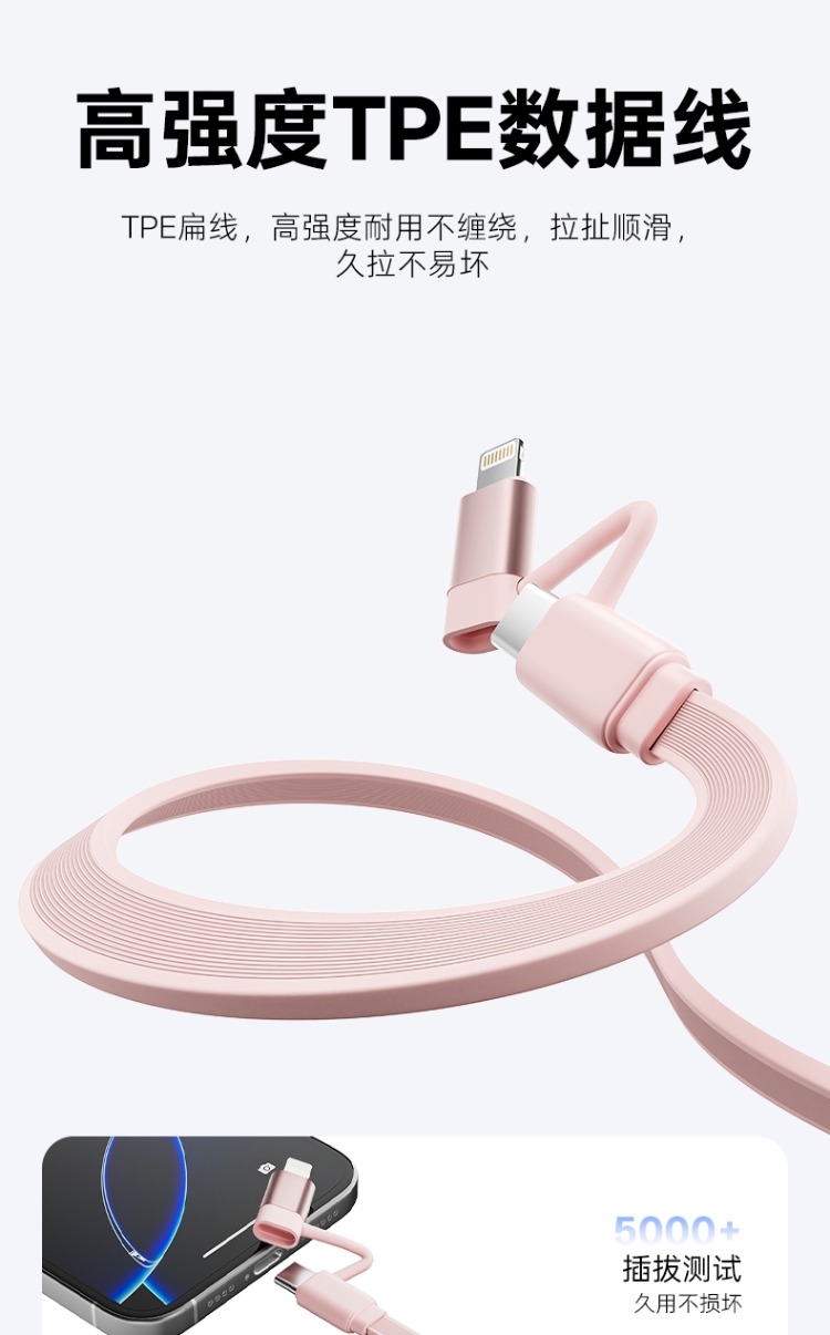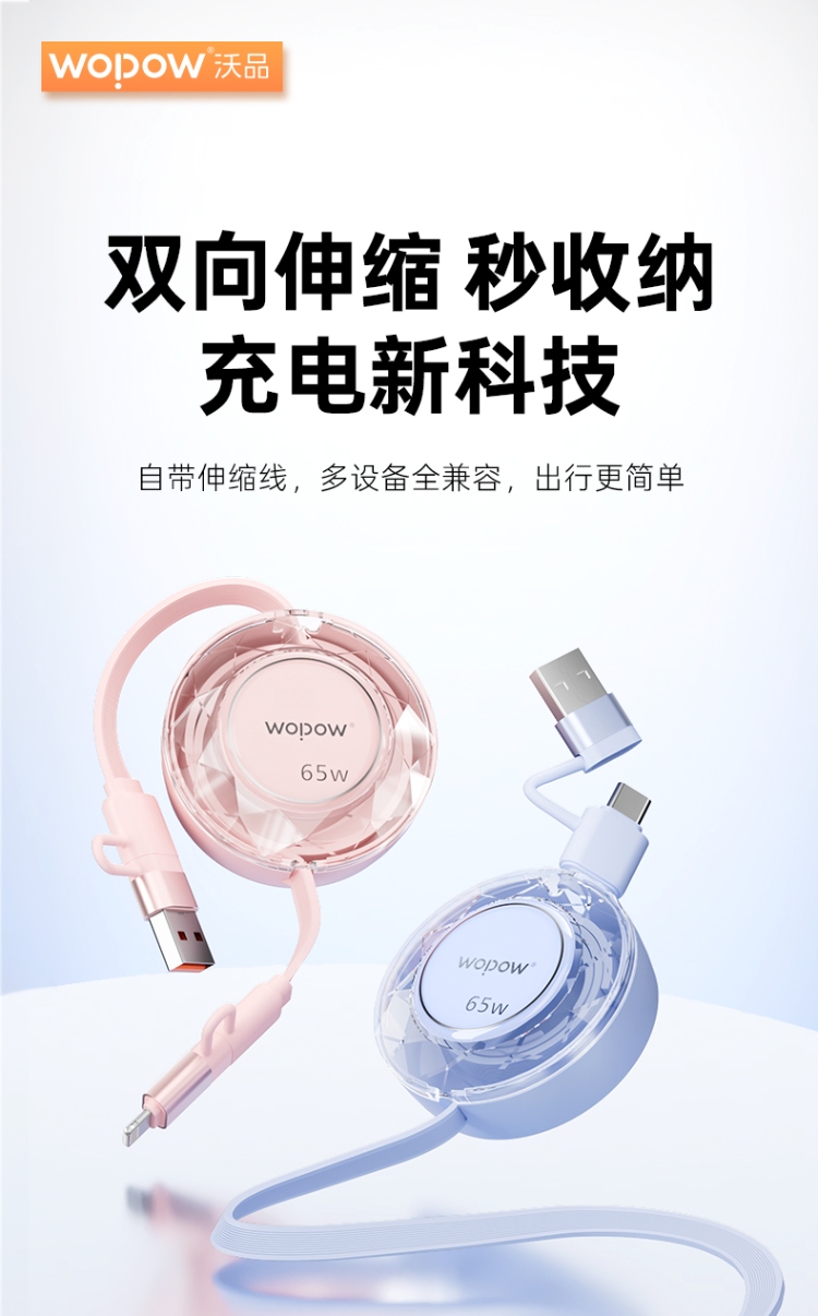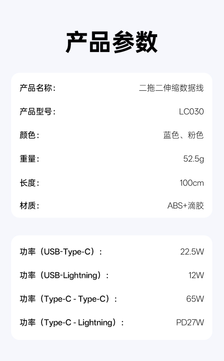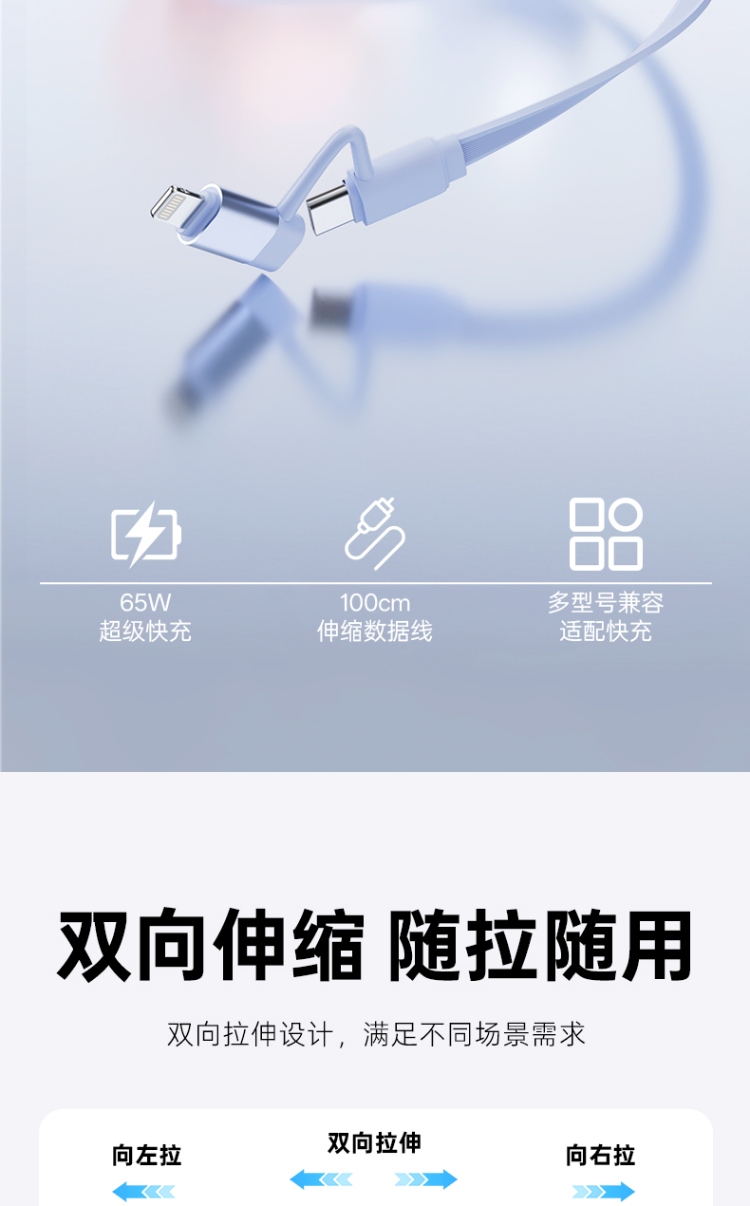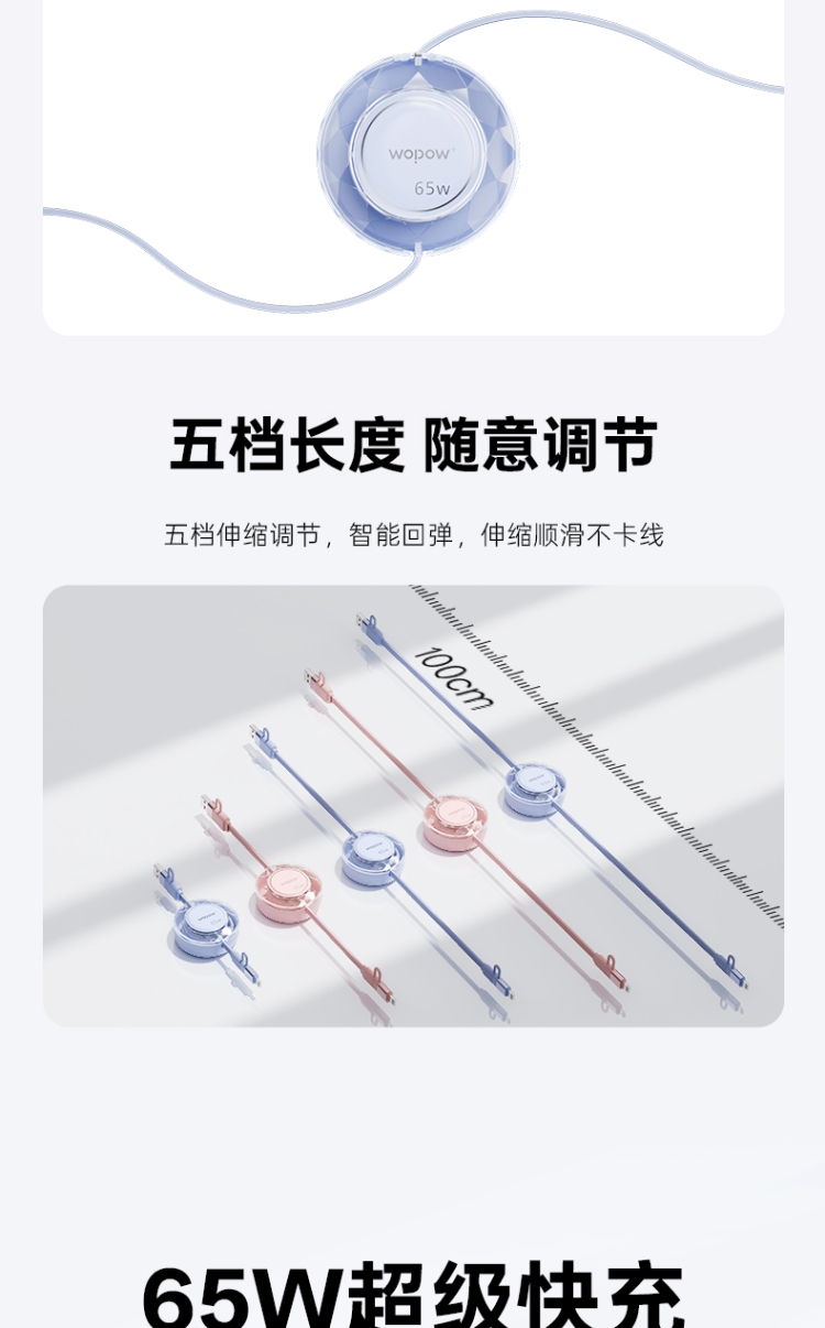 产品尺寸:58*16mm 线长1M 包装尺寸:101.5*176*32mm 产品重量:52.5g 接口:苹果、TYPE_C接口的设备 适用:Apple/Type-c接口手机/平板电子设备颜色:蓝色、粉色 材质:ABS+铝合金+TPE 双向伸缩,便携小巧,多档位调节 钻石切面,绚丽多彩,TPE扁线耐用不缠绕 支持Type-c数据传输,华为65W超级快充, 特性:适用于华为手机65W超级快充,oppo,vivo,苹果,小米,三星等手机,平板,笔记本快速充电