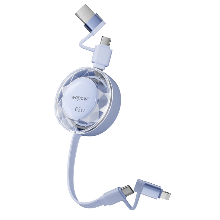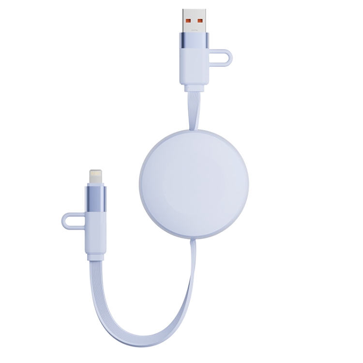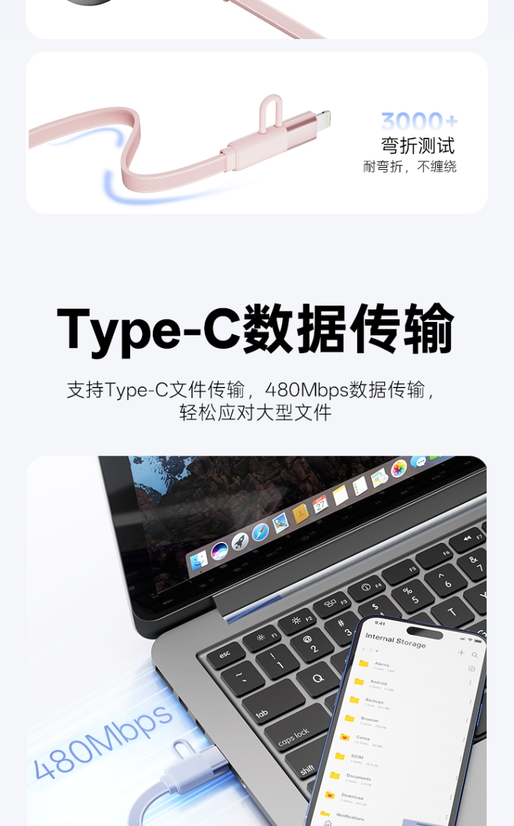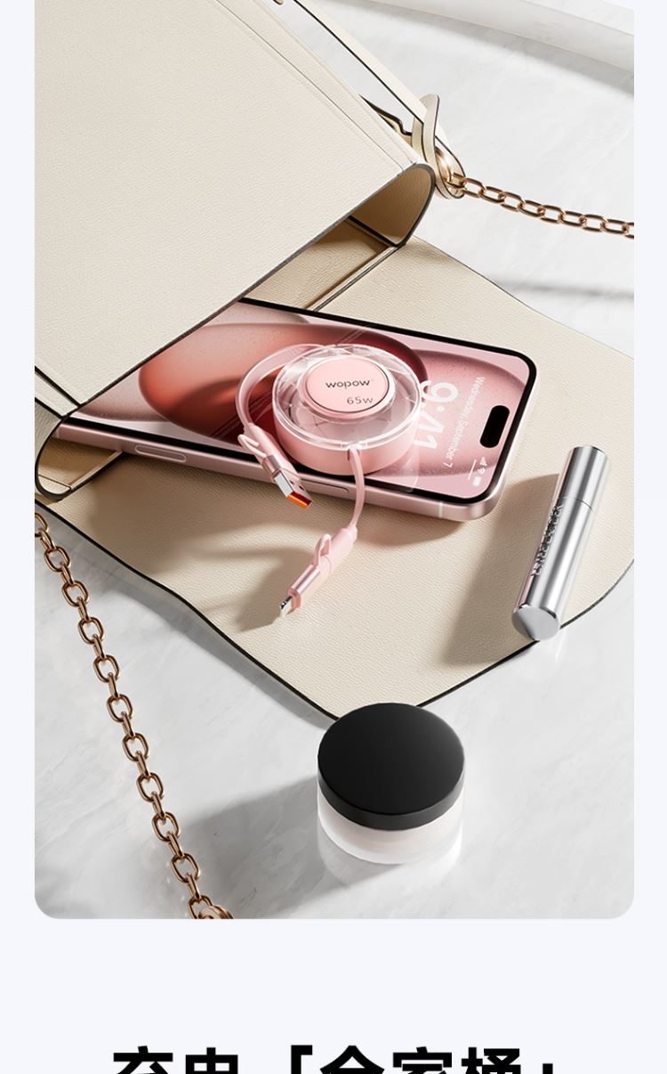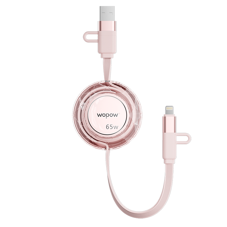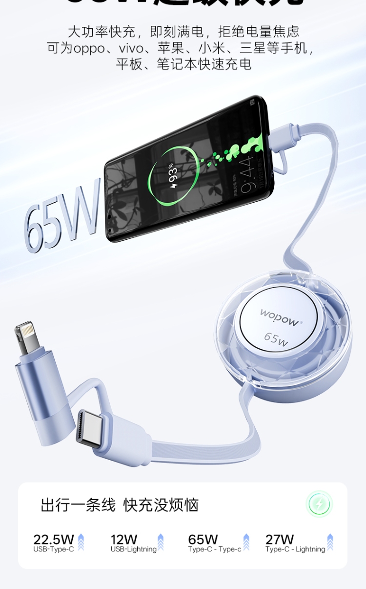 产品尺寸:58*16mm 线长1M 包装尺寸:101.5*176*32mm 产品重量:52.5g 接口:苹果、TYPE_C接口的设备 适用:Apple/Type-c接口手机/平板电子设备颜色:蓝色、粉色 材质:ABS+铝合金+TPE 双向伸缩,便携小巧,多档位调节 钻石切面,绚丽多彩,TPE扁线耐用不缠绕 支持Type-c数据传输,华为65W超级快充, 特性:适用于华为手机65W超级快充,oppo,vivo,苹果,小米,三星等手机,平板,笔记本快速充电
