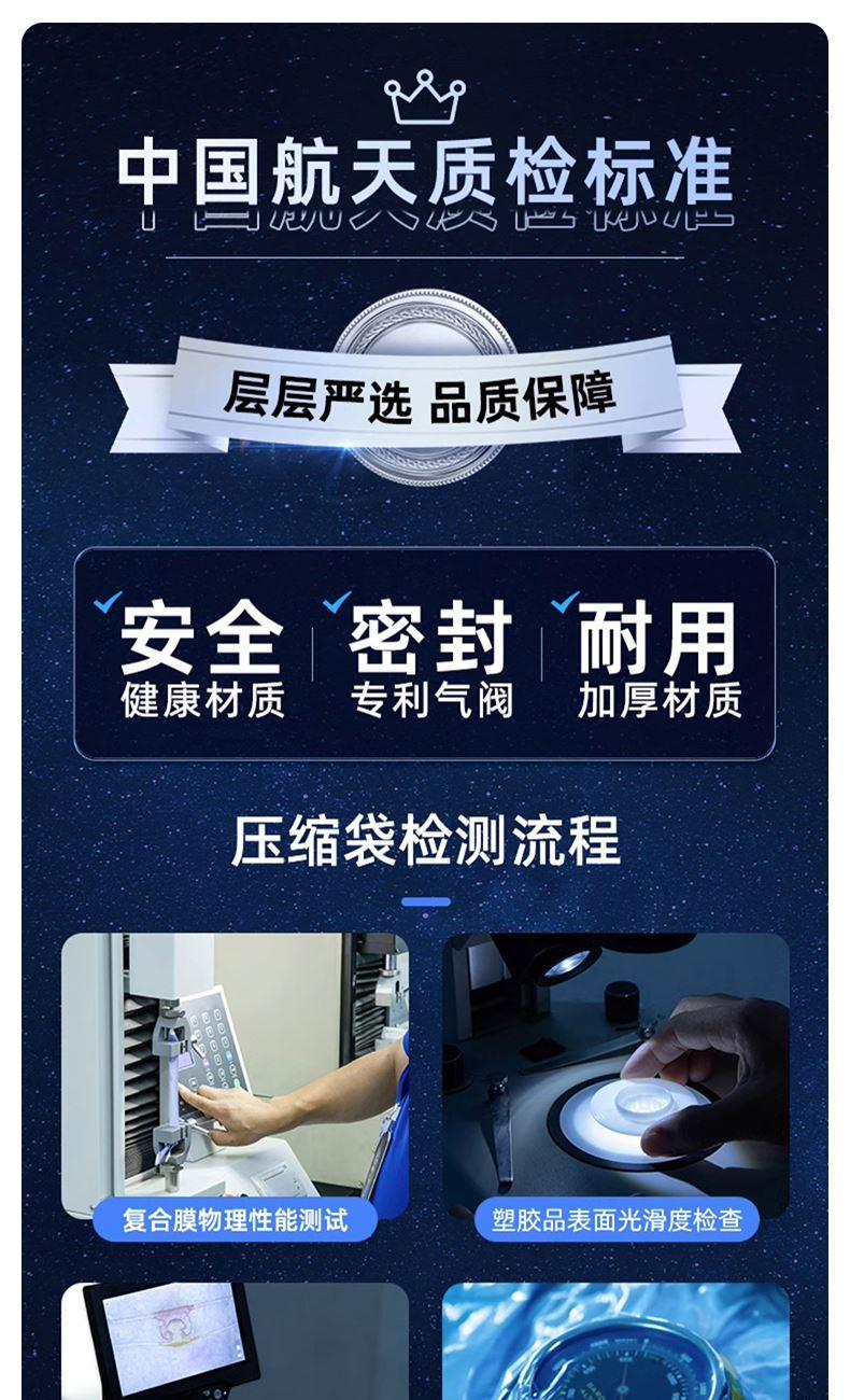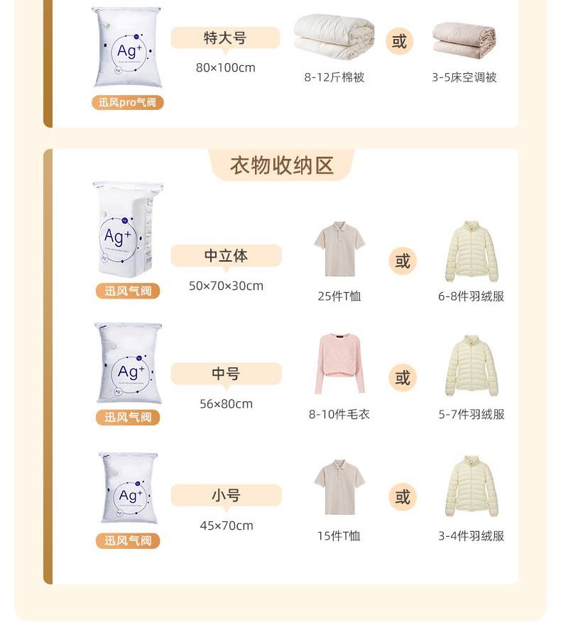 产品尺寸:45*70cm*3个 50*70*30cm*3个 厚度:7丝 套装规格:防霉A【被子衣服收纳】2中四立方+4中立体【可装40件毛衣+4床6斤被子】 适用对象:衣服,棉被 封口类型:滑扣式封口 气密性等级:A级 压缩袋个数:6个 防水等级:高度防水 类别:压缩袋 适用场景:卧室,旅行 图案:Ag+ 功能:环保安全 防潮防尘 快速压缩 防异味 防蛀 节省空间 防霉 产品描述:免抽气,真空压缩袋;无需抽气工具,3秒速排;创新气阀,双重密封,严防漏气(密封橡胶塞+按压锁盖结构);回弹效果;5层高分子聚合材料,更耐用;防水、防潮密封不漏;强力承重,无惧破坏;小程序智能管理衣物;