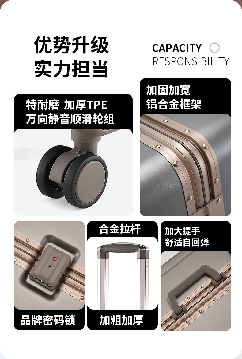 型号:TJ2013 规格:20英寸 材质:PC复合料 里料:涤纶 颜色:矿金色/白色/粉色/蓝色 等级:一等合格品 执行标准:QB/T 2155-2018 产品特点: 1、加厚PC合金外壳及铝框和合页,防刮坚固,耐磨防爆;2、加厚合金伸缩拉杆,拉合顺畅,握感舒适,结实稳固;3、带慢回弹顶部和侧部提手,竖提横提都方便;4、侧部顶脚防剐蹭,同时带方便行李挂架功能;5、内大双网结构,干湿分离,分区合理;6、双嵌入式三码密码锁,安全性高,放心旅行;7、带挡泥板TPE万向静音飞机轮,高承重,肆意而行;8、撞色金属条配饰,美观大方,时尚有质感。