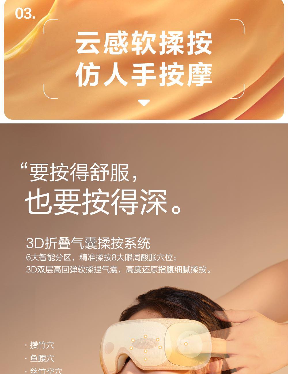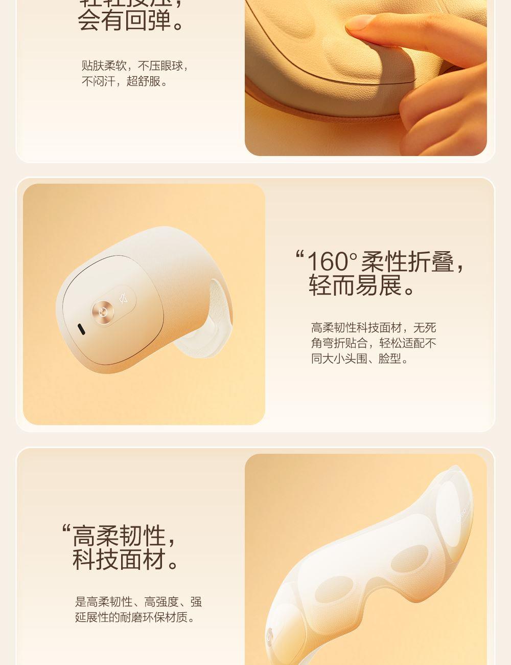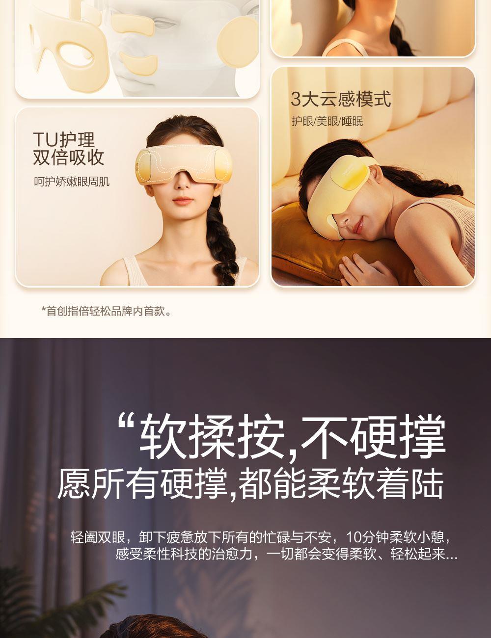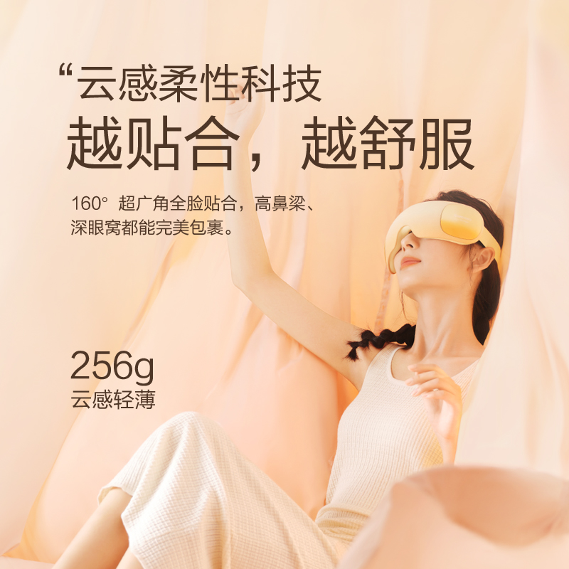 软揉按,不硬撑愿所有硬撑,都能柔软着陆 轻阖双眼,卸下疲惫放下所有的忙碌与不安10分钟,柔软小憩感受柔性软科技的力切都会变得柔软、轻松起来·它不挑脸型每一种脸型都贴合 首创*云感柔性科技160°超广角全脸贴合,包裹眼周轮廓越贴近眼周越舒服,高鼻梁、深眼窝都能包裹