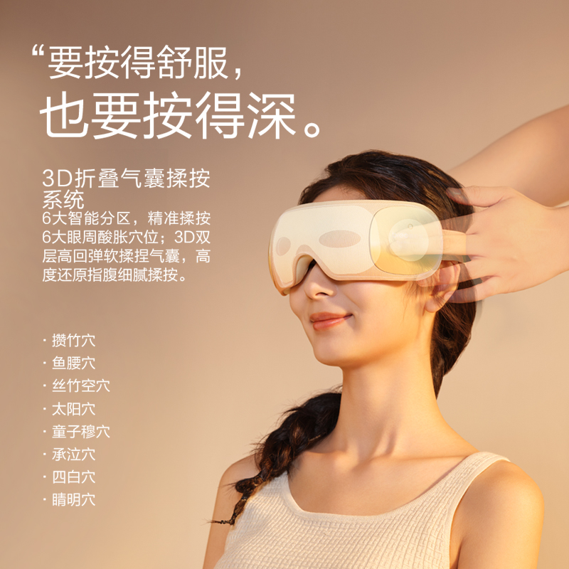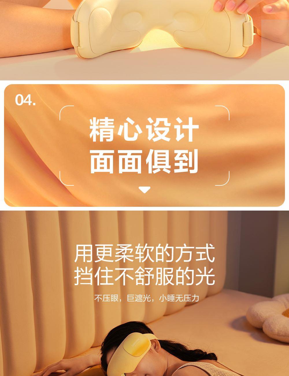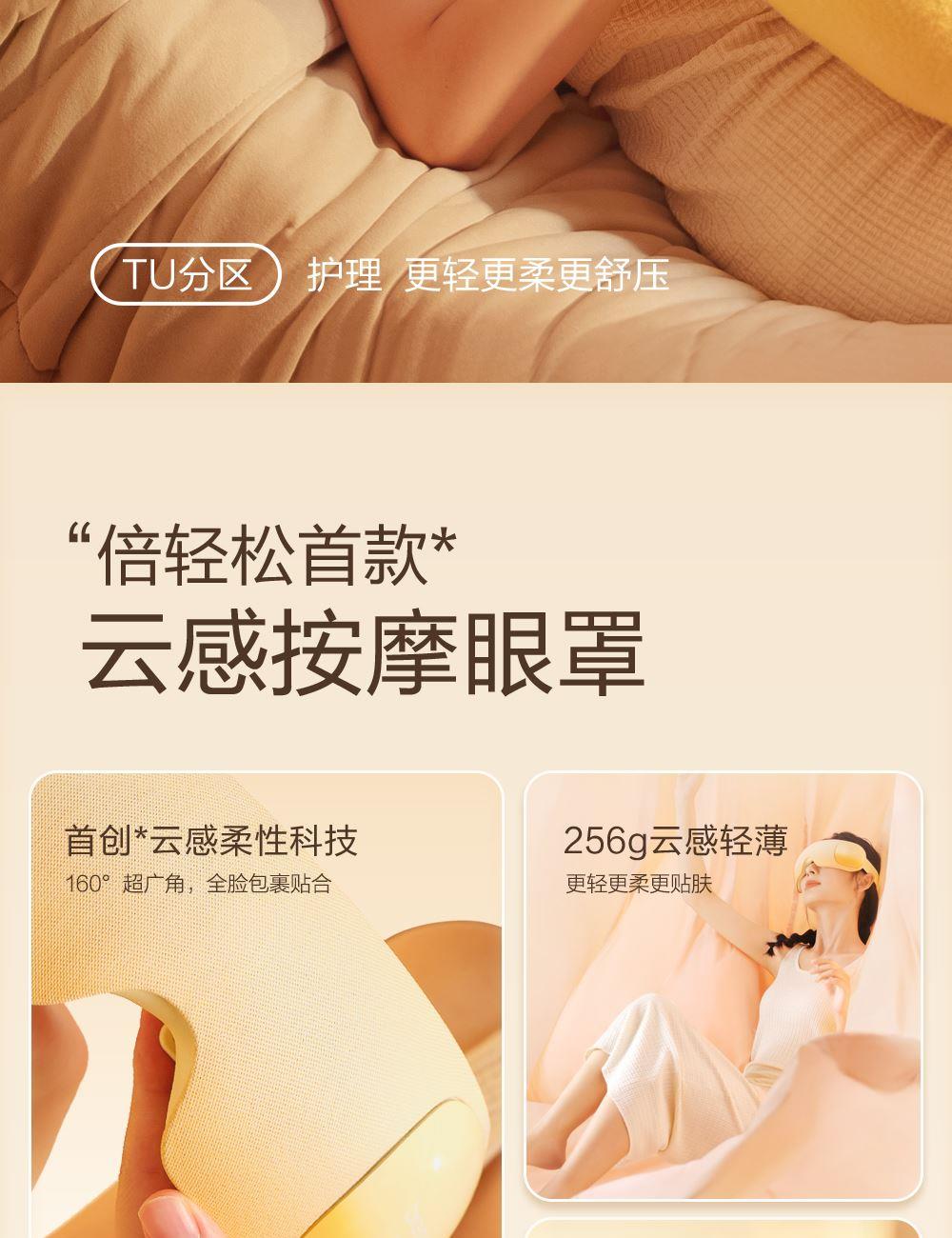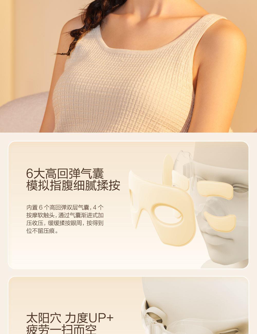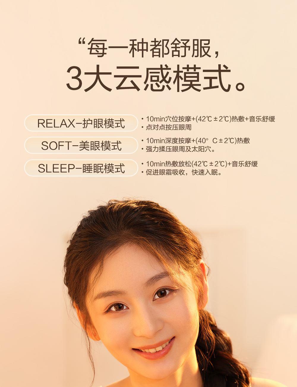 软揉按,不硬撑愿所有硬撑,都能柔软着陆 轻阖双眼,卸下疲惫放下所有的忙碌与不安10分钟,柔软小憩感受柔性软科技的力切都会变得柔软、轻松起来·它不挑脸型每一种脸型都贴合 首创*云感柔性科技160°超广角全脸贴合,包裹眼周轮廓越贴近眼周越舒服,高鼻梁、深眼窝都能包裹