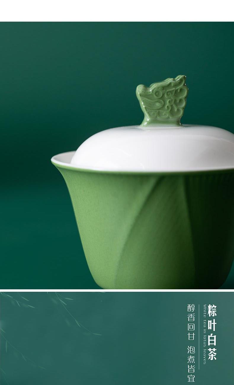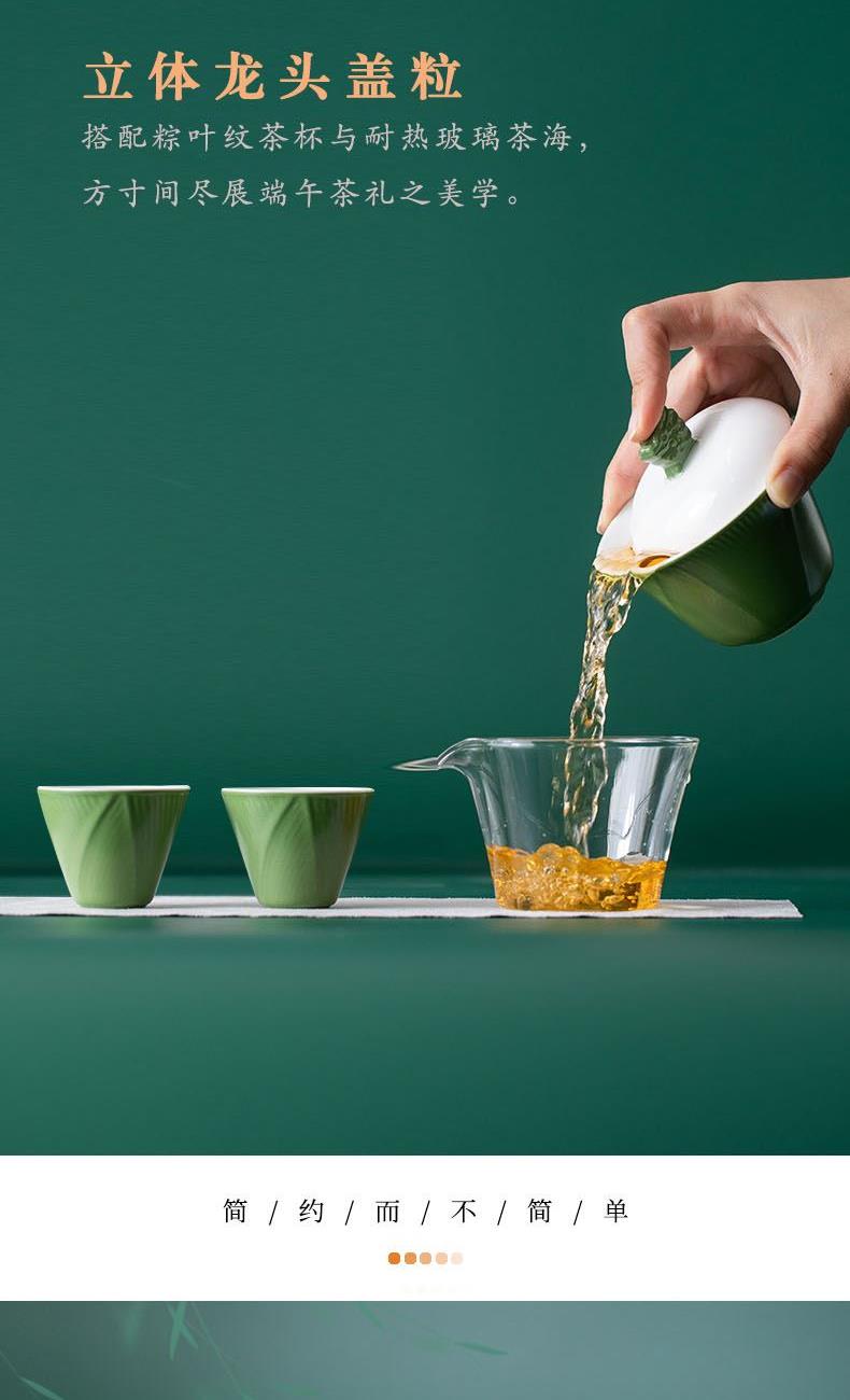 1.立体龙头盖粒设计,搭配粽叶纹茶杯与耐热玻璃茶海,方寸之间尽显端午茶礼的雅致美学。