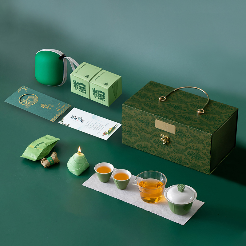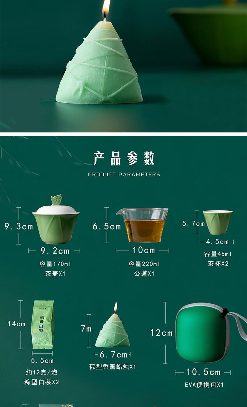 配 置:盖碗和公杯各一个,茶杯两个,粽型香薰蜡烛一个,粽叶包老白茶两泡,茶巾一条,贺卡一张,EVA包一个,含提手彩盒包装。
