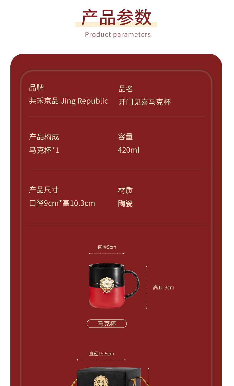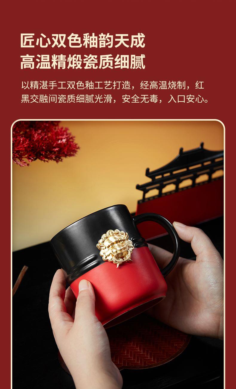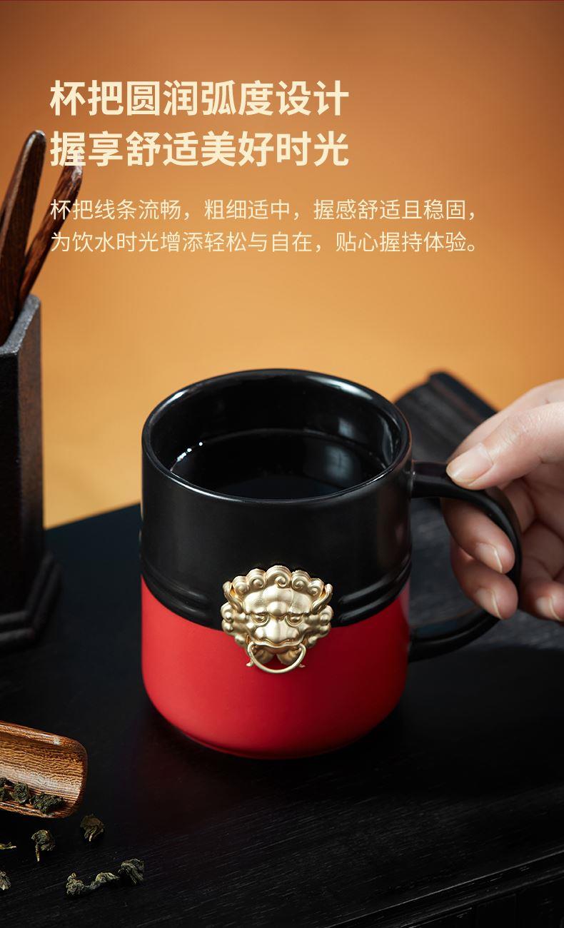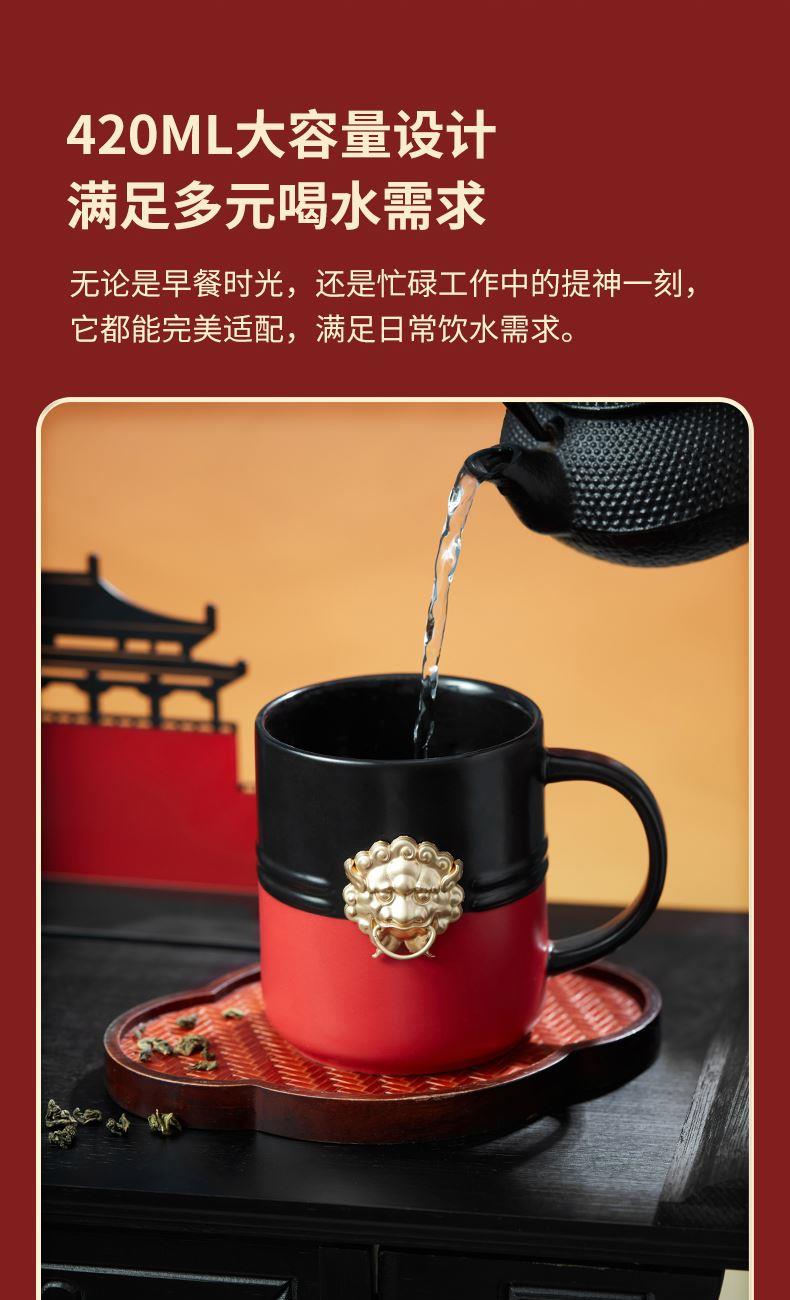 材质:陶瓷 包装:彩盒装 15.5cm*15cm*13.5cm 尺寸:口径9cm*高10.3cm 容量:420ml 包含:陶瓷杯*1 产品卖点 ① 锌合金细腻工艺雕刻,匠心独运尽显风华 ② 以精湛手工双色釉工艺打造,经高温烧制,安全无毒,入口安心 ③ 杯把线条流畅,粗细适中,握感舒适且稳固 ④ 420ML大容量设计,满足多元喝水需求
