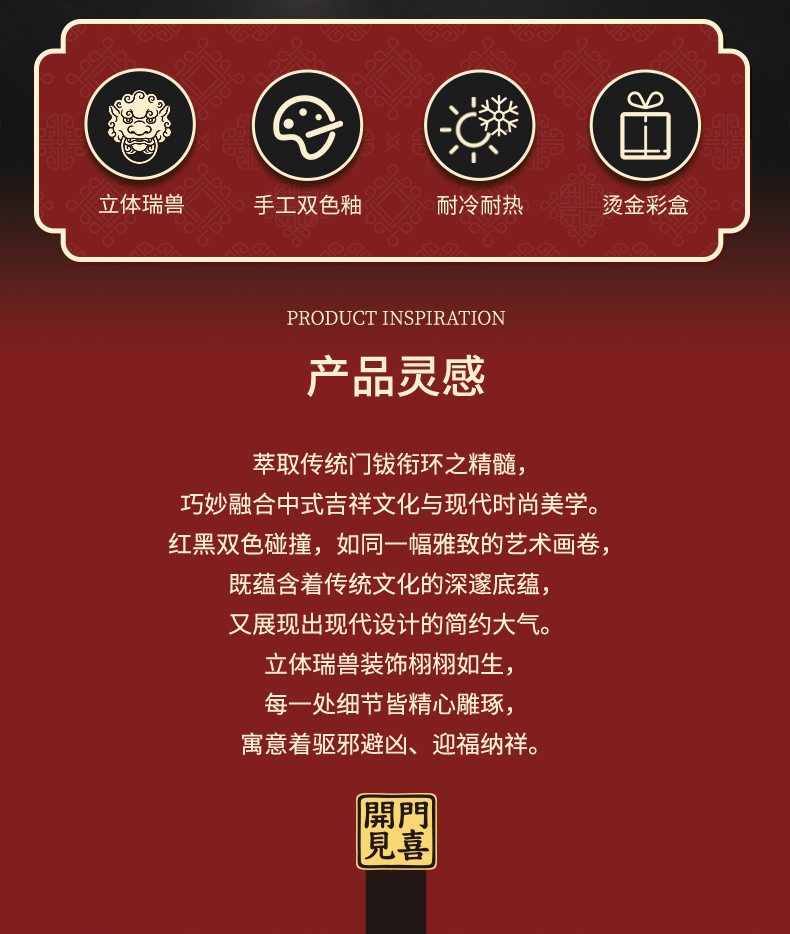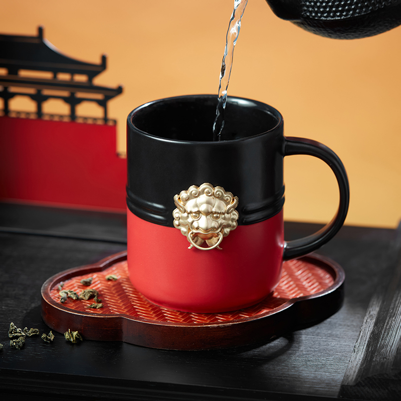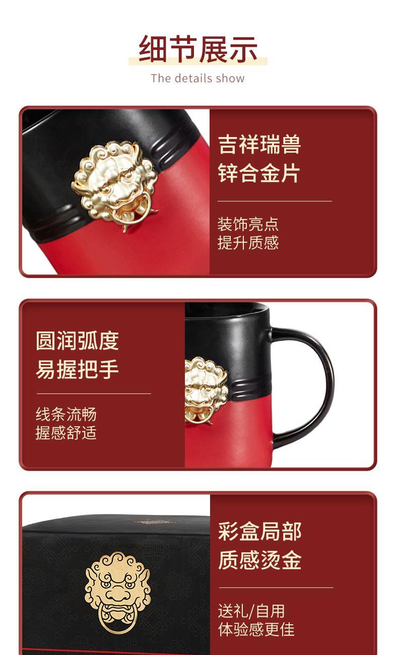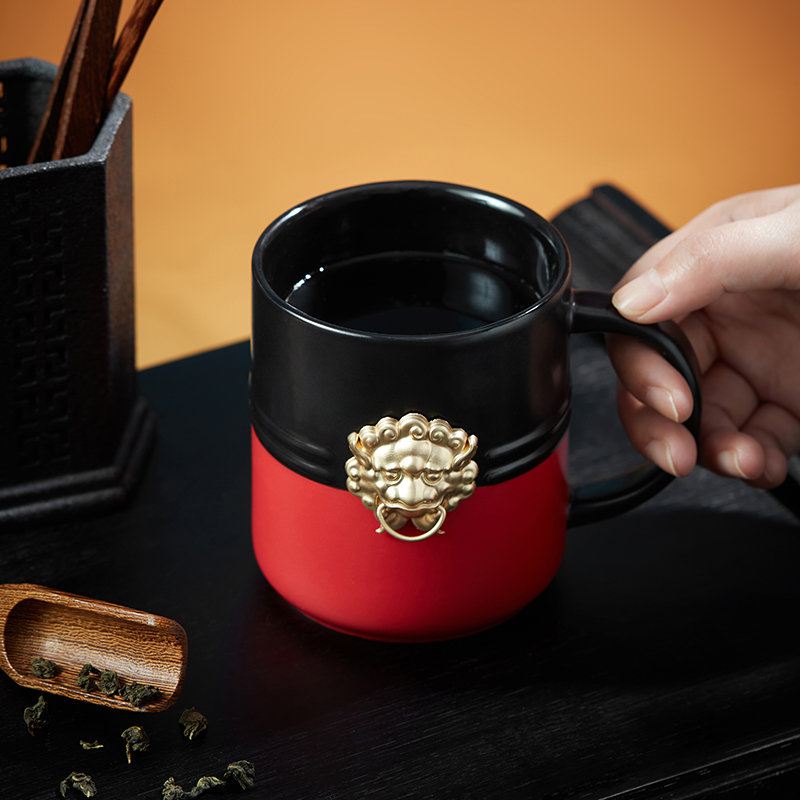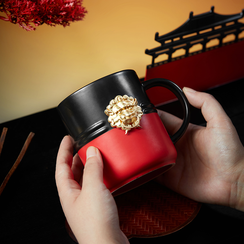 材质:陶瓷 包装:彩盒装 15.5cm*15cm*13.5cm 尺寸:口径9cm*高10.3cm 容量:420ml 包含:陶瓷杯*1 产品卖点 ① 锌合金细腻工艺雕刻,匠心独运尽显风华 ② 以精湛手工双色釉工艺打造,经高温烧制,安全无毒,入口安心 ③ 杯把线条流畅,粗细适中,握感舒适且稳固 ④ 420ML大容量设计,满足多元喝水需求