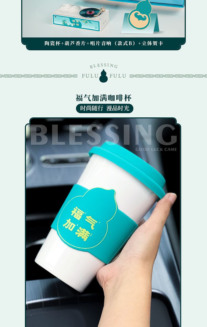 一杯盛满福气,一饰承载安康。「福盈门」新中式礼品套装,用陶瓷咖啡杯传递“福气加满”的祝愿,以葫芦香薰挂件寓意福禄绵长。 福气加满·陶瓷咖啡杯400NML*1 葫芦型扩香石&香薰精油*1 葫芦手提毛毡袋(40cm*48cm*14cm) 精美礼盒(34.8cm*21.8cm*10.7cm) 复古蓝牙音箱*1 主题贺卡*1