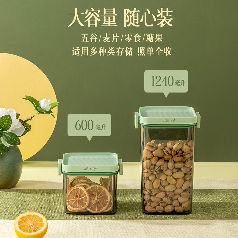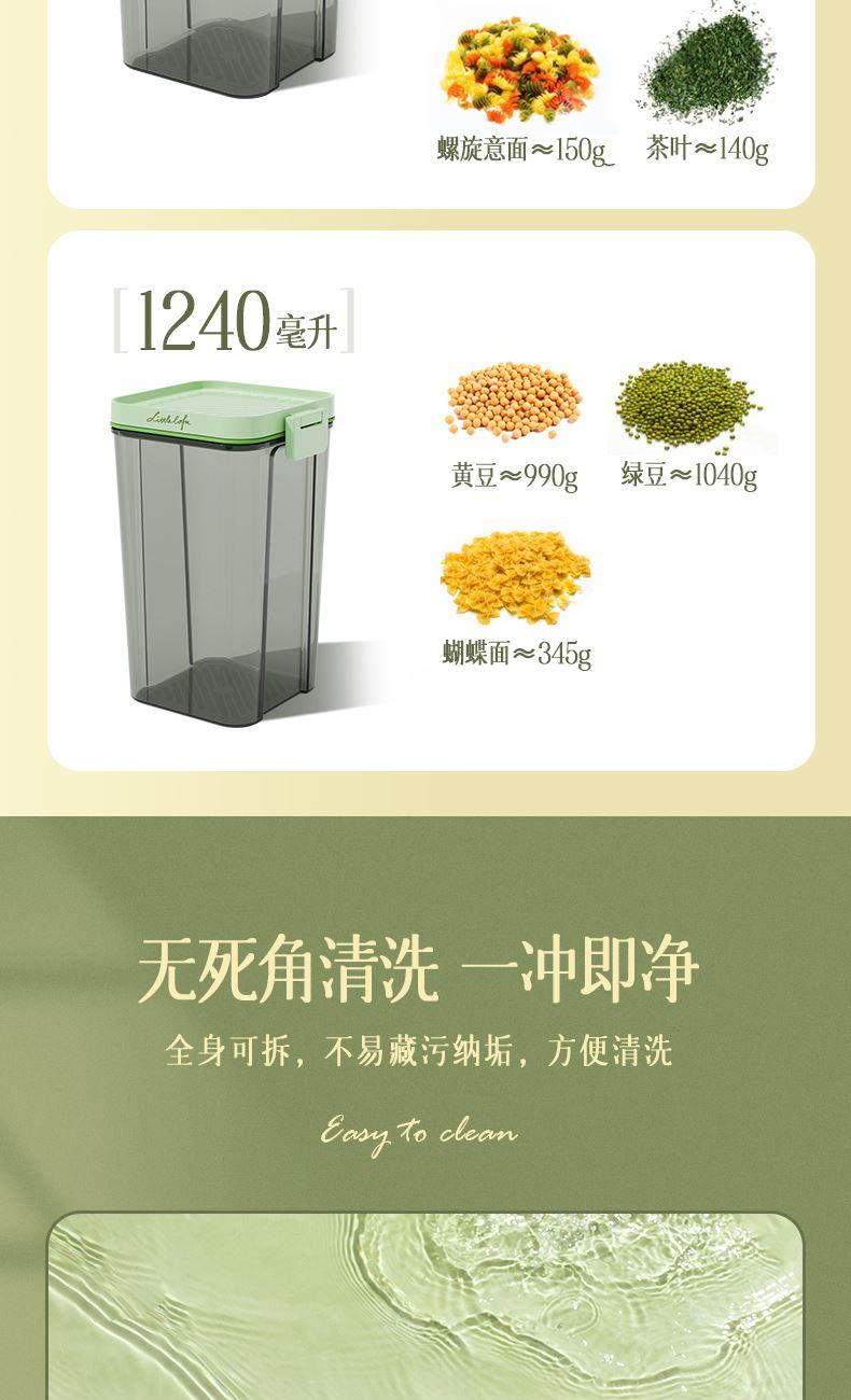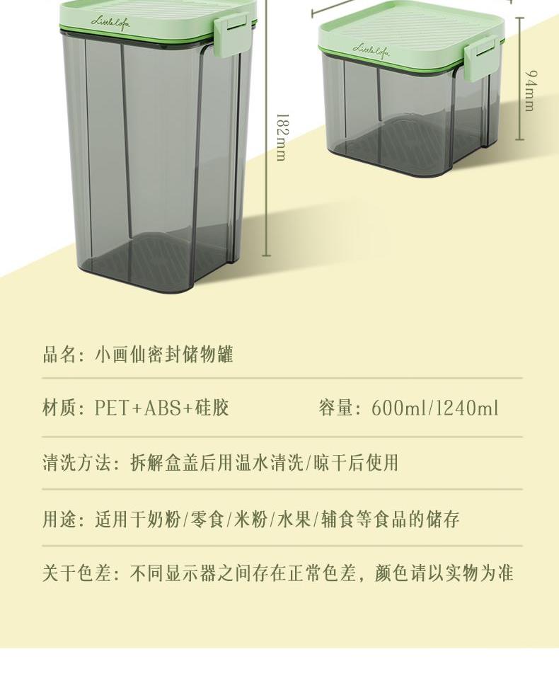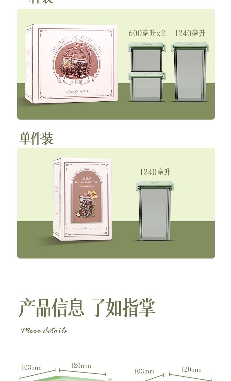 容量:1240+600*2(ml) 颜 色:淡绿色 材 质:pet+abs+硅胶 推荐理由: 彩盒包装,高颜值密封罐,大容量、多种搭配方式,储存你的美好生活。 卖点介绍: 密封防潮,锁住新鲜 配色时尚,简约大方 环保材质,安全健康 配件:标签贴纸