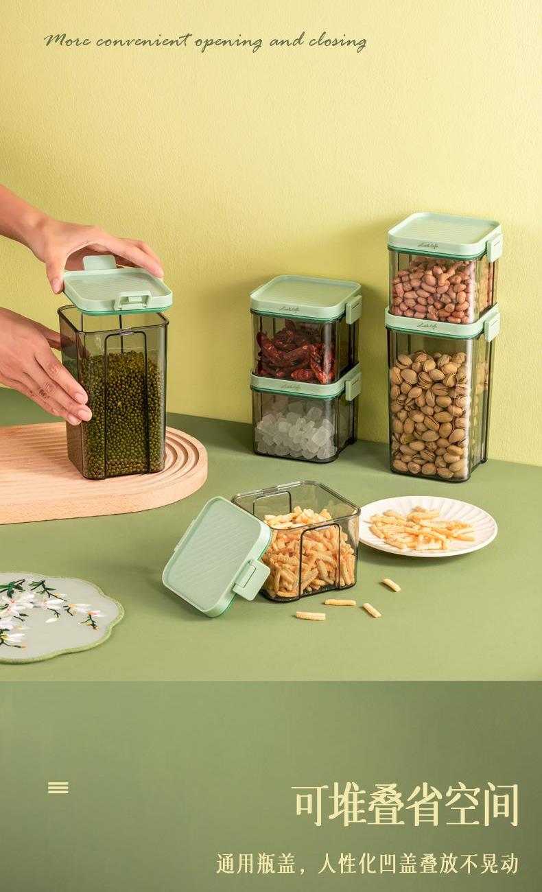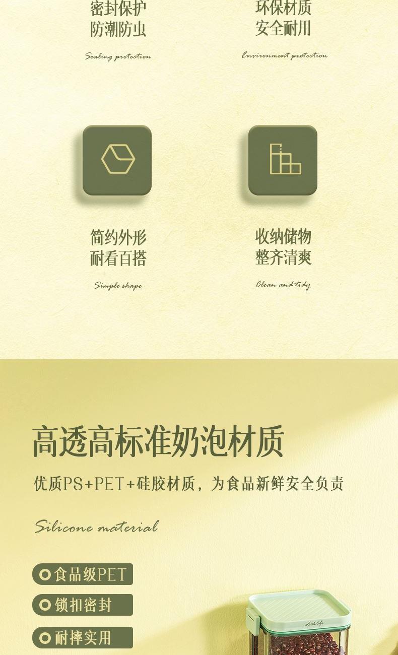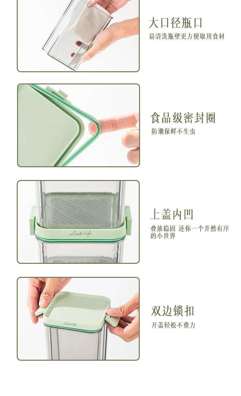 容量:1240+600*2(ml) 颜 色:淡绿色 材 质:pet+abs+硅胶 推荐理由: 彩盒包装,高颜值密封罐,大容量、多种搭配方式,储存你的美好生活。 卖点介绍: 密封防潮,锁住新鲜 配色时尚,简约大方 环保材质,安全健康 配件:标签贴纸