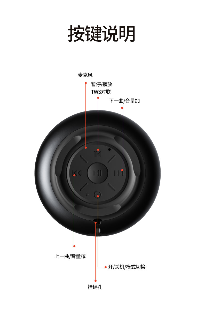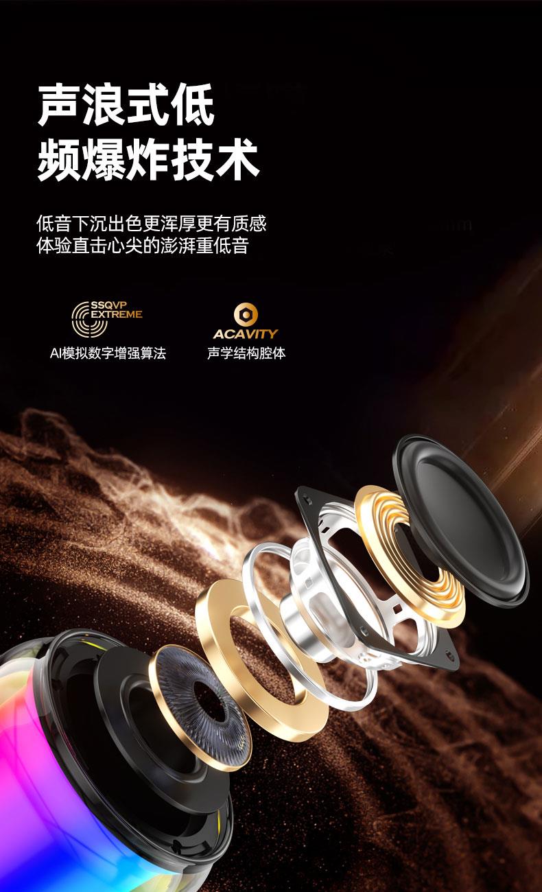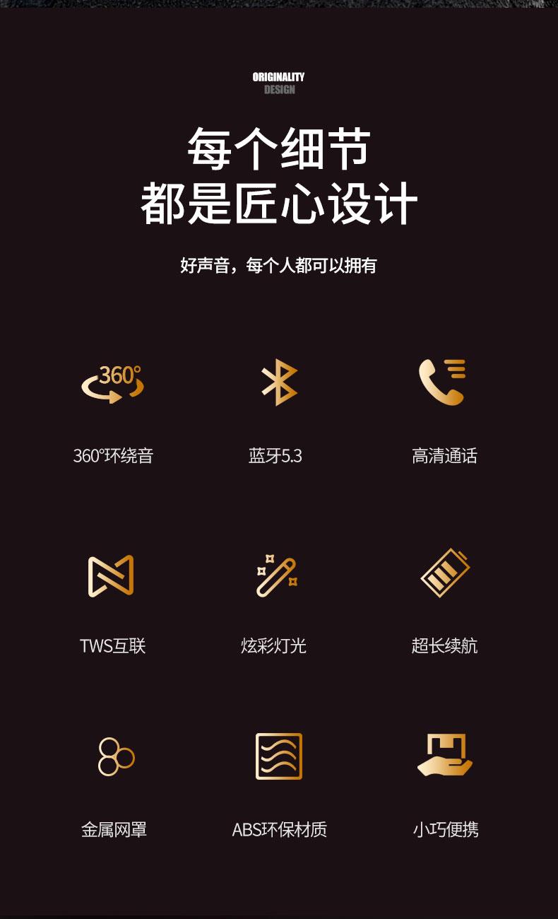 蓝牙版本:5.3 电池容量:500mAh 箱体材质:ABS+铁网 电压:DC 5V/1A 消耗功率:3W 重量:约160g