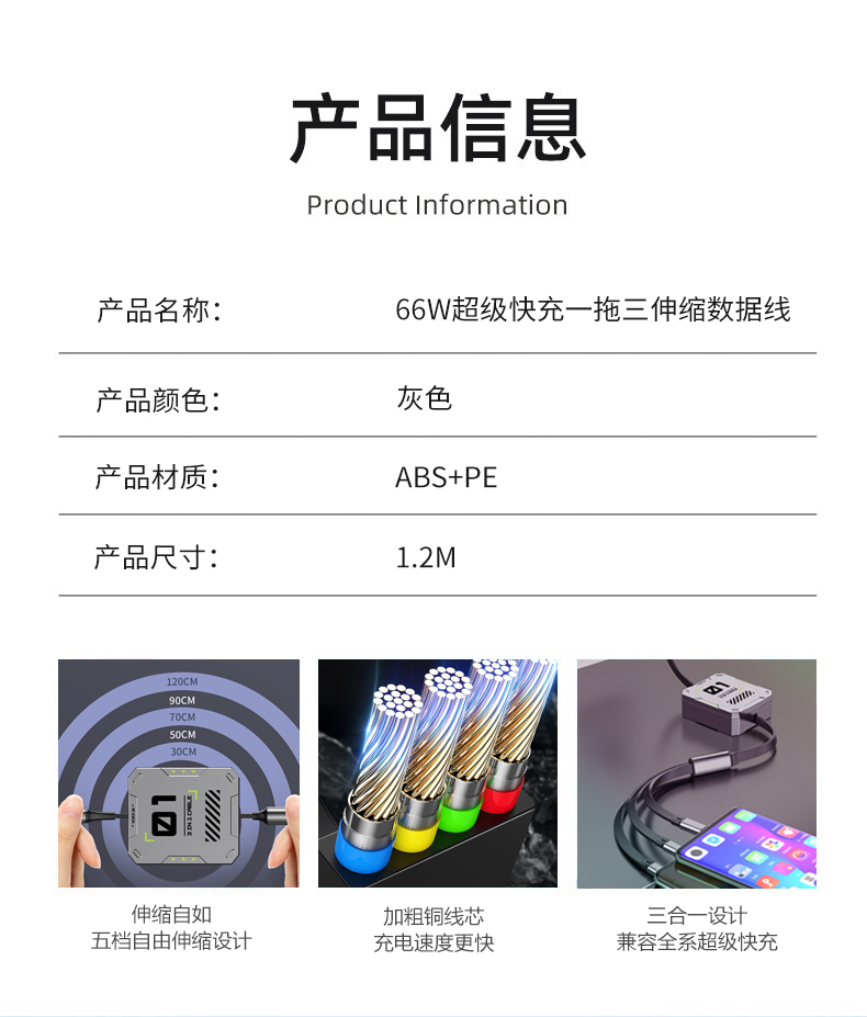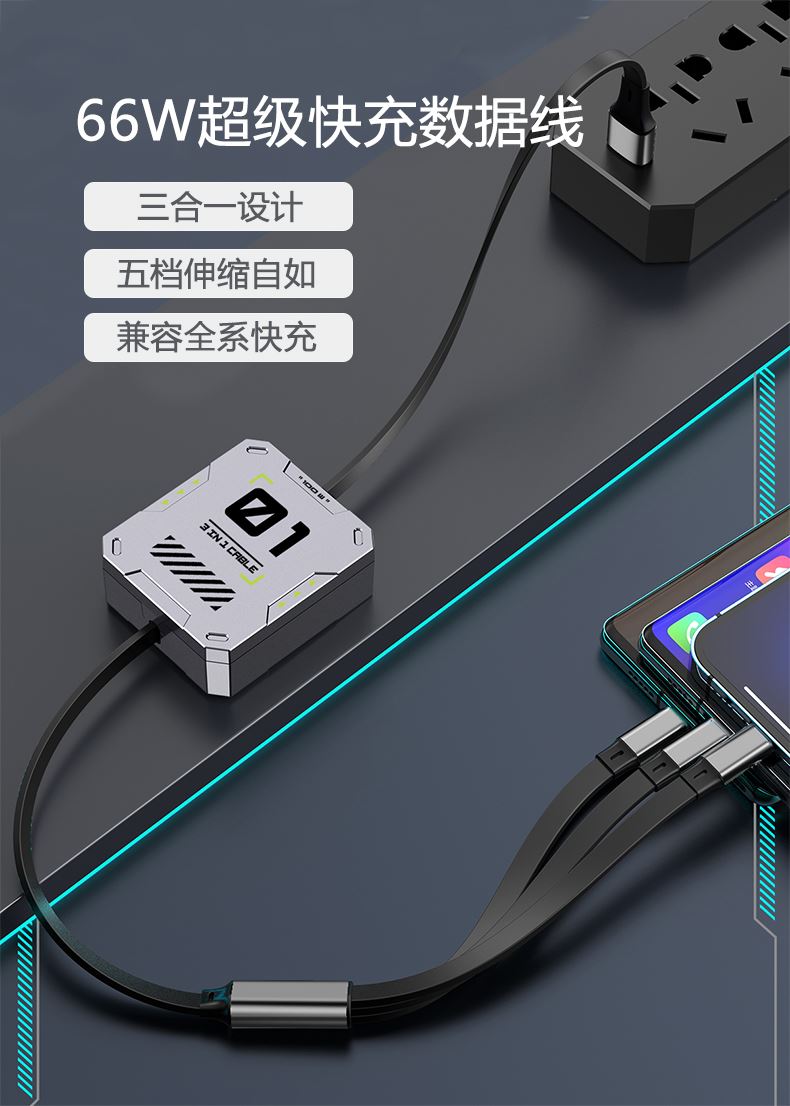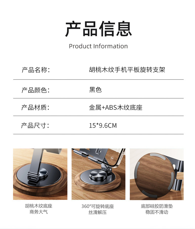 1、商务款手机平板桌面旋转支架 仿黑胡桃木纹 商务大气 360°可旋转金属支架 支撑力强劲,预留充电口位 2、66W超级快充一拖三伸缩数据线 兼容苹果15系列 五档伸缩调节 1.2米长度设计 TPE材质经久耐用 三种充电接口满足各种手机