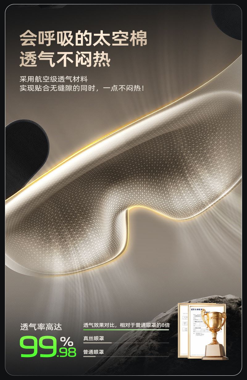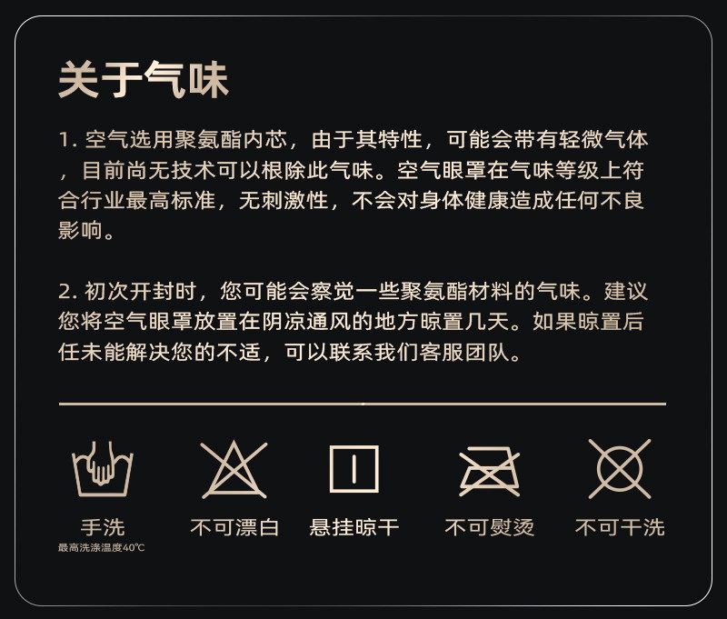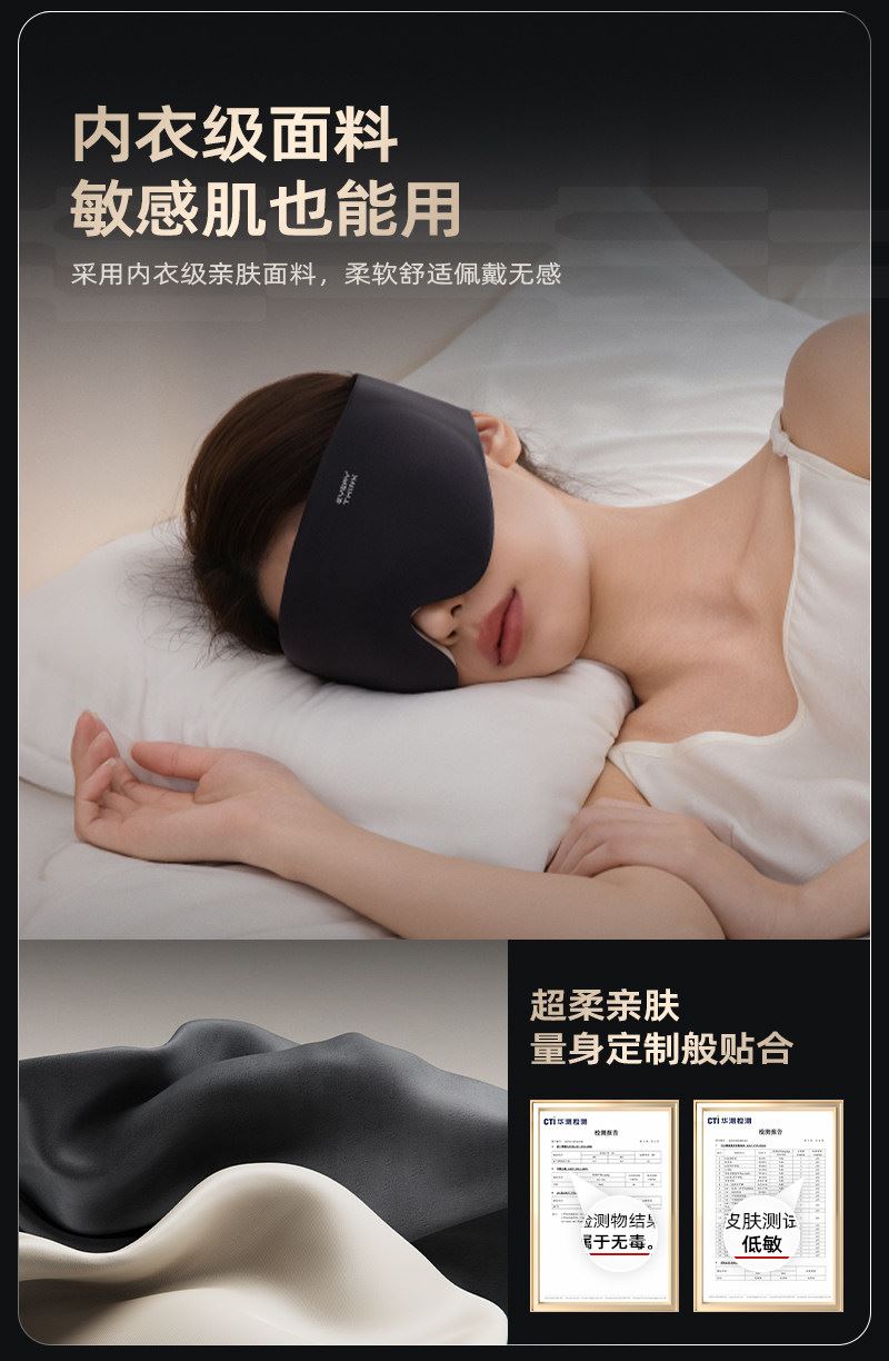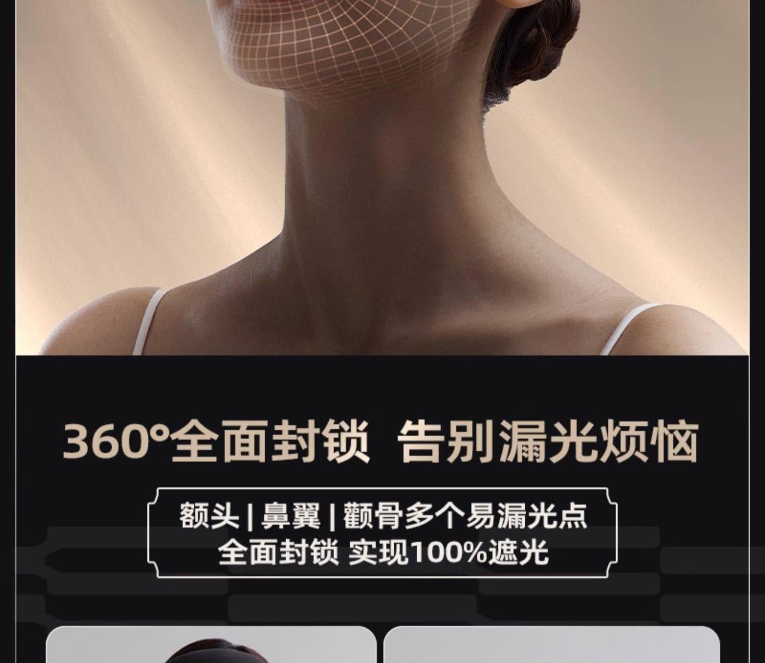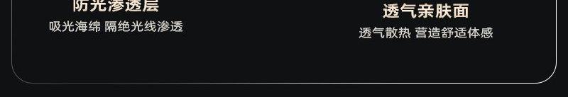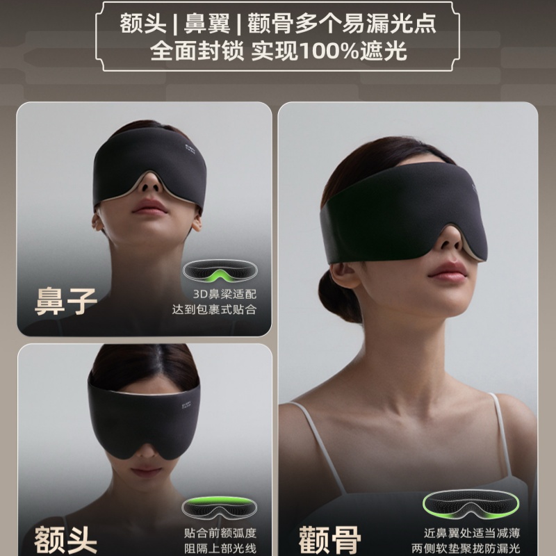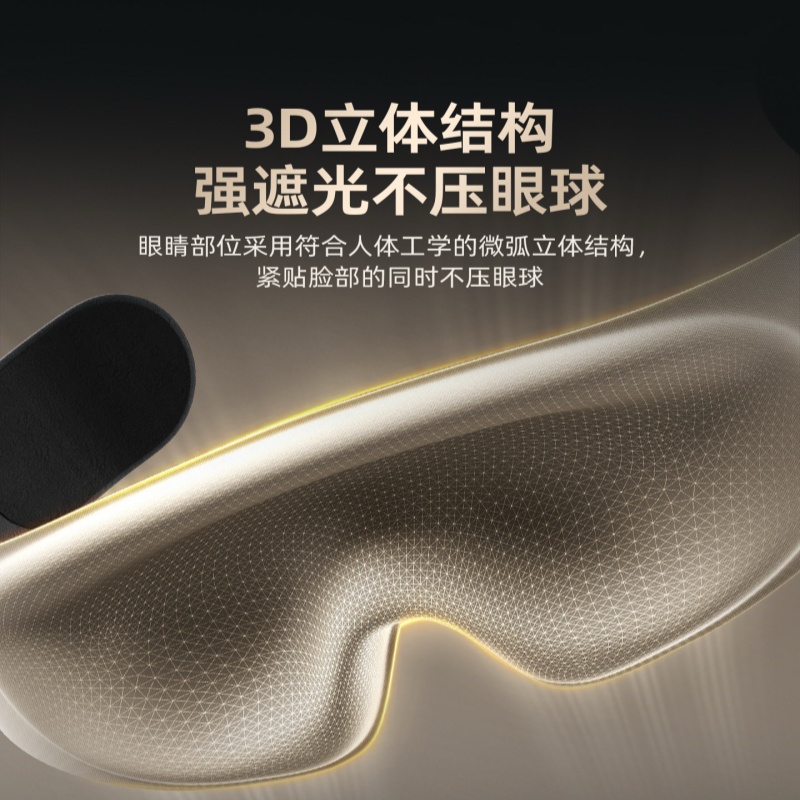 规格: 单台包装尺寸:280*120*40 单台重量:250g(含彩盒) 规格:48台 可选颜色:杏黄色、阑夜黑、豆蔻绿 功能特点: 遮光升级,首创气囊结构更贴合,鼻翼不漏光 舒适升级,3D立体设计,紧密贴合也不压眼睛 佩戴升级,魔术贴设计,一点不勒耳 一秒入夜,告别光污染 采用亲肤面料,柔软舒适佩戴无感 眼睛部位采用符合人体工学的微弧立体结构,做到贴合脸部的同时不压眼球;立体结构避开眼睛和睫毛,不伤眼妆 可收纳成巴掌大小,不占空间,出行便携