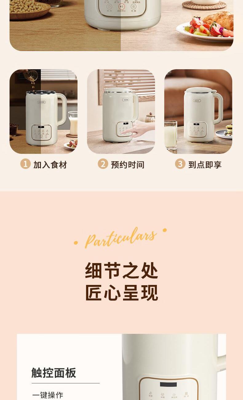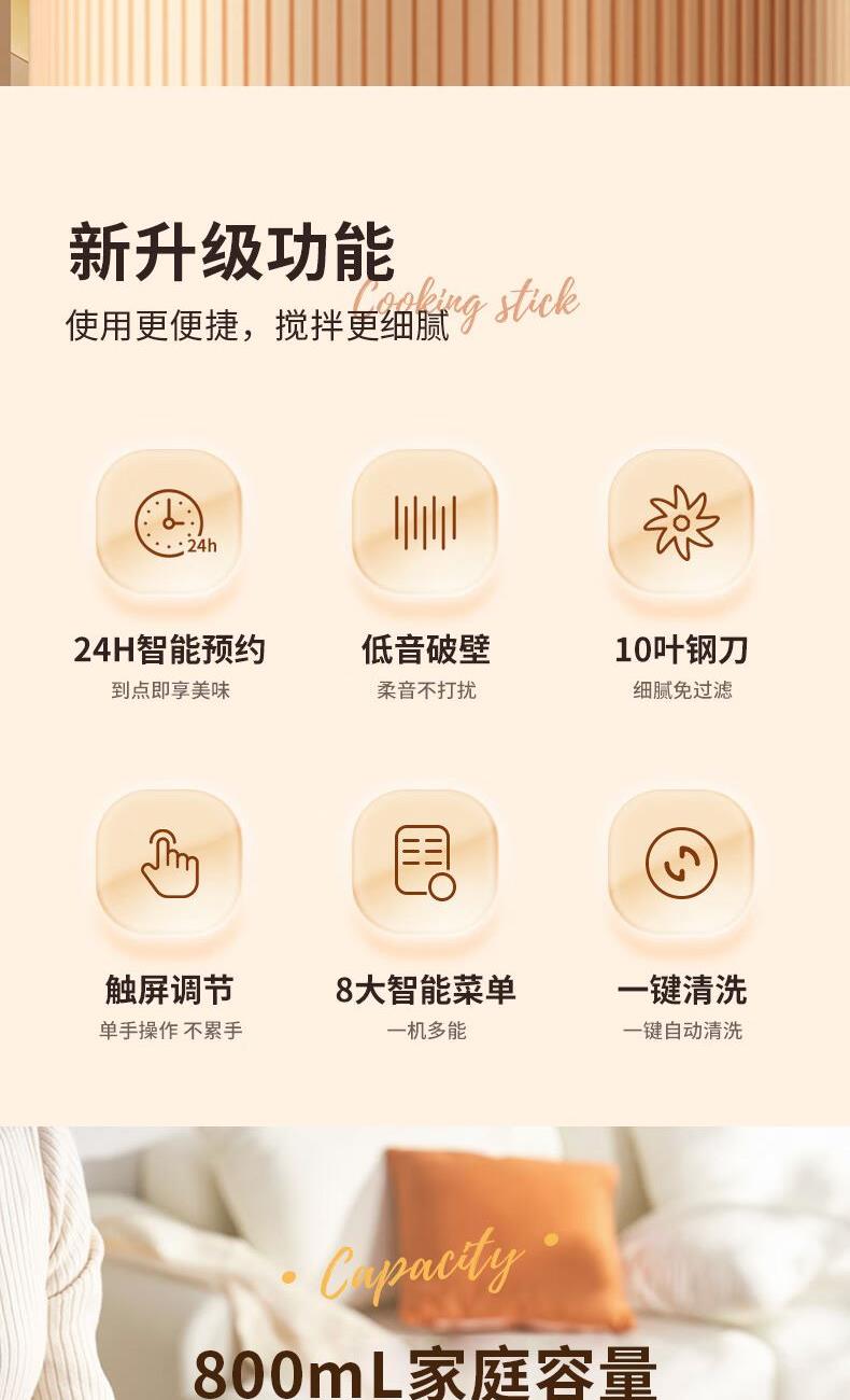 额定电压:220V~ 加热功率:500W 搅拌功率:210W 额定频率:50Hz 材质:内胆材质:304不锈钢,杯盖:PP,密封圈:硅橡胶,刀片、螺丝:304不锈钢 10叶钢刀破壁,干豆免泡直打 食品级304不锈钢杯,入口安心 低分贝降噪,不降口感 触选大屏,花式菜单一目了然 智能预约保温,起床即享