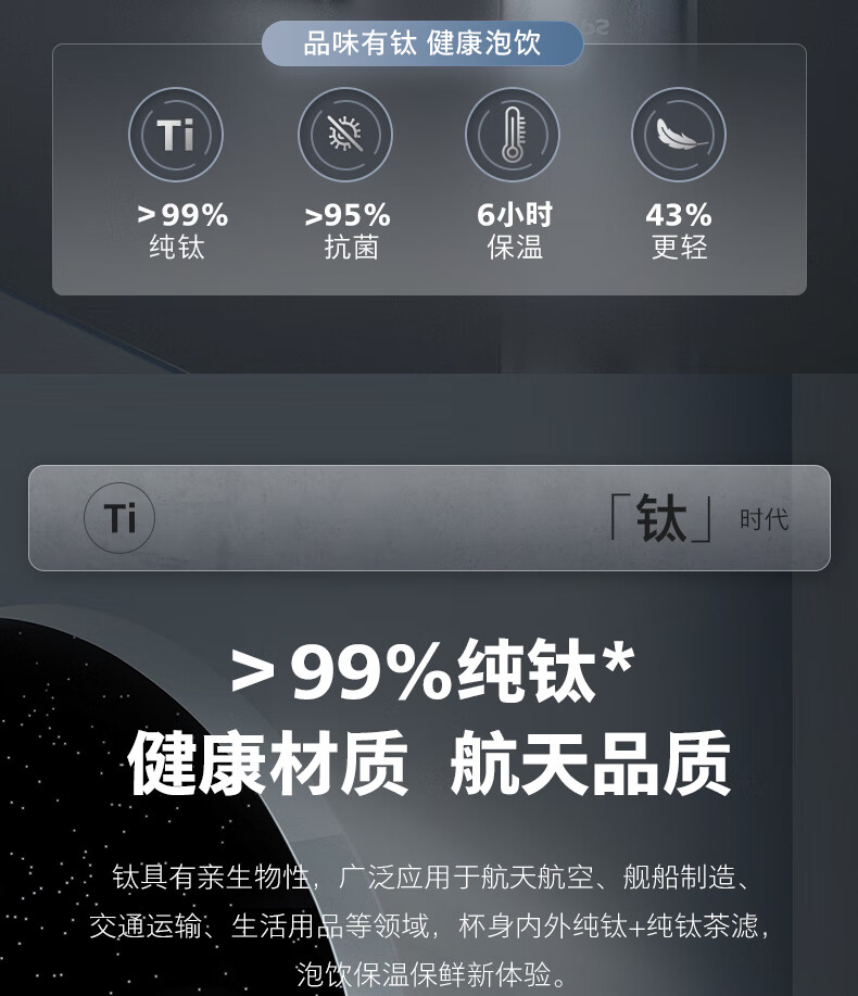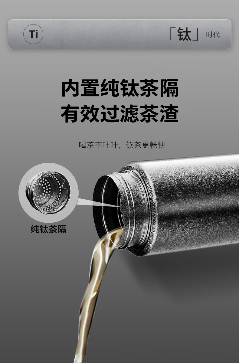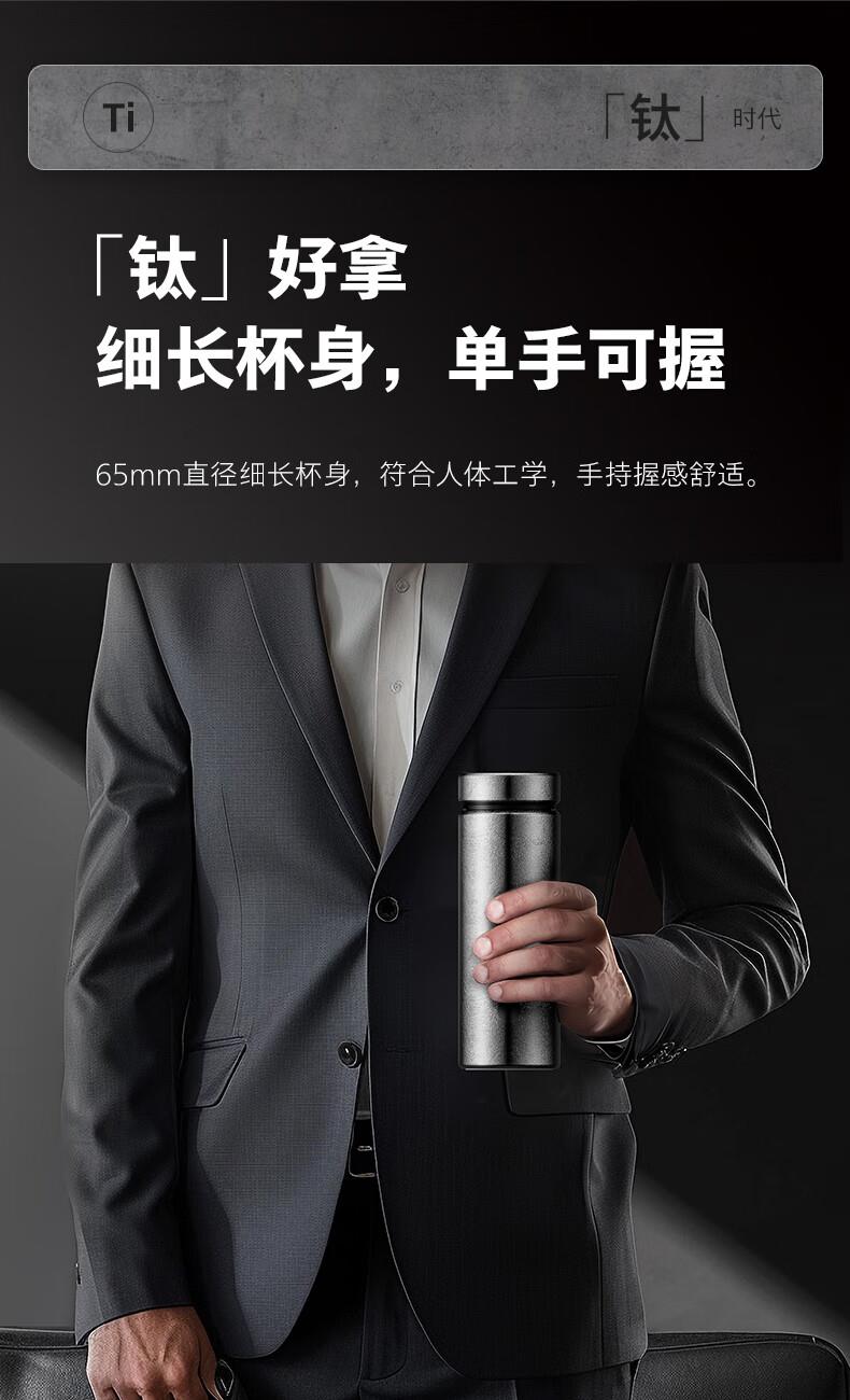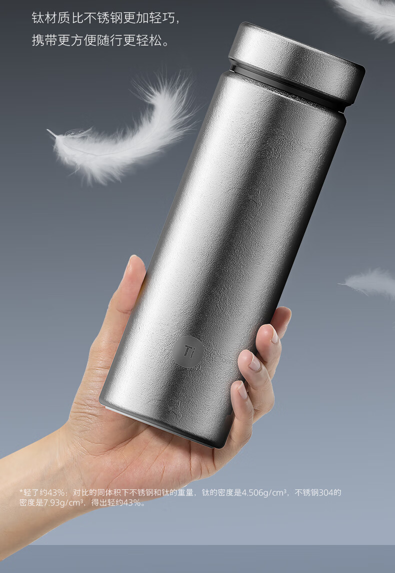 内外纯钛 0涂层、0油漆、不留味 不析出重金属 食品级不含双酚A 轻盈便携 足足轻了约43% 6小时保温锁冷 400ML容量 满足日常饮水需求