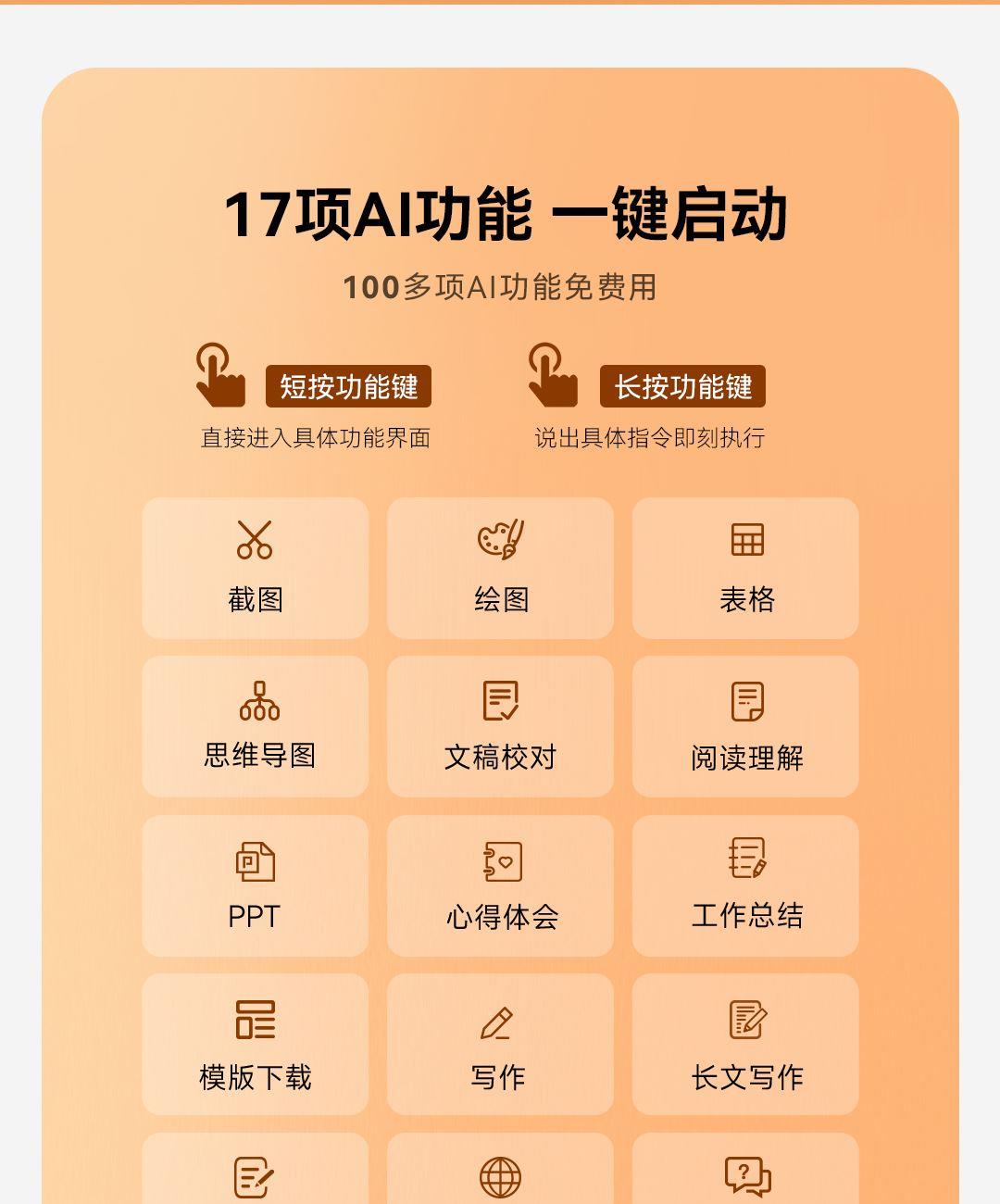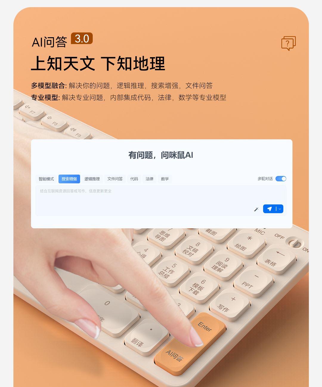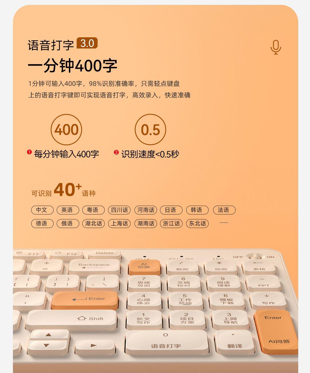 1.材质:ABS 2.搭载AI大模型:搭载9款 AI大模型 3.同时连接设备数量:3台 4.连接方式:无线2.4G 蓝牙 5.兼容系统:兼容多系统 6.按键数:91-100键 7.供电方式:充电电池 8.电池容量450mAh 1.搭载Deepseek-R1模型6大通用模型+3大专业模型 2.AI问答 3.0 上知天文 下知地理 3.AI写作 3.0写有用的文章 4.AI PPT 3.0 做专业的PPT 5.AI绘图3.0绘专业的图片 6.AI智能体 3.0 解决专业问题更轻松 7.AI 3.0表格做全面的表格 8.AI 3.0 表格做全面的表格 9.语音打字3.0 一分钟400字 10.语音打字3.0 一分钟400字 1.AI截图 3.0一键截图提取 轻松编辑 12.双模更便利 13. 多系统兼容