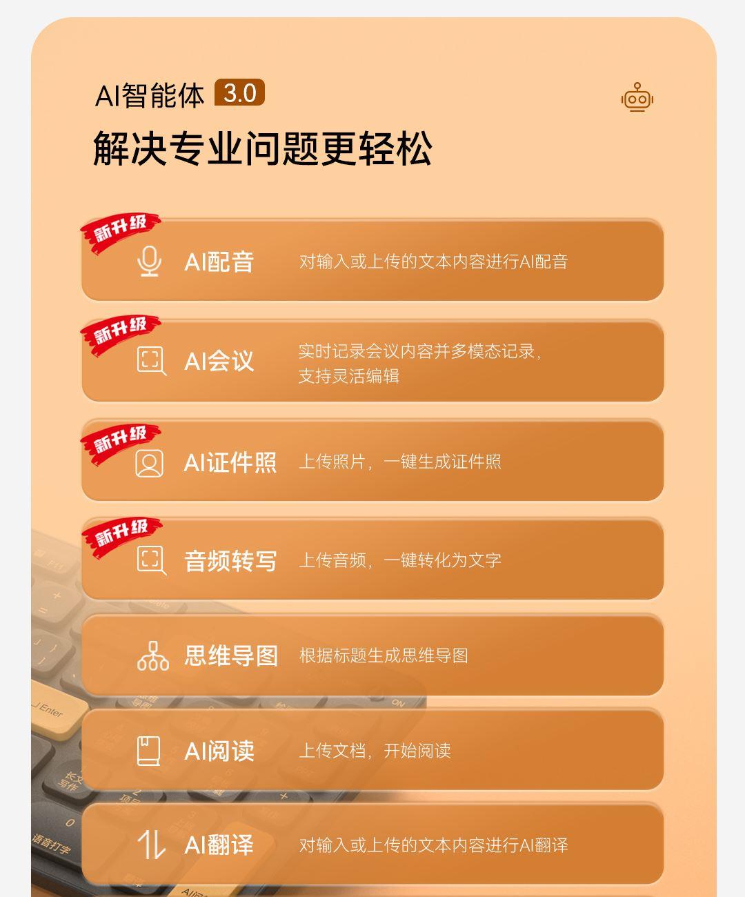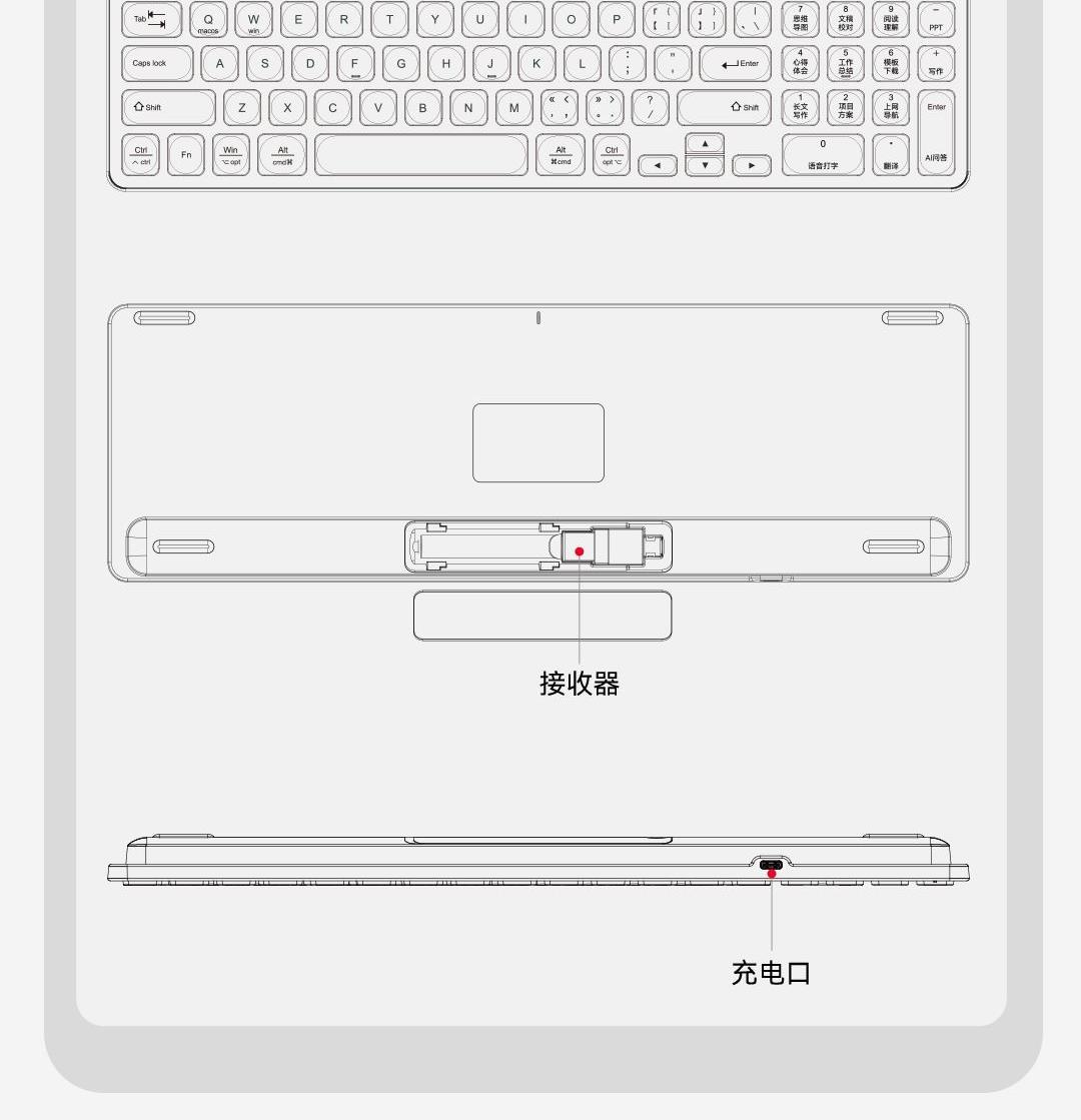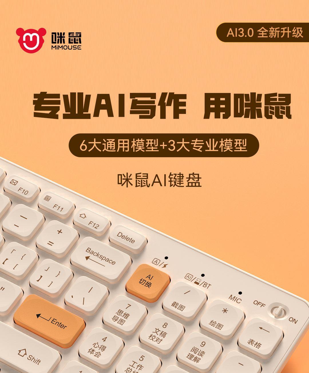 1.材质:ABS 2.搭载AI大模型:搭载9款 AI大模型 3.同时连接设备数量:3台 4.连接方式:无线2.4G 蓝牙 5.兼容系统:兼容多系统 6.按键数:91-100键 7.供电方式:充电电池 8.电池容量450mAh 1.搭载Deepseek-R1模型6大通用模型+3大专业模型 2.AI问答 3.0 上知天文 下知地理 3.AI写作 3.0写有用的文章 4.AI PPT 3.0 做专业的PPT 5.AI绘图3.0绘专业的图片 6.AI智能体 3.0 解决专业问题更轻松 7.AI 3.0表格做全面的表格 8.AI 3.0 表格做全面的表格 9.语音打字3.0 一分钟400字 10.语音打字3.0 一分钟400字 1.AI截图 3.0一键截图提取 轻松编辑 12.双模更便利 13. 多系统兼容