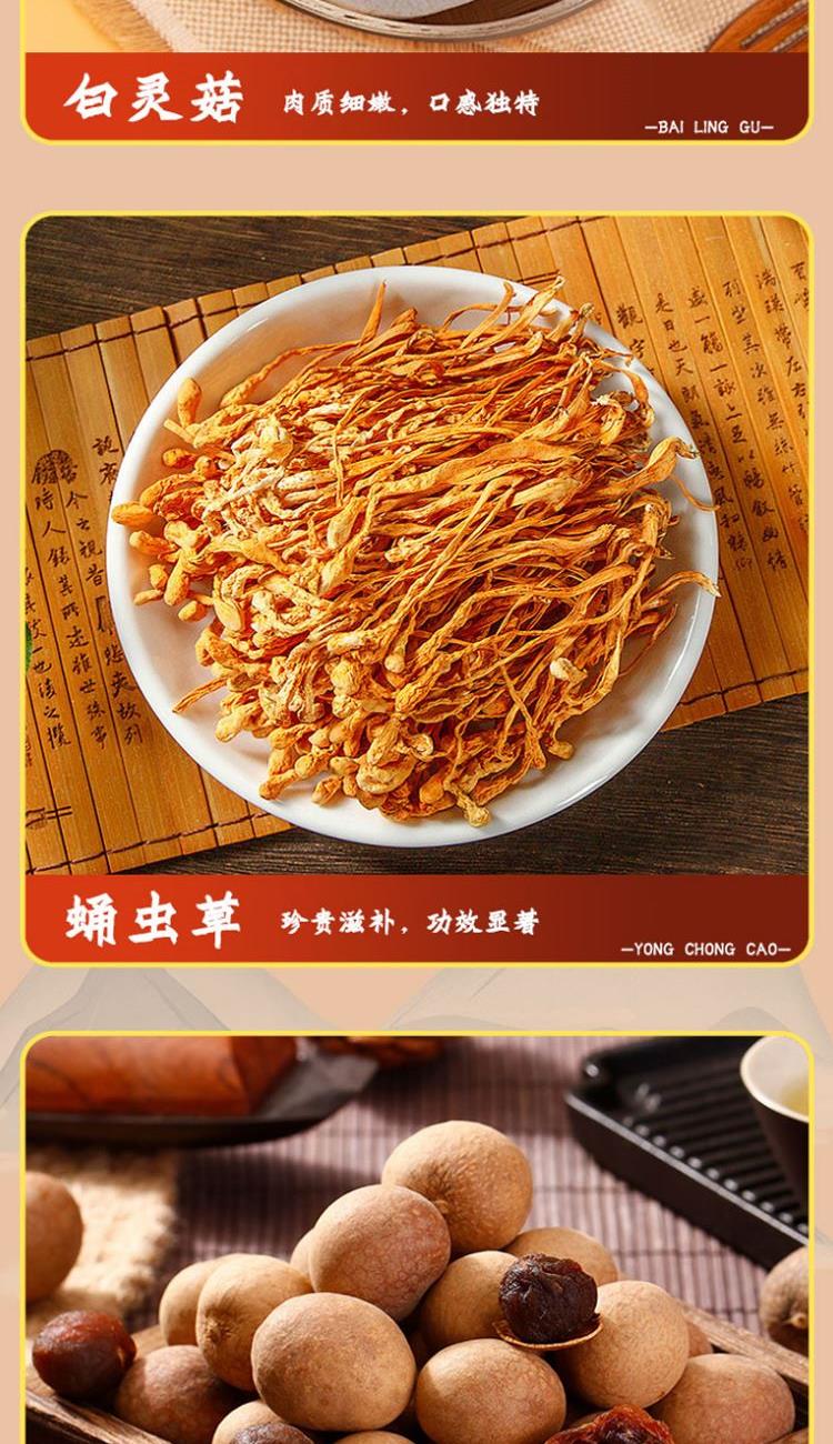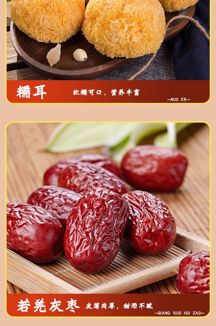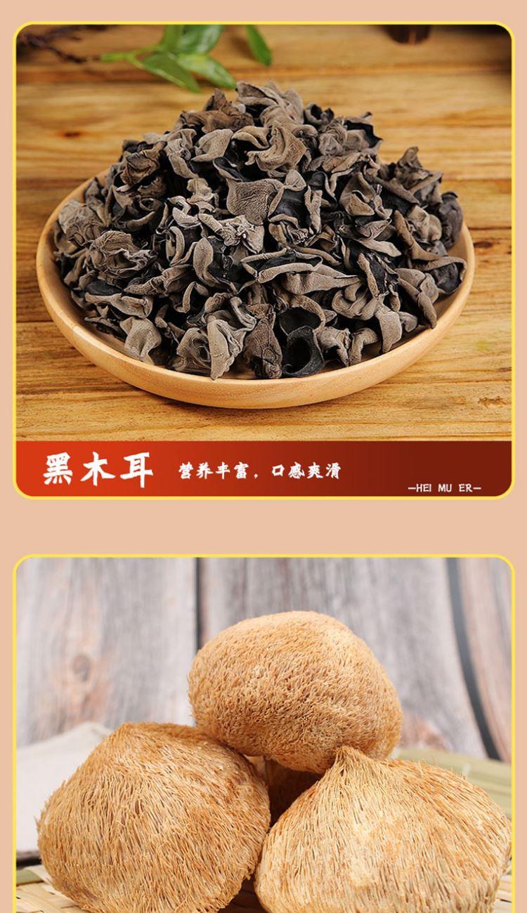 配置: 精选黑木耳100g/精选猴头菇100g/精选鲍鱼菇150g/精选杏鲍菇150g/精选香菇100g/精选桂圆250g 净重:850g 简介:山珍尊品,品质礼盒,常年品质坚守,只为美味如初。得天独厚的生长环境,深山孕育,自然采摘,采摘到成品,全程放心无污染。原生态,真滋补,无硫无添,自然晾晒,营养搭配。人工挑选,菇体肥大,肉感厚实,口感脆嫩,汤汁色泽棕黄清澈。