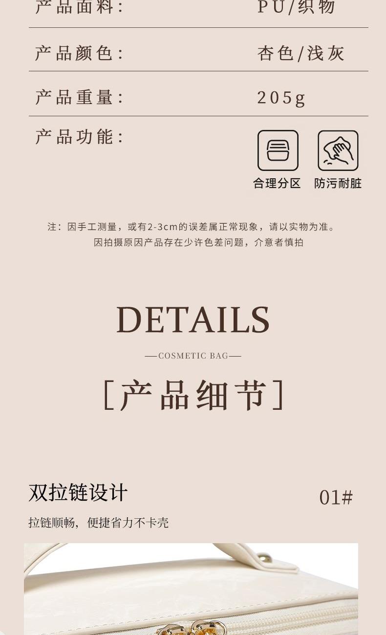 吊牌价:230元 适用场景:日常生活、旅行、差旅 上市时间:2025年秋季 类别:洗漱包 适用人群:男女通用 材质:织物 尺寸:长23.5宽10.5高11cm 包袋大小:小包 颜色分类:杏色/浅灰