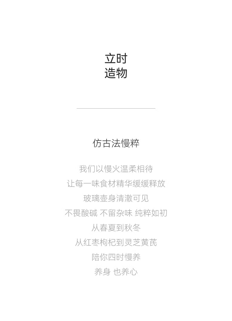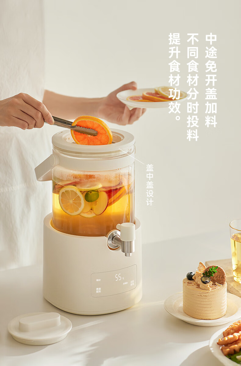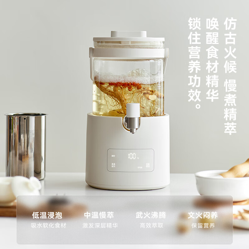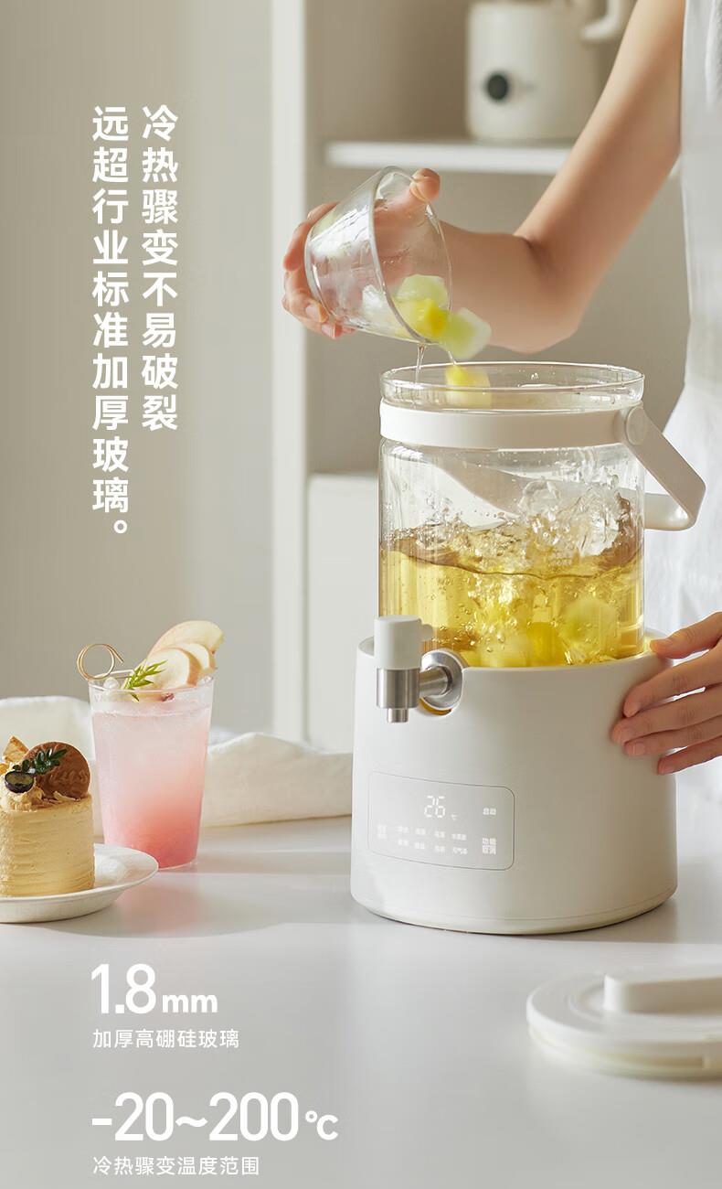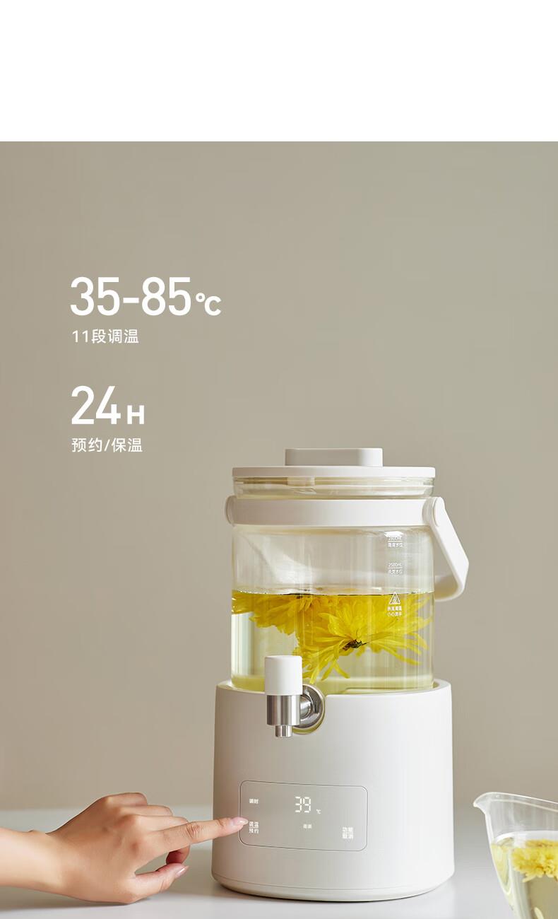颜色:陶白色 重量:3.5kg 容量:2.8L 额定功率:1000W 产品尺寸:187*203*340mm 包装尺寸:442*250*259mm 条码 : 6977735713120 1. 0涂层全玻璃,无缝一体式壶身 2. 104mmMAX加大304不锈钢滤网 3. 盖中盖设计,中途加料更方便 4. 1.8mm加厚高硼硅玻璃 5. 分体式设计,免提取水 ,一拧即出 6. 35-85°C 11段调温,24H持久保温